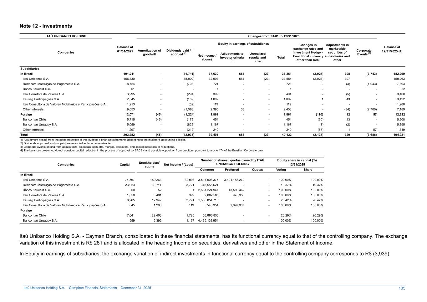 Itaú Unibanco Holding S.A. – Complete Financial Statements – December 31, 2025 Note 12 - Investments ITAÚ UNIBANCO HOLDING Balance at Changes from 01/01 to 12/31/2025 Balance at Companies Amortization of goodwill Dividends paid / accrued (2) Equity in earnings of subsidiaries Changes in exchange rates and Investment Hedge - Functional currency other than Real Adjustments in marketable securities of subsidiaries and other Corporate Events (3) 01/01/2025 Net Income / (Loss) Adjustments to investor criteria (1) Unrealized results and other Total 12/31/2025 (4) Subsidiaries In Brazil 191,211 - (41,711) 37,630 654 (23) 38,261 (2,027) 308 (3,743) 182,299 Itaú Unibanco S.A. 166,330 - (38,900) 32,993 584 (23) 33,554 (2,028) 307 - 159,263 Redecard Instituição de Pagamento S.A. 8,724 - (708) 721 2 - 723 - (3) (1,043) 7,693 Banco Itaucard S.A. 51 - - 1 - - 1 - - - 52 Itaú Corretora de Valores S.A. 3,295 - (294) 399 5 - 404 - (5) - 3,400 Itauseg Participações S.A. 2,545 - (169) 1,002 - - 1,002 1 43 - 3,422 Itaú Consultoria de Valores Mobiliários e Participações S.A. 1,213 - (52) 119 - - 119 - - - 1,280 Other interests 9,053 - (1,588) 2,395 63 - 2,458 - (34) (2,700) 7,189 Foreign 12,071 (45) (1,224) 1,861 - - 1,861 (110) 12 57 12,622 Banco Itaú Chile 5,715 (45) (179) 454 - - 454 (50) 13 - 5,908 Banco Itaú Uruguay S.A. 5,059 - (826) 1,167 - - 1,167 (3) (2) - 5,395 Other interests 1,297 - (219) 240 - - 240 (57) 1 57 1,319 Total 203,282 (45) (42,935) 39,491 654 (23) 40,122 (2,137) 320 (3,686) 194,921 1) Adjustment arising from the standardization of the investee’s financial statements according to the investor’s accounting policies. 2) Dividends approved and not paid are recorded as Income receivable. 3) Corporate events arising from acquisitions, disposals, spin-offs, merges, takeovers, and capital increases or reductions. 4) The balances presented do not consider capital reduction in the process of approval by BACEN and possible opposition from creditors, pursuant to article 174 of the Brazilian Corporate Law. Companies Capital Stockholders’ equity Net Income / (Loss) Number of shares / quotas owned by ITAÚ UNIBANCO HOLDING Equity share in capital (%) 12/31/2025 Common Preferred Quotas Voting Share In Brazil Itaú Unibanco S.A. 74,567 159,263 32,993 3,514,908,377 3,404,188,272 - 100.00% 100.00% Redecard Instituição de Pagamento S.A. 23,923 39,711 3,721 348,555,621 - - 19.37% 19.37% Banco Itaucard S.A. 50 52 1 2,531,224,947 13,593,462 - 100.00% 100.00% Itaú Corretora de Valores S.A. 1,650 3,401 399 32,882,585 970,956 - 100.00% 100.00% Itauseg Participações S.A. 6,965 12,947 3,791 1,583,854,716 - - 26.42% 26.42% Itaú Consultoria de Valores Mobiliários e Participações S.A. 645 1,280 119 548,954 1,097,907 - 100.00% 100.00% Foreign Banco Itaú Chile 17,641 22,463 1,725 56,896,856 - - 26.29% 26.29% Banco Itaú Uruguay S.A. 559 5,392 1,167 4,465,133,954 - - 100.00% 100.00% Itaú Unibanco Holding S.A. - Cayman Branch, consolidated in these financial statements, has its functional currency equal to that of the controlling company. The exchange variation of this investment is R$ 281 and is allocated in the heading Income on securities, derivatives and other in the Statement of Income. In Equity in earnings of subsidiaries, the exchange variation of indirect investments in functional currency equal to the controlling company corresponds to R$ (3,939). 105