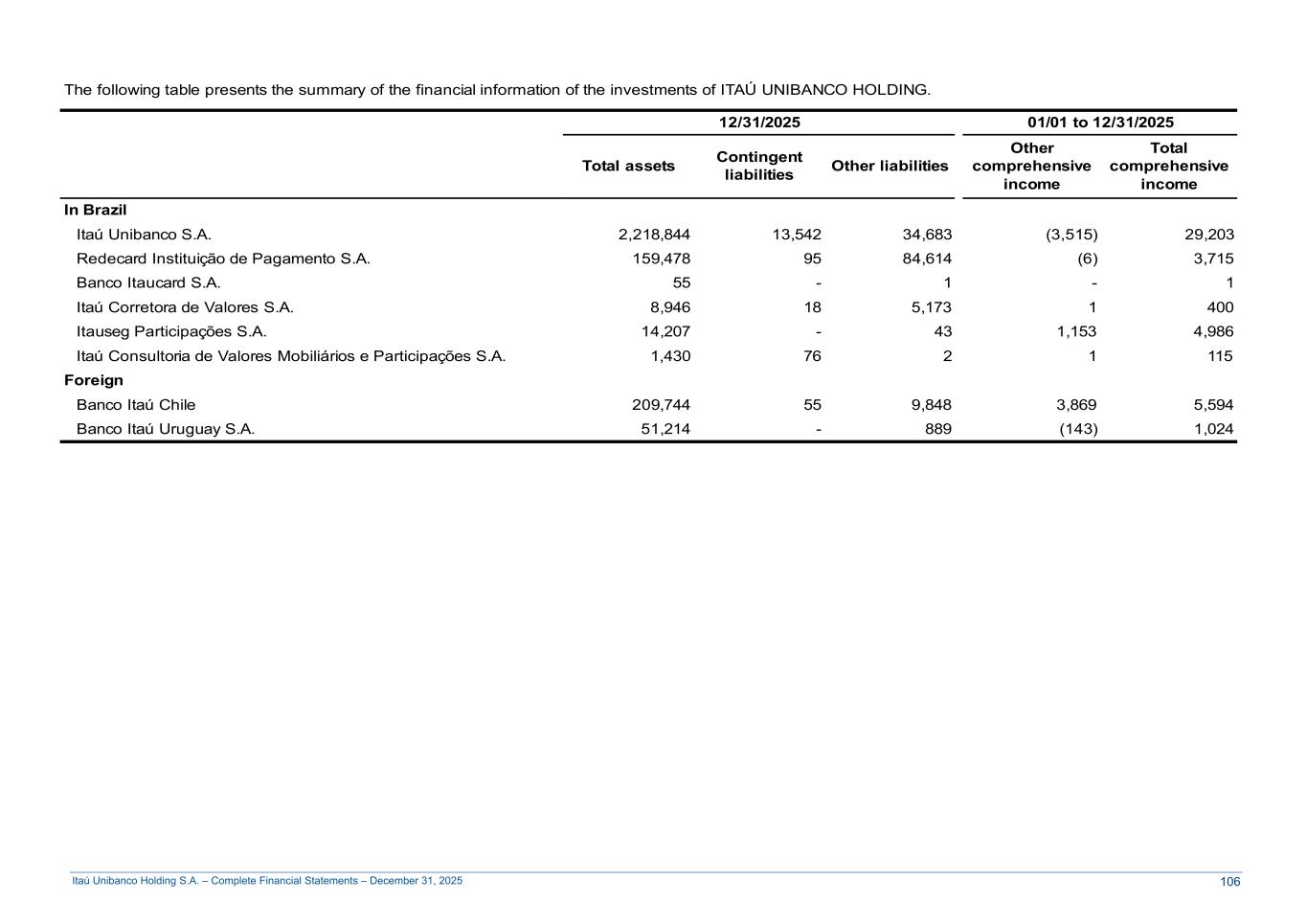 Itaú Unibanco Holding S.A. – Complete Financial Statements – December 31, 2025 The following table presents the summary of the financial information of the investments of ITAÚ UNIBANCO HOLDING. 12/31/2025 01/01 to 12/31/2025 Total assets Contingent liabilities Other liabilities Other comprehensive income Total comprehensive income In Brazil Itaú Unibanco S.A. 2,218,844 13,542 34,683 (3,515) 29,203 Redecard Instituição de Pagamento S.A. 159,478 95 84,614 (6) 3,715 Banco Itaucard S.A. 55 - 1 - 1 Itaú Corretora de Valores S.A. 8,946 18 5,173 1 400 Itauseg Participações S.A. 14,207 - 43 1,153 4,986 Itaú Consultoria de Valores Mobiliários e Participações S.A. 1,430 76 2 1 115 Foreign Banco Itaú Chile 209,744 55 9,848 3,869 5,594 Banco Itaú Uruguay S.A. 51,214 - 889 (143) 1,024 106