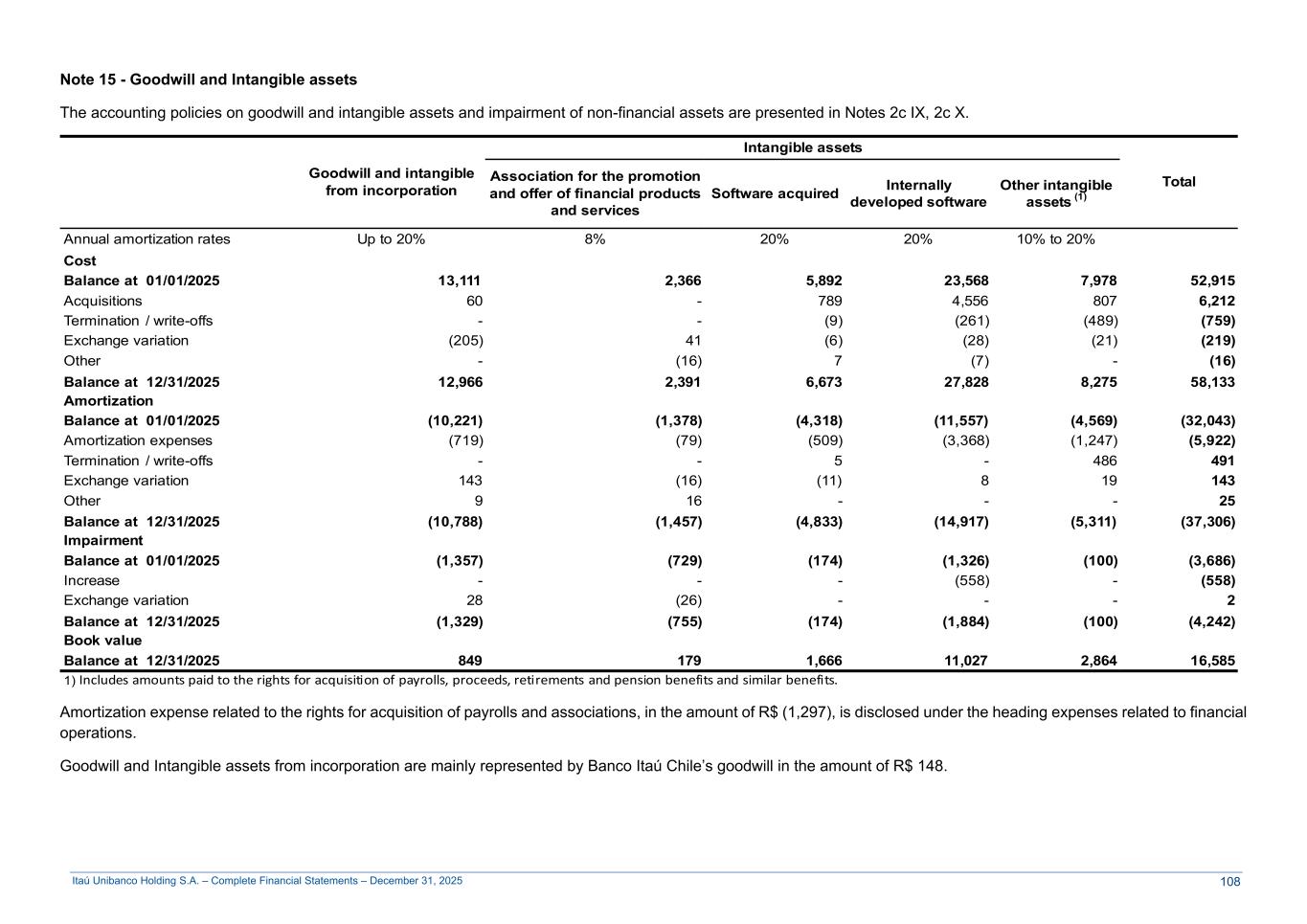 Itaú Unibanco Holding S.A. – Complete Financial Statements – December 31, 2025 Note 15 - Goodwill and Intangible assets The accounting policies on goodwill and intangible assets and impairment of non-financial assets are presented in Notes 2c IX, 2c X. Goodwill and intangible from incorporation Intangible assets TotalAssociation for the promotion and offer of financial products and services Software acquired Internally developed software Other intangible assets (1) Annual amortization rates Up to 20% 8% 20% 20% 10% to 20% Cost Balance at 01/01/2025 13,111 2,366 5,892 23,568 7,978 52,915 Acquisitions 60 - 789 4,556 807 6,212 Termination / write-offs - - (9) (261) (489) (759) Exchange variation (205) 41 (6) (28) (21) (219) Other - (16) 7 (7) - (16) Balance at 12/31/2025 12,966 2,391 6,673 27,828 8,275 58,133 Amortization Balance at 01/01/2025 (10,221) (1,378) (4,318) (11,557) (4,569) (32,043) Amortization expenses (719) (79) (509) (3,368) (1,247) (5,922) Termination / write-offs - - 5 - 486 491 Exchange variation 143 (16) (11) 8 19 143 Other 9 16 - - - 25 Balance at 12/31/2025 (10,788) (1,457) (4,833) (14,917) (5,311) (37,306) Impairment Balance at 01/01/2025 (1,357) (729) (174) (1,326) (100) (3,686) Increase - - - (558) - (558) Exchange variation 28 (26) - - - 2 Balance at 12/31/2025 (1,329) (755) (174) (1,884) (100) (4,242) Book value Balance at 12/31/2025 849 179 1,666 11,027 2,864 16,585 1) Includes amounts paid to the rights for acquisition of payrolls, proceeds, retirements and pension benefits and similar benefits. Amortization expense related to the rights for acquisition of payrolls and associations, in the amount of R$ (1,297), is disclosed under the heading expenses related to financial operations. Goodwill and Intangible assets from incorporation are mainly represented by Banco Itaú Chile’s goodwill in the amount of R$ 148. 108