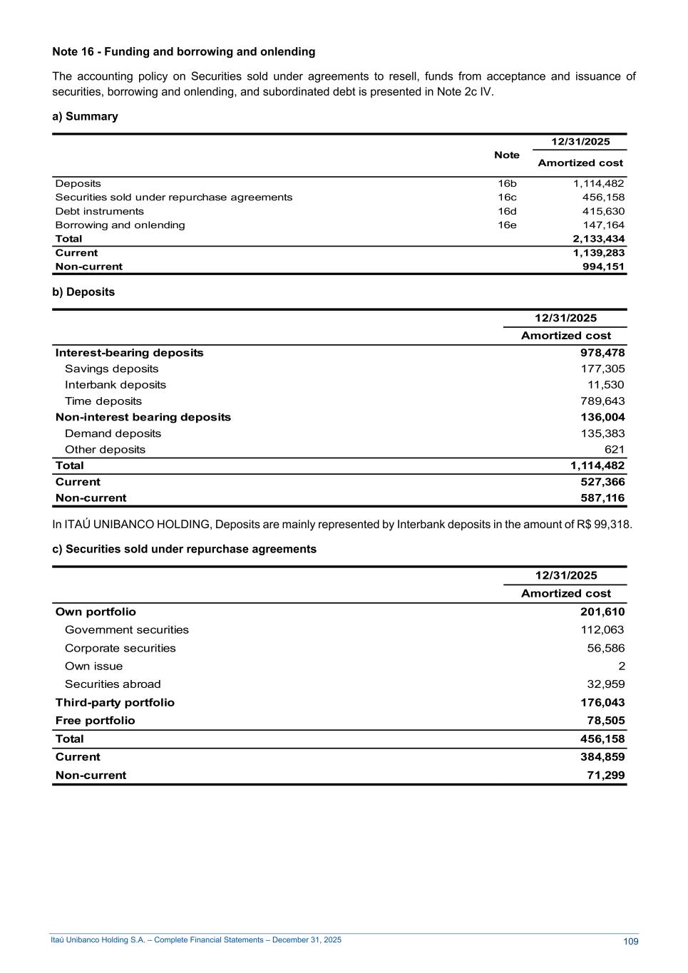 Itaú Unibanco Holding S.A. – Complete Financial Statements – December 31, 2025 Note 16 - Funding and borrowing and onlending The accounting policy on Securities sold under agreements to resell, funds from acceptance and issuance of securities, borrowing and onlending, and subordinated debt is presented in Note 2c IV. a) Summary Note 12/31/2025 Amortized cost Deposits 16b 1,114,482 Securities sold under repurchase agreements 16c 456,158 Debt instruments 16d 415,630 Borrowing and onlending 16e 147,164 Total 2,133,434 Current 1,139,283 Non-current 994,151 b) Deposits 12/31/2025 Amortized cost Interest-bearing deposits 978,478 Savings deposits 177,305 Interbank deposits 11,530 Time deposits 789,643 Non-interest bearing deposits 136,004 Demand deposits 135,383 Other deposits 621 Total 1,114,482 Current 527,366 Non-current 587,116 In ITAÚ UNIBANCO HOLDING, Deposits are mainly represented by Interbank deposits in the amount of R$ 99,318. c) Securities sold under repurchase agreements 12/31/2025 Amortized cost Own portfolio 201,610 Government securities 112,063 Corporate securities 56,586 Own issue 2 Securities abroad 32,959 Third-party portfolio 176,043 Free portfolio 78,505 Total 456,158 Current 384,859 Non-current 71,299 109