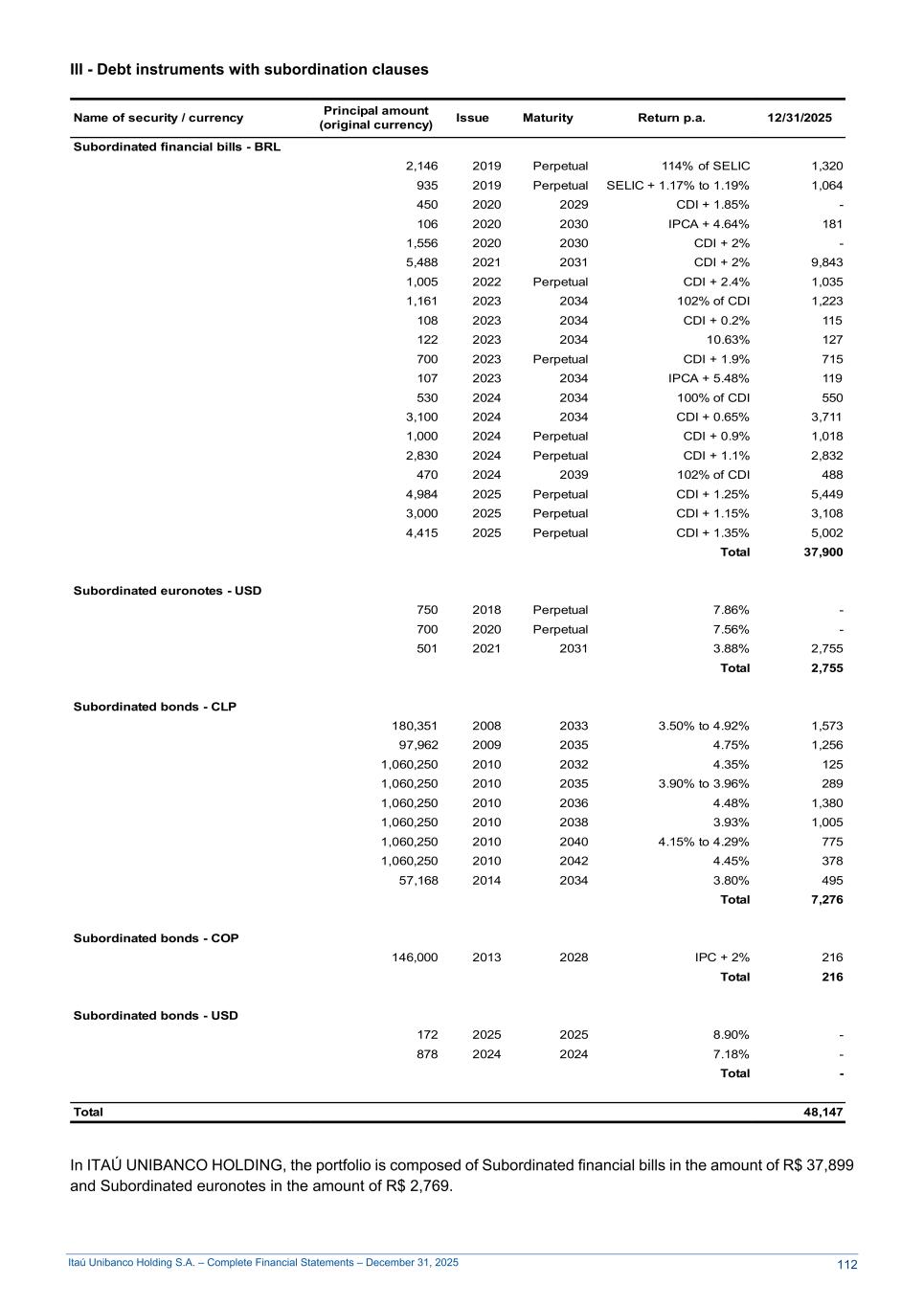 Itaú Unibanco Holding S.A. – Complete Financial Statements – December 31, 2025 III - Debt instruments with subordination clauses Name of security / currency Principal amount (original currency) Issue Maturity Return p.a. 12/31/2025 Subordinated financial bills - BRL 2,146 2019 Perpetual 114% of SELIC 1,320 935 2019 Perpetual SELIC + 1.17% to 1.19% 1,064 450 2020 2029 CDI + 1.85% - 106 2020 2030 IPCA + 4.64% 181 1,556 2020 2030 CDI + 2% - 5,488 2021 2031 CDI + 2% 9,843 1,005 2022 Perpetual CDI + 2.4% 1,035 1,161 2023 2034 102% of CDI 1,223 108 2023 2034 CDI + 0.2% 115 122 2023 2034 10.63% 127 700 2023 Perpetual CDI + 1.9% 715 107 2023 2034 IPCA + 5.48% 119 530 2024 2034 100% of CDI 550 3,100 2024 2034 CDI + 0.65% 3,711 1,000 2024 Perpetual CDI + 0.9% 1,018 2,830 2024 Perpetual CDI + 1.1% 2,832 470 2024 2039 102% of CDI 488 4,984 2025 Perpetual CDI + 1.25% 5,449 3,000 2025 Perpetual CDI + 1.15% 3,108 4,415 2025 Perpetual CDI + 1.35% 5,002 Total 37,900 Subordinated euronotes - USD 750 2018 Perpetual 7.86% - 700 2020 Perpetual 7.56% - 501 2021 2031 3.88% 2,755 Total 2,755 Subordinated bonds - CLP 180,351 2008 2033 3.50% to 4.92% 1,573 97,962 2009 2035 4.75% 1,256 1,060,250 2010 2032 4.35% 125 1,060,250 2010 2035 3.90% to 3.96% 289 1,060,250 2010 2036 4.48% 1,380 1,060,250 2010 2038 3.93% 1,005 1,060,250 2010 2040 4.15% to 4.29% 775 1,060,250 2010 2042 4.45% 378 57,168 2014 2034 3.80% 495 Total 7,276 Subordinated bonds - COP 146,000 2013 2028 IPC + 2% 216 Total 216 Subordinated bonds - USD 172 2025 2025 8.90% - 878 2024 2024 7.18% - 1 Total - Total 48,147 In ITAÚ UNIBANCO HOLDING, the portfolio is composed of Subordinated financial bills in the amount of R$ 37,899 and Subordinated euronotes in the amount of R$ 2,769. 112