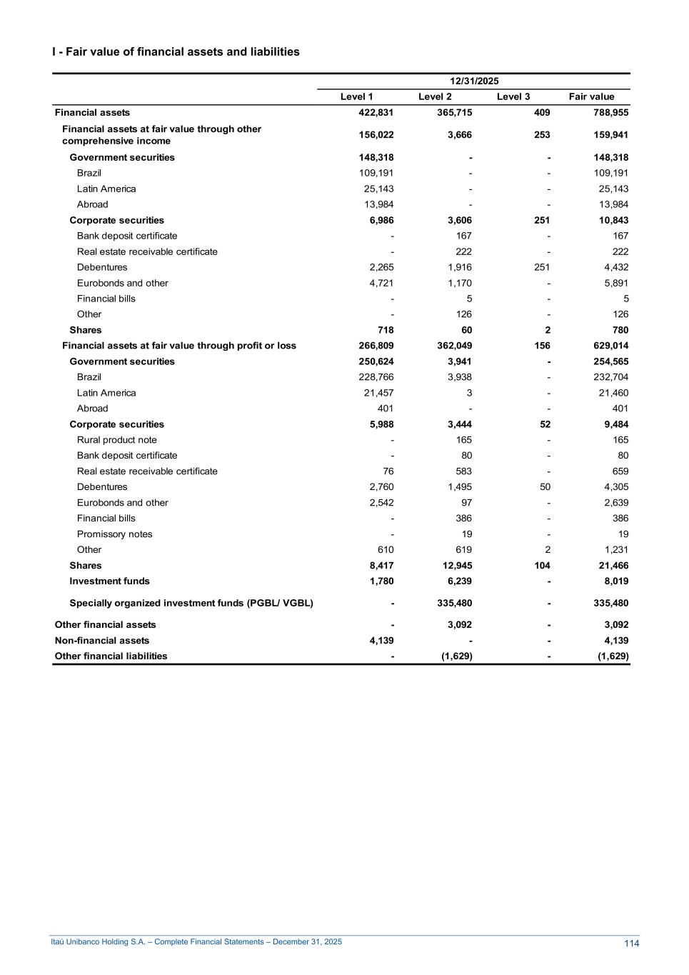Itaú Unibanco Holding S.A. – Complete Financial Statements – December 31, 2025 I - Fair value of financial assets and liabilities 12/31/2025 Level 1 Level 2 Level 3 Fair value Financial assets 422,831 365,715 409 788,955 Financial assets at fair value through other comprehensive income 156,022 3,666 253 159,941 Government securities 148,318 - - 148,318 Brazil 109,191 - - 109,191 Latin America 25,143 - - 25,143 Abroad 13,984 - - 13,984 Corporate securities 6,986 3,606 251 10,843 Bank deposit certificate - 167 - 167 Real estate receivable certificate - 222 - 222 Debentures 2,265 1,916 251 4,432 Eurobonds and other 4,721 1,170 - 5,891 Financial bills - 5 - 5 Other - 126 - 126 Shares 718 60 2 780 Financial assets at fair value through profit or loss 266,809 362,049 156 629,014 Government securities 250,624 3,941 - 254,565 Brazil 228,766 3,938 - 232,704 Latin America 21,457 3 - 21,460 Abroad 401 - - 401 Corporate securities 5,988 3,444 52 9,484 Rural product note - 165 - 165 Bank deposit certificate - 80 - 80 Real estate receivable certificate 76 583 - 659 Debentures 2,760 1,495 50 4,305 Eurobonds and other 2,542 97 - 2,639 Financial bills - 386 - 386 Promissory notes - 19 - 19 Other 610 619 2 1,231 Shares 8,417 12,945 104 21,466 Investment funds 1,780 6,239 - 8,019 Specially organized investment funds (PGBL/ VGBL) - 335,480 - 335,480 Other financial assets - 3,092 - 3,092 Non-financial assets 4,139 - - 4,139 Other financial liabilities - (1,629) - (1,629) 114