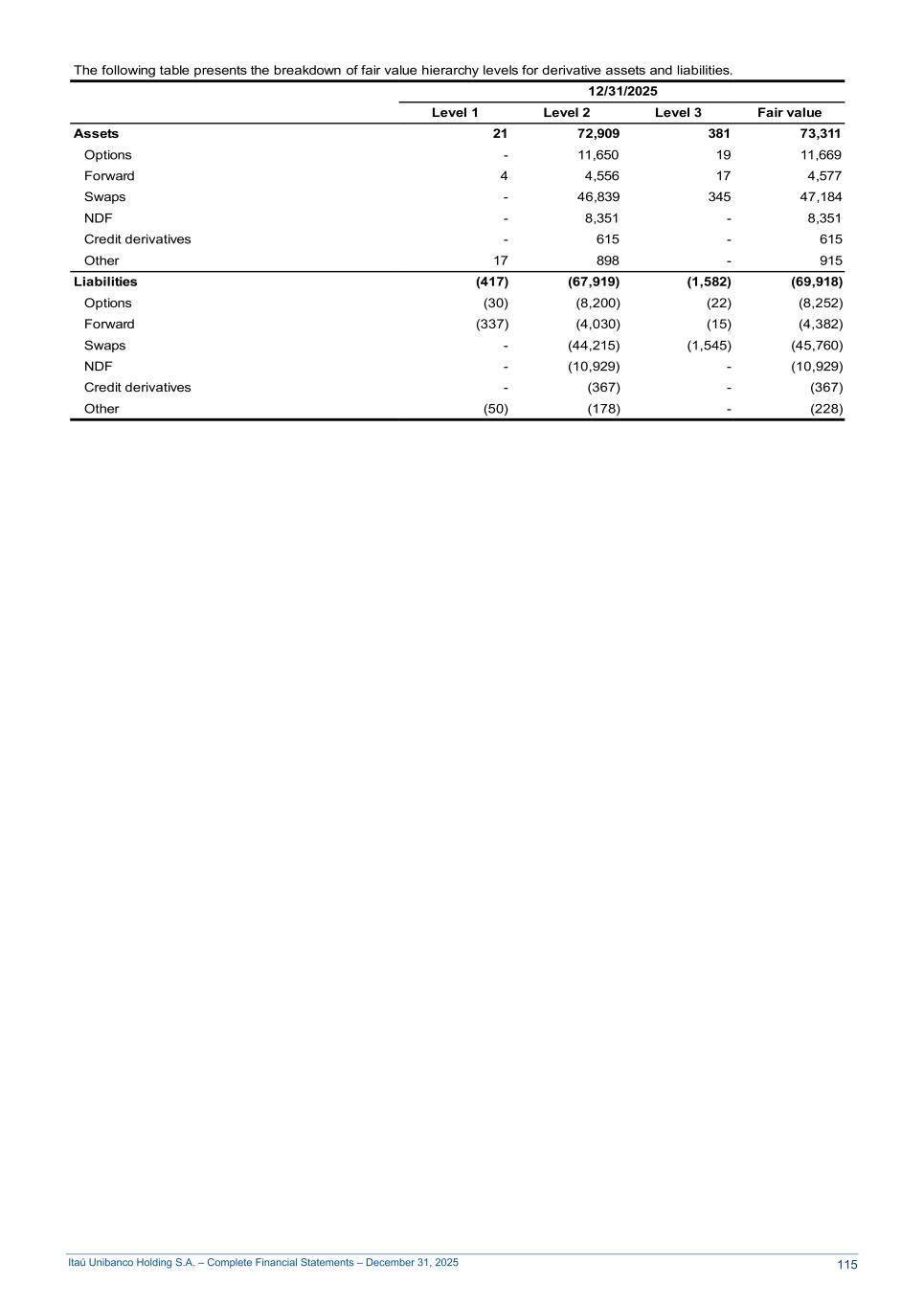 Itaú Unibanco Holding S.A. – Complete Financial Statements – December 31, 2025 The following table presents the breakdown of fair value hierarchy levels for derivative assets and liabilities. 12/31/2025 Level 1 Level 2 Level 3 Fair value Assets 21 72,909 381 73,311 Options - 11,650 19 11,669 Forward 4 4,556 17 4,577 Swaps - 46,839 345 47,184 NDF - 8,351 - 8,351 Credit derivatives - 615 - 615 Other 17 898 - 915 Liabilities (417) (67,919) (1,582) (69,918) Options (30) (8,200) (22) (8,252) Forward (337) (4,030) (15) (4,382) Swaps - (44,215) (1,545) (45,760) NDF - (10,929) - (10,929) Credit derivatives - (367) - (367) Other (50) (178) - (228) 115