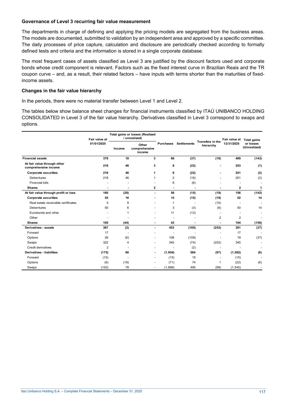 Itaú Unibanco Holding S.A. – Complete Financial Statements – December 31, 2025 Governance of Level 3 recurring fair value measurement The departments in charge of defining and applying the pricing models are segregated from the business areas. The models are documented, submitted to validation by an independent area and approved by a specific committee. The daily processes of price capture, calculation and disclosure are periodically checked according to formally defined tests and criteria and the information is stored in a single corporate database. The most frequent cases of assets classified as Level 3 are justified by the discount factors used and corporate bonds whose credit component is relevant. Factors such as the fixed interest curve in Brazilian Reais and the TR coupon curve – and, as a result, their related factors – have inputs with terms shorter than the maturities of fixed- income assets. Changes in the fair value hierarchy In the periods, there were no material transfer between Level 1 and Level 2. The tables below show balance sheet changes for financial instruments classified by ITAÚ UNIBANCO HOLDING CONSOLIDATED in Level 3 of the fair value hierarchy. Derivatives classified in Level 3 correspond to swaps and options. Fair value at Total gains or losses (Realized / unrealized) Purchases Settlements Transfers in the hierarchy Fair value at Total gains or losses (Unrealized) 01/01/2025 Income Other comprehensive income 12/31/2025 Financial assets 378 18 3 66 (37) (19) 409 (143) At fair value through other comprehensive income 218 46 3 8 (22) - 253 (1) Corporate securities 218 46 1 8 (22) - 251 (2) Debentures 218 46 1 2 (16) - 251 (2) Financial bills - - - 6 (6) - - - Shares - - 2 - - - 2 1 At fair value through profit or loss 160 (28) - 58 (15) (19) 156 (142) Corporate securities 55 16 - 15 (15) (19) 52 14 Real estate receivable certificates 5 9 - 1 - (15) - - Debentures 50 6 - 3 (3) (6) 50 14 Eurobonds and other - 1 - 11 (12) - - - Other - - - - - 2 2 - Shares 105 (44) - 43 - - 104 (156) Derivatives - assets 367 (2) - 453 (185) (252) 381 (37) Forward 17 - - - - - 17 - Options 26 (6) - 108 (109) - 19 (37) Swaps 322 4 - 345 (74) (252) 345 - Credit derivatives 2 - - - (2) - - - Derivatives - liabilities (175) 60 - (1,954) 584 (97) (1,582) (6) Forward (15) - - (15) 15 - (15) - Options (8) (18) - (71) 74 1 (22) (6) Swaps (152) 78 - (1,868) 495 (98) (1,545) - 117
