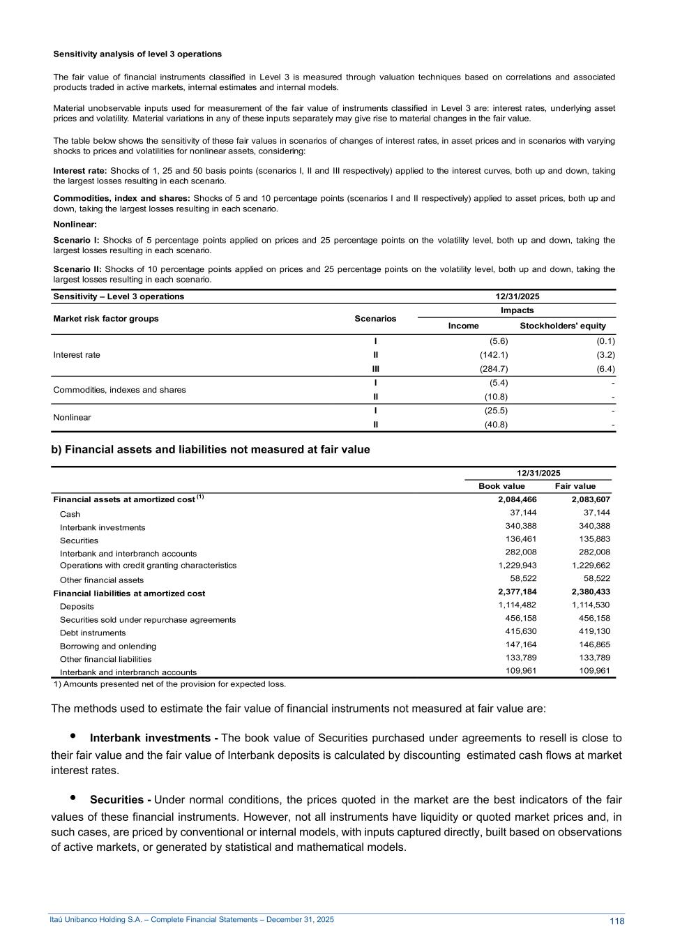 Itaú Unibanco Holding S.A. – Complete Financial Statements – December 31, 2025 Sensitivity analysis of level 3 operations The fair value of financial instruments classified in Level 3 is measured through valuation techniques based on correlations and associated products traded in active markets, internal estimates and internal models. Material unobservable inputs used for measurement of the fair value of instruments classified in Level 3 are: interest rates, underlying asset prices and volatility. Material variations in any of these inputs separately may give rise to material changes in the fair value. The table below shows the sensitivity of these fair values in scenarios of changes of interest rates, in asset prices and in scenarios with varying shocks to prices and volatilities for nonlinear assets, considering: Interest rate: Shocks of 1, 25 and 50 basis points (scenarios I, II and III respectively) applied to the interest curves, both up and down, taking the largest losses resulting in each scenario. Commodities, index and shares: Shocks of 5 and 10 percentage points (scenarios I and II respectively) applied to asset prices, both up and down, taking the largest losses resulting in each scenario. Nonlinear: Scenario I: Shocks of 5 percentage points applied on prices and 25 percentage points on the volatility level, both up and down, taking the largest losses resulting in each scenario. Scenario II: Shocks of 10 percentage points applied on prices and 25 percentage points on the volatility level, both up and down, taking the largest losses resulting in each scenario. Sensitivity – Level 3 operations 12/31/2025 Market risk factor groups Scenarios Impacts Income Stockholders' equity Interest rate I (5.6) (0.1) II (142.1) (3.2) III (284.7) (6.4) Commodities, indexes and shares I (5.4) - II (10.8) - Nonlinear I (25.5) - II (40.8) - b) Financial assets and liabilities not measured at fair value 12/31/2025 Book value Fair value Financial assets at amortized cost (1) 2,084,466 2,083,607 Cash 37,144 37,144 Interbank investments 340,388 340,388 Securities 136,461 135,883 Interbank and interbranch accounts 282,008 282,008 Operations with credit granting characteristics 1,229,943 1,229,662 Other financial assets 58,522 58,522 Financial liabilities at amortized cost 2,377,184 2,380,433 Deposits 1,114,482 1,114,530 Securities sold under repurchase agreements 456,158 456,158 Debt instruments 415,630 419,130 Borrowing and onlending 147,164 146,865 Other financial liabilities 133,789 133,789 Interbank and interbranch accounts 109,961 109,961 1) Amounts presented net of the provision for expected loss. The methods used to estimate the fair value of financial instruments not measured at fair value are: • Interbank investments - The book value of Securities purchased under agreements to resell is close to their fair value and the fair value of Interbank deposits is calculated by discounting estimated cash flows at market interest rates. • Securities - Under normal conditions, the prices quoted in the market are the best indicators of the fair values of these financial instruments. However, not all instruments have liquidity or quoted market prices and, in such cases, are priced by conventional or internal models, with inputs captured directly, built based on observations of active markets, or generated by statistical and mathematical models. 118