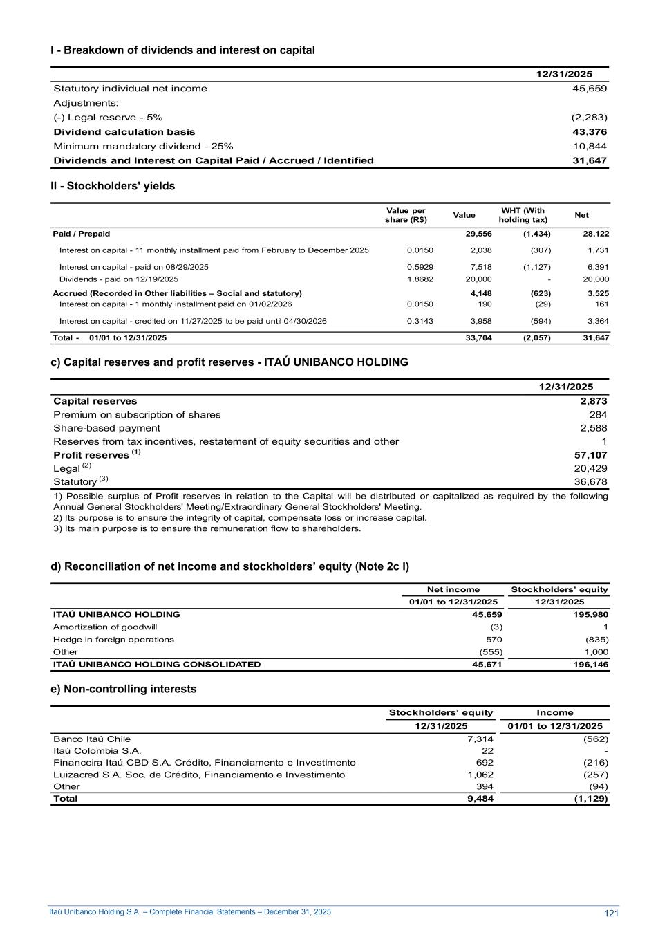 Itaú Unibanco Holding S.A. – Complete Financial Statements – December 31, 2025 I - Breakdown of dividends and interest on capital 12/31/2025 Statutory individual net income 45,659 Adjustments: (-) Legal reserve - 5% (2,283) Dividend calculation basis 43,376 Minimum mandatory dividend - 25% 10,844 Dividends and Interest on Capital Paid / Accrued / Identified 31,647 II - Stockholders' yields Value per share (R$) Value WHT (With holding tax) Net Paid / Prepaid 29,556 (1,434) 28,122 Interest on capital - 11 monthly installment paid from February to December 2025 0.0150 2,038 (307) 1,731 Interest on capital - paid on 08/29/2025 0.5929 7,518 (1,127) 6,391 Dividends - paid on 12/19/2025 1.8682 20,000 - 20,000 Accrued (Recorded in Other liabilities – Social and statutory) 4,148 (623) 3,525 Interest on capital - 1 monthly installment paid on 01/02/2026 0.0150 190 (29) 161 Interest on capital - credited on 11/27/2025 to be paid until 04/30/2026 0.3143 3,958 (594) 3,364 Total - 01/01 to 12/31/2025 33,704 (2,057) 31,647 c) Capital reserves and profit reserves - ITAÚ UNIBANCO HOLDING 12/31/2025 Capital reserves 2,873 Premium on subscription of shares 284 Share-based payment 2,588 Reserves from tax incentives, restatement of equity securities and other 1 Profit reserves (1) 57,107 Legal (2) 20,429 Statutory (3) 36,678 1) Possible surplus of Profit reserves in relation to the Capital will be distributed or capitalized as required by the following Annual General Stockholders' Meeting/Extraordinary General Stockholders' Meeting. 2) Its purpose is to ensure the integrity of capital, compensate loss or increase capital. 3) Its main purpose is to ensure the remuneration flow to shareholders. d) Reconciliation of net income and stockholders’ equity (Note 2c I) Net income Stockholders’ equity 01/01 to 12/31/2025 12/31/2025 ITAÚ UNIBANCO HOLDING 45,659 195,980 Amortization of goodwill (3) 1 Hedge in foreign operations 570 (835) Other (555) 1,000 ITAÚ UNIBANCO HOLDING CONSOLIDATED 45,671 196,146 e) Non-controlling interests Stockholders’ equity Income 12/31/2025 01/01 to 12/31/2025 Banco Itaú Chile 7,314 (562) Itaú Colombia S.A. 22 - Financeira Itaú CBD S.A. Crédito, Financiamento e Investimento 692 (216) Luizacred S.A. Soc. de Crédito, Financiamento e Investimento 1,062 (257) Other 394 (94) Total 9,484 (1,129) 121
