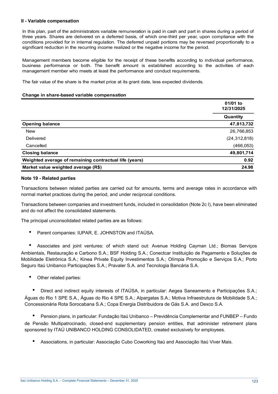 Itaú Unibanco Holding S.A. – Complete Financial Statements – December 31, 2025 II - Variable compensation In this plan, part of the administrators variable remuneration is paid in cash and part in shares during a period of three years. Shares are delivered on a deferred basis, of which one-third per year, upon compliance with the conditions provided for in internal regulation. The deferred unpaid portions may be reversed proportionally to a significant reduction in the recurring income realized or the negative income for the period. Management members become eligible for the receipt of these benefits according to individual performance, business performance or both. The benefit amount is established according to the activities of each management member who meets at least the performance and conduct requirements. The fair value of the share is the market price at its grant date, less expected dividends. Change in share-based variable compensation 01/01 to 12/31/2025 Quantity Opening balance 47,813,732 New 26,766,853 Delivered (24,312,818) Cancelled (466,053) Closing balance 49,801,714 Weighted average of remaining contractual life (years) 0.92 Market value weighted average (R$) 24.98 Note 19 - Related parties Transactions between related parties are carried out for amounts, terms and average rates in accordance with normal market practices during the period, and under reciprocal conditions. Transactions between companies and investment funds, included in consolidation (Note 2c I), have been eliminated and do not affect the consolidated statements. The principal unconsolidated related parties are as follows: • Parent companies: IUPAR, E. JOHNSTON and ITAÚSA. • Associates and joint ventures: of which stand out: Avenue Holding Cayman Ltd.; Biomas Serviços Ambientais, Restauração e Carbono S.A.; BSF Holding S.A.; Conectcar Instituição de Pagamento e Soluções de Mobilidade Eletrônica S.A.; Kinea Private Equity Investimentos S.A.; Olímpia Promoção e Serviços S.A.; Porto Seguro Itaú Unibanco Participações S.A.; Pravaler S.A. and Tecnologia Bancária S.A. • Other related parties: • Direct and indirect equity interests of ITAÚSA, in particular: Aegea Saneamento e Participações S.A.; Águas do Rio 1 SPE S.A., Águas do Rio 4 SPE S.A.; Alpargatas S.A.; Motiva Infraestrutura de Mobilidade S.A.; Concessionária Rota Sorocabana S.A.; Copa Energia Distribuidora de Gás S.A. and Dexco S.A. • Pension plans, in particular: Fundação Itaú Unibanco – Previdência Complementar and FUNBEP – Fundo de Pensão Multipatrocinado, closed-end supplementary pension entities, that administer retirement plans sponsored by ITAÚ UNIBANCO HOLDING CONSOLIDATED, created exclusively for employees. • Associations, in particular: Associação Cubo Coworking Itaú and Associação Itaú Viver Mais. 123