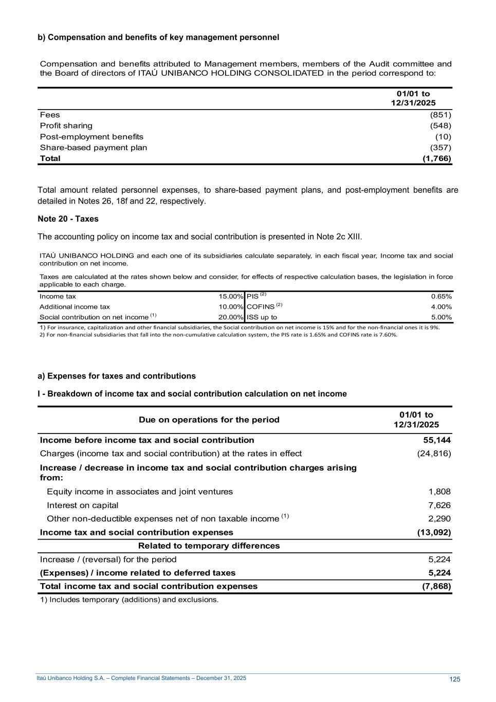 Itaú Unibanco Holding S.A. – Complete Financial Statements – December 31, 2025 b) Compensation and benefits of key management personnel Compensation and benefits attributed to Management members, members of the Audit committee and the Board of directors of ITAÚ UNIBANCO HOLDING CONSOLIDATED in the period correspond to: 01/01 to 12/31/2025 Fees (851) Profit sharing (548) Post-employment benefits (10) Share-based payment plan (357) Total (1,766) Total amount related personnel expenses, to share-based payment plans, and post-employment benefits are detailed in Notes 26, 18f and 22, respectively. Note 20 - Taxes The accounting policy on income tax and social contribution is presented in Note 2c XIII. ITAÚ UNIBANCO HOLDING and each one of its subsidiaries calculate separately, in each fiscal year, Income tax and social contribution on net income. Taxes are calculated at the rates shown below and consider, for effects of respective calculation bases, the legislation in force applicable to each charge. Income tax 15.00% PIS (2) 0.65% Additional income tax 10.00% COFINS (2) 4.00% Social contribution on net income (1) 20.00% ISS up to 5.00% 1) For insurance, capitalization and other financial subsidiaries, the Social contribution on net income is 15% and for the non-financial ones it is 9%. 2) For non-financial subsidiaries that fall into the non-cumulative calculation system, the PIS rate is 1.65% and COFINS rate is 7.60%. a) Expenses for taxes and contributions I - Breakdown of income tax and social contribution calculation on net income Due on operations for the period 01/01 to 12/31/2025 Income before income tax and social contribution 55,144 Charges (income tax and social contribution) at the rates in effect (24,816) Increase / decrease in income tax and social contribution charges arising from: Equity income in associates and joint ventures 1,808 Interest on capital 7,626 Other non-deductible expenses net of non taxable income (1) 2,290 Income tax and social contribution expenses (13,092) Related to temporary differences Increase / (reversal) for the period 5,224 (Expenses) / income related to deferred taxes 5,224 Total income tax and social contribution expenses (7,868) 1) Includes temporary (additions) and exclusions. 125