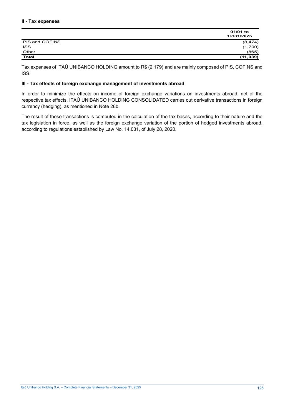 Itaú Unibanco Holding S.A. – Complete Financial Statements – December 31, 2025 II - Tax expenses 01/01 to 12/31/2025 PIS and COFINS (8,474) ISS (1,700) Other (865) Total (11,039) Tax expenses of ITAÚ UNIBANCO HOLDING amount to R$ (2,179) and are mainly composed of PIS, COFINS and ISS. III - Tax effects of foreign exchange management of investments abroad In order to minimize the effects on income of foreign exchange variations on investments abroad, net of the respective tax effects, ITAÚ UNIBANCO HOLDING CONSOLIDATED carries out derivative transactions in foreign currency (hedging), as mentioned in Note 28b. The result of these transactions is computed in the calculation of the tax bases, according to their nature and the tax legislation in force, as well as the foreign exchange variation of the portion of hedged investments abroad, according to regulations established by Law No. 14,031, of July 28, 2020. 126