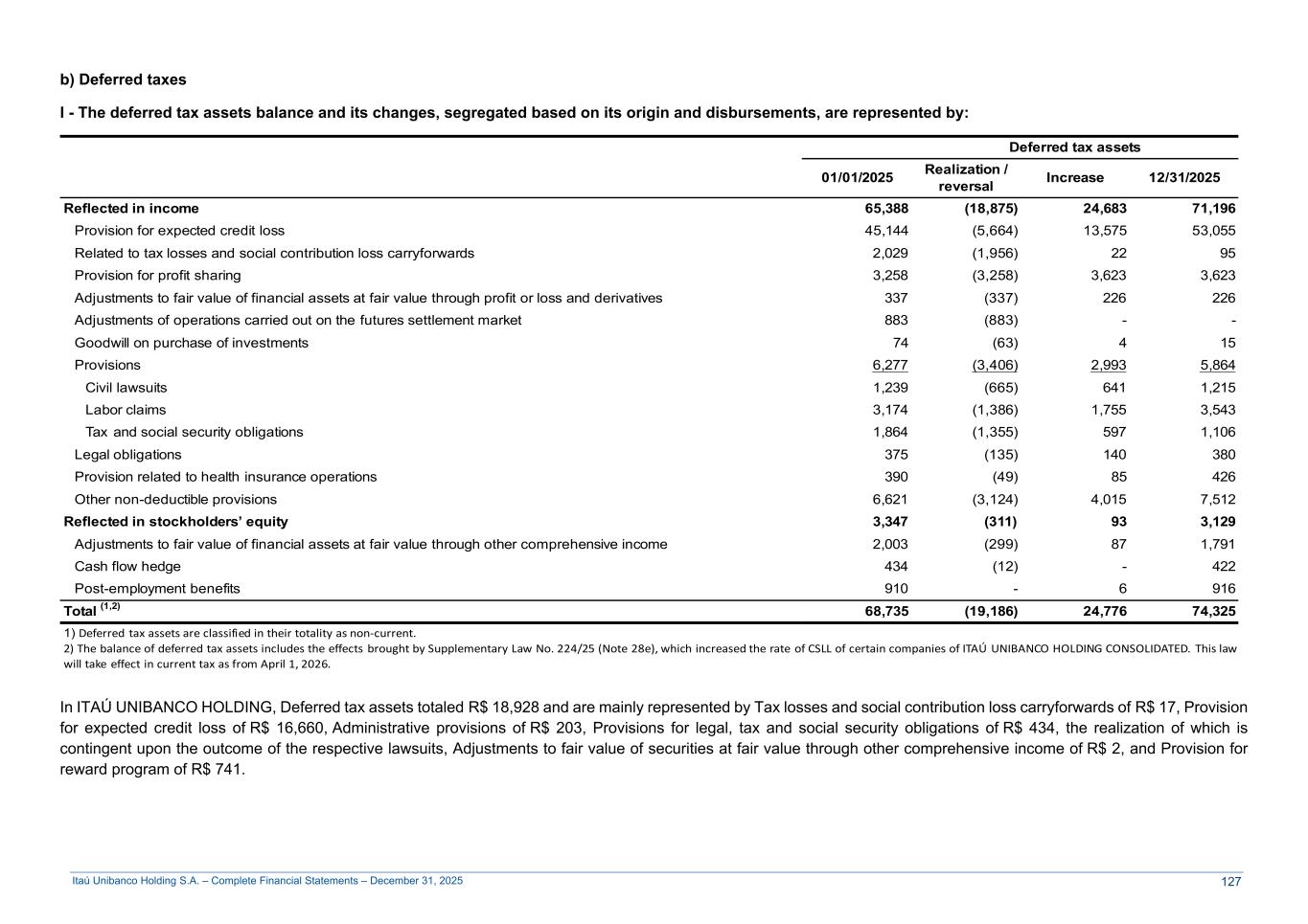 Itaú Unibanco Holding S.A. – Complete Financial Statements – December 31, 2025 b) Deferred taxes I - The deferred tax assets balance and its changes, segregated based on its origin and disbursements, are represented by: 01/01/2025 Deferred tax assets 01/01/2025 01/01/2025 Realization / reversal Increase 12/31/2025 Reflected in income 65,388 (18,875) 24,683 71,196 Provision for expected credit loss 45,144 (5,664) 13,575 53,055 Related to tax losses and social contribution loss carryforwards 2,029 (1,956) 22 95 Provision for profit sharing 3,258 (3,258) 3,623 3,623 Adjustments to fair value of financial assets at fair value through profit or loss and derivatives 337 (337) 226 226 Adjustments of operations carried out on the futures settlement market 883 (883) - - Goodwill on purchase of investments 74 (63) 4 15 Provisions 6,277 (3,406) 2,993 5,864 Civil lawsuits 1,239 (665) 641 1,215 Labor claims 3,174 (1,386) 1,755 3,543 Tax and social security obligations 1,864 (1,355) 597 1,106 Legal obligations 375 (135) 140 380 Provision related to health insurance operations 390 (49) 85 426 Other non-deductible provisions 6,621 (3,124) 4,015 7,512 Reflected in stockholders’ equity 3,347 (311) 93 3,129 Adjustments to fair value of financial assets at fair value through other comprehensive income 2,003 (299) 87 1,791 Cash flow hedge 434 (12) - 422 Post-employment benefits 910 - 6 916 Total (1,2) 68,735 (19,186) 24,776 74,325 1) Deferred tax assets are classified in their totality as non-current. 2) The balance of deferred tax assets includes the effects brought by Supplementary Law No. 224/25 (Note 28e), which increased the rate of CSLL of certain companies of ITAÚ UNIBANCO HOLDING CONSOLIDATED. This law will take effect in current tax as from April 1, 2026. In ITAÚ UNIBANCO HOLDING, Deferred tax assets totaled R$ 18,928 and are mainly represented by Tax losses and social contribution loss carryforwards of R$ 17, Provision for expected credit loss of R$ 16,660, Administrative provisions of R$ 203, Provisions for legal, tax and social security obligations of R$ 434, the realization of which is contingent upon the outcome of the respective lawsuits, Adjustments to fair value of securities at fair value through other comprehensive income of R$ 2, and Provision for reward program of R$ 741. 127