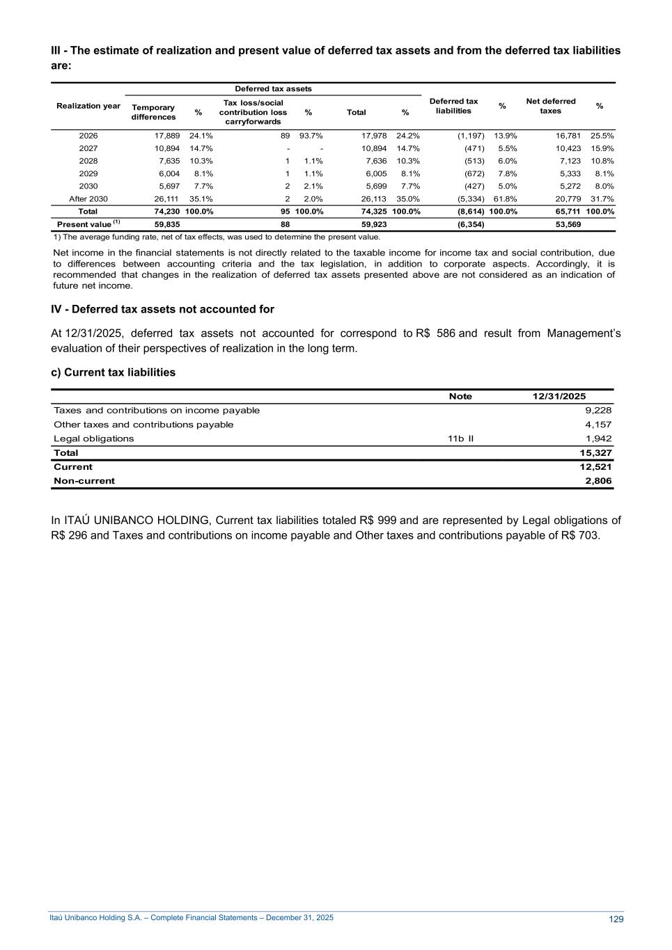 Itaú Unibanco Holding S.A. – Complete Financial Statements – December 31, 2025 III - The estimate of realization and present value of deferred tax assets and from the deferred tax liabilities are: Realization year Deferred tax assets Deferred tax liabilities % Net deferred taxes %Temporary differences % Tax loss/social contribution loss carryforwards % Total % 2026 17,889 24.1% 89 93.7% 17,978 24.2% (1,197) 13.9% 16,781 25.5% 2027 10,894 14.7% - - 10,894 14.7% (471) 5.5% 10,423 15.9% 2028 7,635 10.3% 1 1.1% 7,636 10.3% (513) 6.0% 7,123 10.8% 2029 6,004 8.1% 1 1.1% 6,005 8.1% (672) 7.8% 5,333 8.1% 2030 5,697 7.7% 2 2.1% 5,699 7.7% (427) 5.0% 5,272 8.0% After 2030 26,111 35.1% 2 2.0% 26,113 35.0% (5,334) 61.8% 20,779 31.7% Total 74,230 100.0% 95 100.0% 74,325 100.0% (8,614) 100.0% 65,711 100.0% Present value (1) 59,835 88 59,923 (6,354) 53,569 1) The average funding rate, net of tax effects, was used to determine the present value. Net income in the financial statements is not directly related to the taxable income for income tax and social contribution, due to differences between accounting criteria and the tax legislation, in addition to corporate aspects. Accordingly, it is recommended that changes in the realization of deferred tax assets presented above are not considered as an indication of future net income. IV - Deferred tax assets not accounted for At 12/31/2025, deferred tax assets not accounted for correspond to R$ 586 and result from Management’s evaluation of their perspectives of realization in the long term. c) Current tax liabilities Note 12/31/2025 Taxes and contributions on income payable 9,228 Other taxes and contributions payable 4,157 Legal obligations 11b II 1,942 Total 15,327 Current 12,521 Non-current 2,806 In ITAÚ UNIBANCO HOLDING, Current tax liabilities totaled R$ 999 and are represented by Legal obligations of R$ 296 and Taxes and contributions on income payable and Other taxes and contributions payable of R$ 703. 129