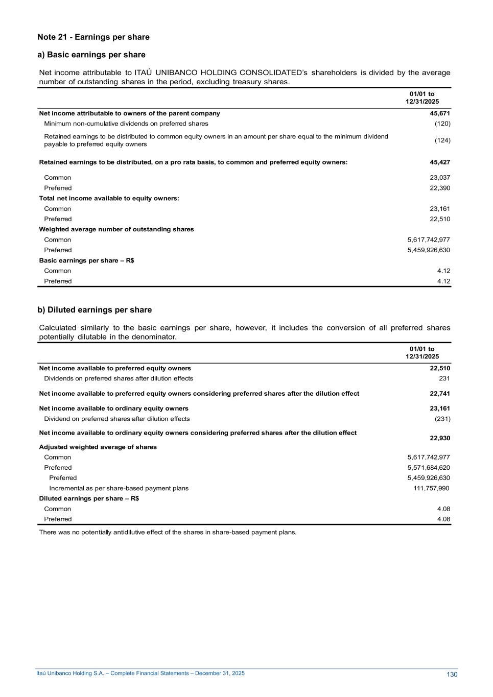 Itaú Unibanco Holding S.A. – Complete Financial Statements – December 31, 2025 Note 21 - Earnings per share a) Basic earnings per share Net income attributable to ITAÚ UNIBANCO HOLDING CONSOLIDATED’s shareholders is divided by the average number of outstanding shares in the period, excluding treasury shares. 01/01 to 12/31/2025 Net income attributable to owners of the parent company 45,671 Minimum non-cumulative dividends on preferred shares (120) Retained earnings to be distributed to common equity owners in an amount per share equal to the minimum dividend payable to preferred equity owners (124) Retained earnings to be distributed, on a pro rata basis, to common and preferred equity owners: 45,427 Common 23,037 Preferred 22,390 Total net income available to equity owners: Common 23,161 Preferred 22,510 Weighted average number of outstanding shares Common 5,617,742,977 Preferred 5,459,926,630 Basic earnings per share – R$ Common 4.12 Preferred 4.12 b) Diluted earnings per share Calculated similarly to the basic earnings per share, however, it includes the conversion of all preferred shares potentially dilutable in the denominator. 01/01 to 12/31/2025 Net income available to preferred equity owners 22,510 Dividends on preferred shares after dilution effects 231 Net income available to preferred equity owners considering preferred shares after the dilution effect 22,741 Net income available to ordinary equity owners 23,161 Dividend on preferred shares after dilution effects (231) Net income available to ordinary equity owners considering preferred shares after the dilution effect 22,930 Adjusted weighted average of shares Common 5,617,742,977 Preferred 5,571,684,620 Preferred 5,459,926,630 Incremental as per share-based payment plans 111,757,990 Diluted earnings per share – R$ Common 4.08 Preferred 4.08 There was no potentially antidilutive effect of the shares in share-based payment plans. 130