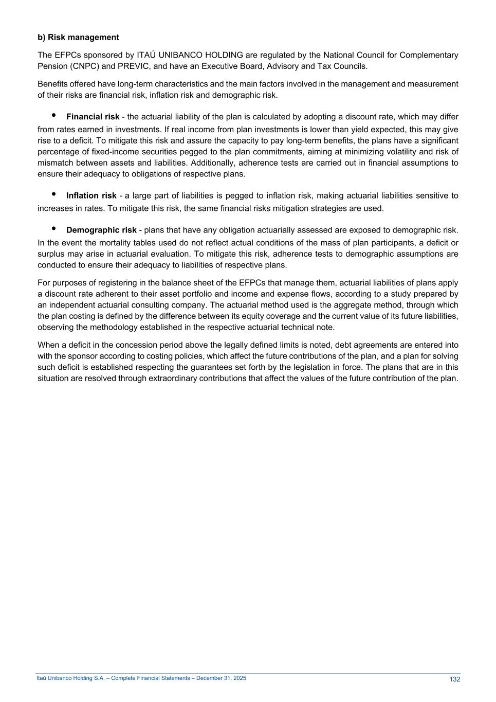 Itaú Unibanco Holding S.A. – Complete Financial Statements – December 31, 2025 b) Risk management The EFPCs sponsored by ITAÚ UNIBANCO HOLDING are regulated by the National Council for Complementary Pension (CNPC) and PREVIC, and have an Executive Board, Advisory and Tax Councils. Benefits offered have long-term characteristics and the main factors involved in the management and measurement of their risks are financial risk, inflation risk and demographic risk. • Financial risk - the actuarial liability of the plan is calculated by adopting a discount rate, which may differ from rates earned in investments. If real income from plan investments is lower than yield expected, this may give rise to a deficit. To mitigate this risk and assure the capacity to pay long-term benefits, the plans have a significant percentage of fixed-income securities pegged to the plan commitments, aiming at minimizing volatility and risk of mismatch between assets and liabilities. Additionally, adherence tests are carried out in financial assumptions to ensure their adequacy to obligations of respective plans. • Inflation risk - a large part of liabilities is pegged to inflation risk, making actuarial liabilities sensitive to increases in rates. To mitigate this risk, the same financial risks mitigation strategies are used. • Demographic risk - plans that have any obligation actuarially assessed are exposed to demographic risk. In the event the mortality tables used do not reflect actual conditions of the mass of plan participants, a deficit or surplus may arise in actuarial evaluation. To mitigate this risk, adherence tests to demographic assumptions are conducted to ensure their adequacy to liabilities of respective plans. For purposes of registering in the balance sheet of the EFPCs that manage them, actuarial liabilities of plans apply a discount rate adherent to their asset portfolio and income and expense flows, according to a study prepared by an independent actuarial consulting company. The actuarial method used is the aggregate method, through which the plan costing is defined by the difference between its equity coverage and the current value of its future liabilities, observing the methodology established in the respective actuarial technical note. When a deficit in the concession period above the legally defined limits is noted, debt agreements are entered into with the sponsor according to costing policies, which affect the future contributions of the plan, and a plan for solving such deficit is established respecting the guarantees set forth by the legislation in force. The plans that are in this situation are resolved through extraordinary contributions that affect the values of the future contribution of the plan. 132