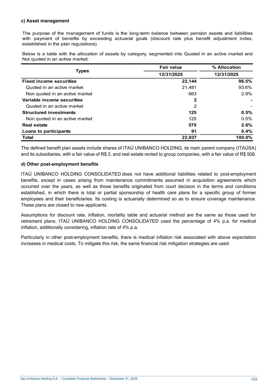 Itaú Unibanco Holding S.A. – Complete Financial Statements – December 31, 2025 c) Asset management The purpose of the management of funds is the long-term balance between pension assets and liabilities with payment of benefits by exceeding actuarial goals (discount rate plus benefit adjustment index, established in the plan regulations). Below is a table with the allocation of assets by category, segmented into Quoted in an active market and Not quoted in an active market: Types Fair value % Allocation 12/31/2025 12/31/2025 Fixed income securities 22,144 96.5% Quoted in an active market 21,481 93.6% Non quoted in an active market 663 2.9% Variable income securities 2 - Quoted in an active market 2 - Structured investments 125 0.5% Non quoted in an active market 125 0.5% Real estate 575 2.6% Loans to participants 91 0.4% Total 22,937 100.0% The defined benefit plan assets include shares of ITAÚ UNIBANCO HOLDING, its main parent company (ITAÚSA) and its subsidiaries, with a fair value of R$ 2, and real estate rented to group companies, with a fair value of R$ 508. d) Other post-employment benefits ITAÚ UNIBANCO HOLDING CONSOLIDATED does not have additional liabilities related to post-employment benefits, except in cases arising from maintenance commitments assumed in acquisition agreements which occurred over the years, as well as those benefits originated from court decision in the terms and conditions established, in which there is total or partial sponsorship of health care plans for a specific group of former employees and their beneficiaries. Its costing is actuarially determined so as to ensure coverage maintenance. These plans are closed to new applicants. Assumptions for discount rate, inflation, mortality table and actuarial method are the same as those used for retirement plans. ITAÚ UNIBANCO HOLDING CONSOLIDATED used the percentage of 4% p.a. for medical inflation, additionally considering, inflation rate of 4% p.a. Particularly in other post-employment benefits, there is medical inflation risk associated with above expectation increases in medical costs. To mitigate this risk, the same financial risk mitigation strategies are used. 133