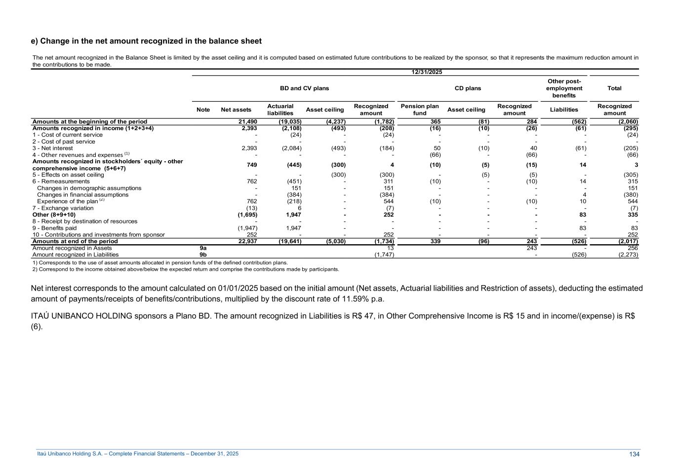 Itaú Unibanco Holding S.A. – Complete Financial Statements – December 31, 2025 e) Change in the net amount recognized in the balance sheet The net amount recognized in the Balance Sheet is limited by the asset ceiling and it is computed based on estimated future contributions to be realized by the sponsor, so that it represents the maximum reduction amount in the contributions to be made. 12/31/2025 BD and CV plans CD plans Other post- employment benefits Total Note Net assets Actuarial liabilities Asset ceiling Recognized amount Pension plan fund Asset ceiling Recognized amount Liabilities Recognized amount Amounts at the beginning of the period 21,490 (19,035) (4,237) (1,782) 365 (81) 284 (562) (2,060) Amounts recognized in income (1+2+3+4) 2,393 (2,108) (493) (208) (16) (10) (26) (61) (295) 1 - Cost of current service - (24) - (24) - - - - (24) 2 - Cost of past service - - - - - - - - - 3 - Net interest 2,393 (2,084) (493) (184) 50 (10) 40 (61) (205) 4 - Other revenues and expenses (1) - - - - (66) - (66) - (66) Amounts recognized in stockholders´ equity - other comprehensive income (5+6+7) 749 (445) (300) 4 (10) (5) (15) 14 3 5 - Effects on asset ceiling - - (300) (300) - (5) (5) - (305) 6 - Remeasurements 762 (451) - 311 (10) - (10) 14 315 Changes in demographic assumptions - 151 - 151 - - - - 151 Changes in financial assumptions - (384) - (384) - - - 4 (380) Experience of the plan (2) 762 (218) - 544 (10) - (10) 10 544 7 - Exchange variation (13) 6 - (7) - - - - (7) Other (8+9+10) (1,695) 1,947 - 252 - - - 83 335 8 - Receipt by destination of resources - - - - - - - - - 9 - Benefits paid (1,947) 1,947 - - - - - 83 83 10 - Contributions and investments from sponsor 252 - - 252 - - - - 252 Amounts at end of the period 22,937 (19,641) (5,030) (1,734) 339 (96) 243 (526) (2,017) Amount recognized in Assets 9a 13 243 - 256 Amount recognized in Liabilities 9b (1,747) - (526) (2,273) 1) Corresponds to the use of asset amounts allocated in pension funds of the defined contribution plans. 2) Correspond to the income obtained above/below the expected return and comprise the contributions made by participants. Net interest corresponds to the amount calculated on 01/01/2025 based on the initial amount (Net assets, Actuarial liabilities and Restriction of assets), deducting the estimated amount of payments/receipts of benefits/contributions, multiplied by the discount rate of 11.59% p.a. ITAÚ UNIBANCO HOLDING sponsors a Plano BD. The amount recognized in Liabilities is R$ 47, in Other Comprehensive Income is R$ 15 and in income/(expense) is R$ (6). 134