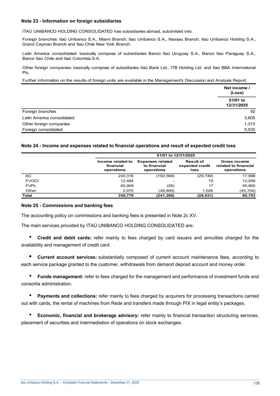 Itaú Unibanco Holding S.A. – Complete Financial Statements – December 31, 2025 Note 23 - Information on foreign subsidiaries ITAÚ UNIBANCO HOLDING CONSOLIDATED has subsidiaries abroad, subdivided into: Foreign branches: Itaú Unibanco S.A., Miami Branch; Itaú Unibanco S.A., Nassau Branch; Itaú Unibanco Holding S.A., Grand Cayman Branch and Itaú Chile New York Branch. Latin America consolidated: basically compose of subsidiaries Banco Itaú Uruguay S.A., Banco Itaú Paraguay S.A., Banco Itaú Chile and Itaú Colombia S.A. Other foreign companies: basically compose of subsidiaries Itaú Bank Ltd., ITB Holding Ltd. and Itaú BBA International Plc. Further information on the results of foreign units are available in the Management’s Discussion and Analysis Report. Net income / (Loss) 01/01 to 12/31/2025 Foreign branches 92 Latin America consolidated 3,605 Other foreign companies 1,313 Foreign consolidated 5,535 Note 24 - Income and expenses related to financial operations and result of expected credit loss 01/01 to 12/31/2025 Income related to financial operations Expenses related to financial operations Result of expected credit loss Gross income related to financial operations AC 240,316 (192,569) (29,749) 17,998 FVOCI 12,484 - 75 12,559 FVPL 95,909 (26) 17 95,900 Other 2,070 (48,800) 1,026 (45,704) Total 350,779 (241,395) (28,631) 80,753 Note 25 - Commissions and banking fees The accounting policy on commissions and banking fees is presented in Note 2c XV. The main services provided by ITAÚ UNIBANCO HOLDING CONSOLIDATED are: • Credit and debit cards: refer mainly to fees charged by card issuers and annuities charged for the availability and management of credit card. • Current account services: substantially composed of current account maintenance fees, according to each service package granted to the customer, withdrawals from demand deposit account and money order. • Funds management: refer to fees charged for the management and performance of investment funds and consortia administration. • Payments and collections: refer mainly to fees charged by acquirers for processing transactions carried out with cards, the rental of machines from Rede and transfers made through PIX in legal entity’s packages. • Economic, financial and brokerage advisory: refer mainly to financial transaction structuring services, placement of securities and intermediation of operations on stock exchanges. 136