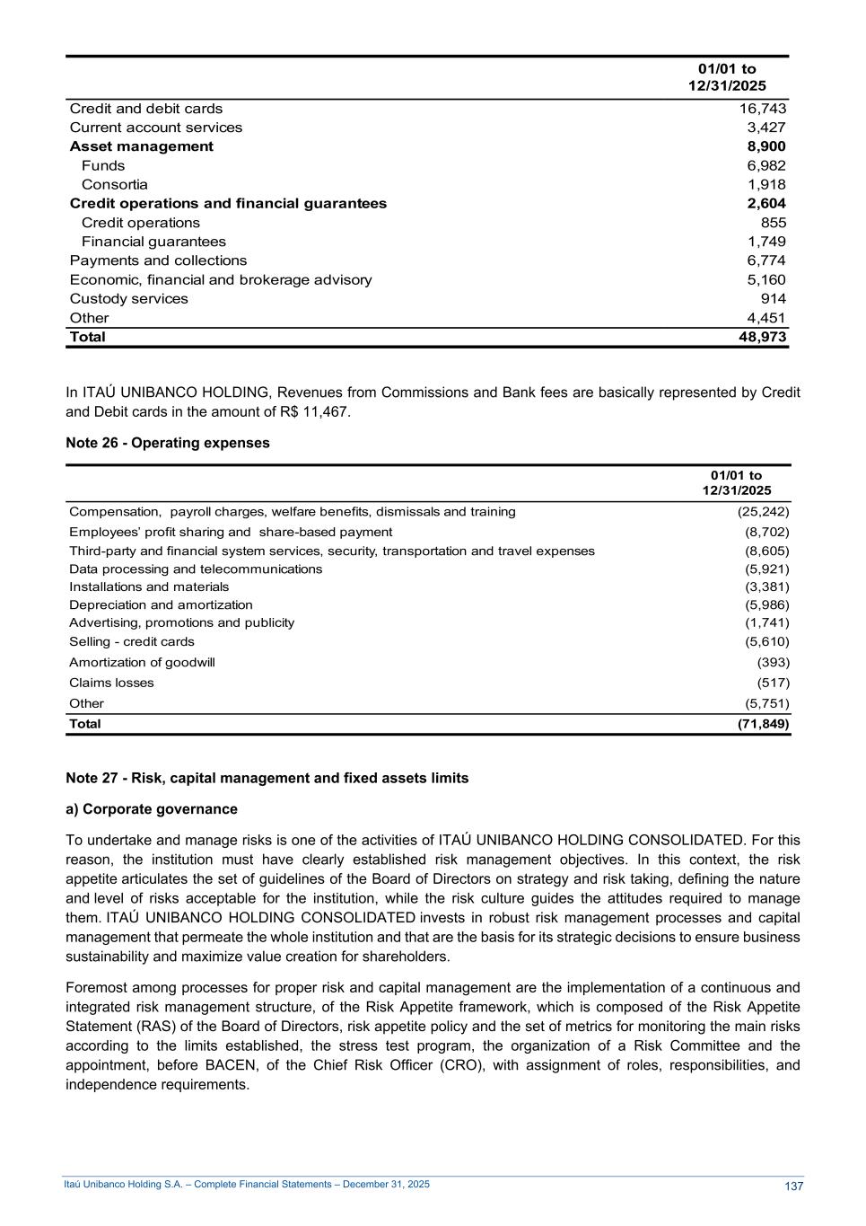 Itaú Unibanco Holding S.A. – Complete Financial Statements – December 31, 2025 01/01 to 12/31/2025 Credit and debit cards 16,743 Current account services 3,427 Asset management 8,900 Funds 6,982 Consortia 1,918 Credit operations and financial guarantees 2,604 Credit operations 855 Financial guarantees 1,749 Payments and collections 6,774 Economic, financial and brokerage advisory 5,160 Custody services 914 Other 4,451 Total 48,973 In ITAÚ UNIBANCO HOLDING, Revenues from Commissions and Bank fees are basically represented by Credit and Debit cards in the amount of R$ 11,467. Note 26 - Operating expenses 01/01 to 12/31/2025 Compensation, payroll charges, welfare benefits, dismissals and training (25,242) Employees’ profit sharing and share-based payment (8,702) Third-party and financial system services, security, transportation and travel expenses (8,605) Data processing and telecommunications (5,921) Installations and materials (3,381) Depreciation and amortization (5,986) Advertising, promotions and publicity (1,741) Selling - credit cards (5,610) Amortization of goodwill (393) Claims losses (517) Other (5,751) Total (71,849) Note 27 - Risk, capital management and fixed assets limits a) Corporate governance To undertake and manage risks is one of the activities of ITAÚ UNIBANCO HOLDING CONSOLIDATED. For this reason, the institution must have clearly established risk management objectives. In this context, the risk appetite articulates the set of guidelines of the Board of Directors on strategy and risk taking, defining the nature and level of risks acceptable for the institution, while the risk culture guides the attitudes required to manage them. ITAÚ UNIBANCO HOLDING CONSOLIDATED invests in robust risk management processes and capital management that permeate the whole institution and that are the basis for its strategic decisions to ensure business sustainability and maximize value creation for shareholders. Foremost among processes for proper risk and capital management are the implementation of a continuous and integrated risk management structure, of the Risk Appetite framework, which is composed of the Risk Appetite Statement (RAS) of the Board of Directors, risk appetite policy and the set of metrics for monitoring the main risks according to the limits established, the stress test program, the organization of a Risk Committee and the appointment, before BACEN, of the Chief Risk Officer (CRO), with assignment of roles, responsibilities, and independence requirements. 137