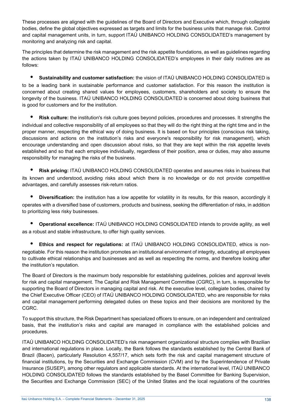 Itaú Unibanco Holding S.A. – Complete Financial Statements – December 31, 2025 These processes are aligned with the guidelines of the Board of Directors and Executive which, through collegiate bodies, define the global objectives expressed as targets and limits for the business units that manage risk. Control and capital management units, in turn, support ITAÚ UNIBANCO HOLDING CONSOLIDATED’s management by monitoring and analyzing risk and capital. The principles that determine the risk management and the risk appetite foundations, as well as guidelines regarding the actions taken by ITAÚ UNIBANCO HOLDING CONSOLIDATED’s employees in their daily routines are as follows: • Sustainability and customer satisfaction: the vision of ITAÚ UNIBANCO HOLDING CONSOLIDATED is to be a leading bank in sustainable performance and customer satisfaction. For this reason the institution is concerned about creating shared values for employees, customers, shareholders and society to ensure the longevity of the business. ITAÚ UNIBANCO HOLDING CONSOLIDATED is concerned about doing business that is good for customers and for the institution. • Risk culture: the institution's risk culture goes beyond policies, procedures and processes. It strengths the individual and collective responsibility of all employees so that they will do the right thing at the right time and in the proper manner, respecting the ethical way of doing business. It is based on four principles (conscious risk taking, discussions and actions on the institution’s risks and everyone's responsibility for risk management), which encourage understanding and open discussion about risks, so that they are kept within the risk appetite levels established and so that each employee individually, regardless of their position, area or duties, may also assume responsibility for managing the risks of the business. • Risk pricing: ITAÚ UNIBANCO HOLDING CONSOLIDATED operates and assumes risks in business that its known and understood, avoiding risks about which there is no knowledge or do not provide competitive advantages, and carefully assesses risk-return ratios. • Diversification: the institution has a low appetite for volatility in its results, for this reason, accordingly it operates with a diversified base of customers, products and business, seeking the differentiation of risks, in addition to prioritizing less risky businesses. • Operational excellence: ITAÚ UNIBANCO HOLDING CONSOLIDATED intends to provide agility, as well as a robust and stable infrastructure, to offer high quality services. • Ethics and respect for regulations: at ITAÚ UNIBANCO HOLDING CONSOLIDATED, ethics is non- negotiable. For this reason the institution promotes an institutional environment of integrity, educating all employees to cultivate ethical relationships and businesses and as well as respecting the norms, and therefore looking after the institution’s reputation. The Board of Directors is the maximum body responsible for establishing guidelines, policies and approval levels for risk and capital management. The Capital and Risk Management Committee (CGRC), in turn, is responsible for supporting the Board of Directors in managing capital and risk. At the executive level, collegiate bodies, chaired by the Chief Executive Officer (CEO) of ITAÚ UNIBANCO HOLDING CONSOLIDATED, who are responsible for risks and capital management performing delegated duties on these topics and their decisions are monitored by the CGRC. To support this structure, the Risk Department has specialized officers to ensure, on an independent and centralized basis, that the institution’s risks and capital are managed in compliance with the established policies and procedures. ITAÚ UNIBANCO HOLDING CONSOLIDATED’s risk management organizational structure complies with Brazilian and international regulations in place. Locally, the Bank follows the standards established by the Central Bank of Brazil (Bacen), particularly Resolution 4,557/17, which sets forth the risk and capital management structure of financial institutions, by the Securities and Exchange Commission (CVM) and by the Superintendence of Private Insurance (SUSEP), among other regulators and applicable standards. At the international level, ITAÚ UNIBANCO HOLDING CONSOLIDATED follows the standards established by the Basel Committee for Banking Supervision, the Securities and Exchange Commission (SEC) of the United States and the local regulations of the countries 138