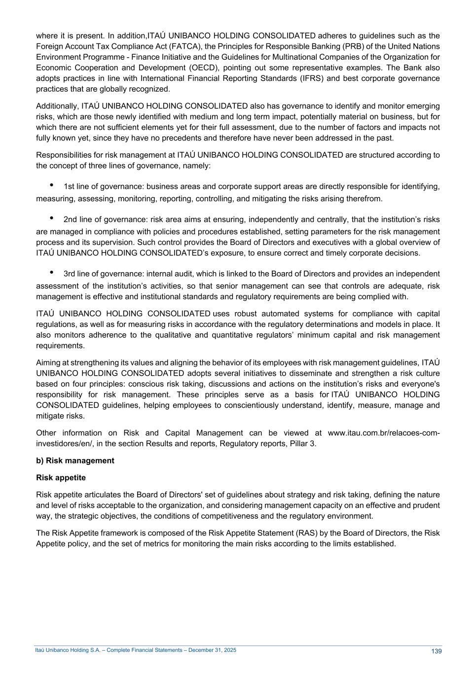 Itaú Unibanco Holding S.A. – Complete Financial Statements – December 31, 2025 where it is present. In addition,ITAÚ UNIBANCO HOLDING CONSOLIDATED adheres to guidelines such as the Foreign Account Tax Compliance Act (FATCA), the Principles for Responsible Banking (PRB) of the United Nations Environment Programme - Finance Initiative and the Guidelines for Multinational Companies of the Organization for Economic Cooperation and Development (OECD), pointing out some representative examples. The Bank also adopts practices in line with International Financial Reporting Standards (IFRS) and best corporate governance practices that are globally recognized. Additionally, ITAÚ UNIBANCO HOLDING CONSOLIDATED also has governance to identify and monitor emerging risks, which are those newly identified with medium and long term impact, potentially material on business, but for which there are not sufficient elements yet for their full assessment, due to the number of factors and impacts not fully known yet, since they have no precedents and therefore have never been addressed in the past. Responsibilities for risk management at ITAÚ UNIBANCO HOLDING CONSOLIDATED are structured according to the concept of three lines of governance, namely: • 1st line of governance: business areas and corporate support areas are directly responsible for identifying, measuring, assessing, monitoring, reporting, controlling, and mitigating the risks arising therefrom. • 2nd line of governance: risk area aims at ensuring, independently and centrally, that the institution’s risks are managed in compliance with policies and procedures established, setting parameters for the risk management process and its supervision. Such control provides the Board of Directors and executives with a global overview of ITAÚ UNIBANCO HOLDING CONSOLIDATED’s exposure, to ensure correct and timely corporate decisions. • 3rd line of governance: internal audit, which is linked to the Board of Directors and provides an independent assessment of the institution’s activities, so that senior management can see that controls are adequate, risk management is effective and institutional standards and regulatory requirements are being complied with. ITAÚ UNIBANCO HOLDING CONSOLIDATED uses robust automated systems for compliance with capital regulations, as well as for measuring risks in accordance with the regulatory determinations and models in place. It also monitors adherence to the qualitative and quantitative regulators’ minimum capital and risk management requirements. Aiming at strengthening its values and aligning the behavior of its employees with risk management guidelines, ITAÚ UNIBANCO HOLDING CONSOLIDATED adopts several initiatives to disseminate and strengthen a risk culture based on four principles: conscious risk taking, discussions and actions on the institution’s risks and everyone's responsibility for risk management. These principles serve as a basis for ITAÚ UNIBANCO HOLDING CONSOLIDATED guidelines, helping employees to conscientiously understand, identify, measure, manage and mitigate risks. Other information on Risk and Capital Management can be viewed at www.itau.com.br/relacoes-com- investidores/en/, in the section Results and reports, Regulatory reports, Pillar 3. b) Risk management Risk appetite Risk appetite articulates the Board of Directors' set of guidelines about strategy and risk taking, defining the nature and level of risks acceptable to the organization, and considering management capacity on an effective and prudent way, the strategic objectives, the conditions of competitiveness and the regulatory environment. The Risk Appetite framework is composed of the Risk Appetite Statement (RAS) by the Board of Directors, the Risk Appetite policy, and the set of metrics for monitoring the main risks according to the limits established. 139