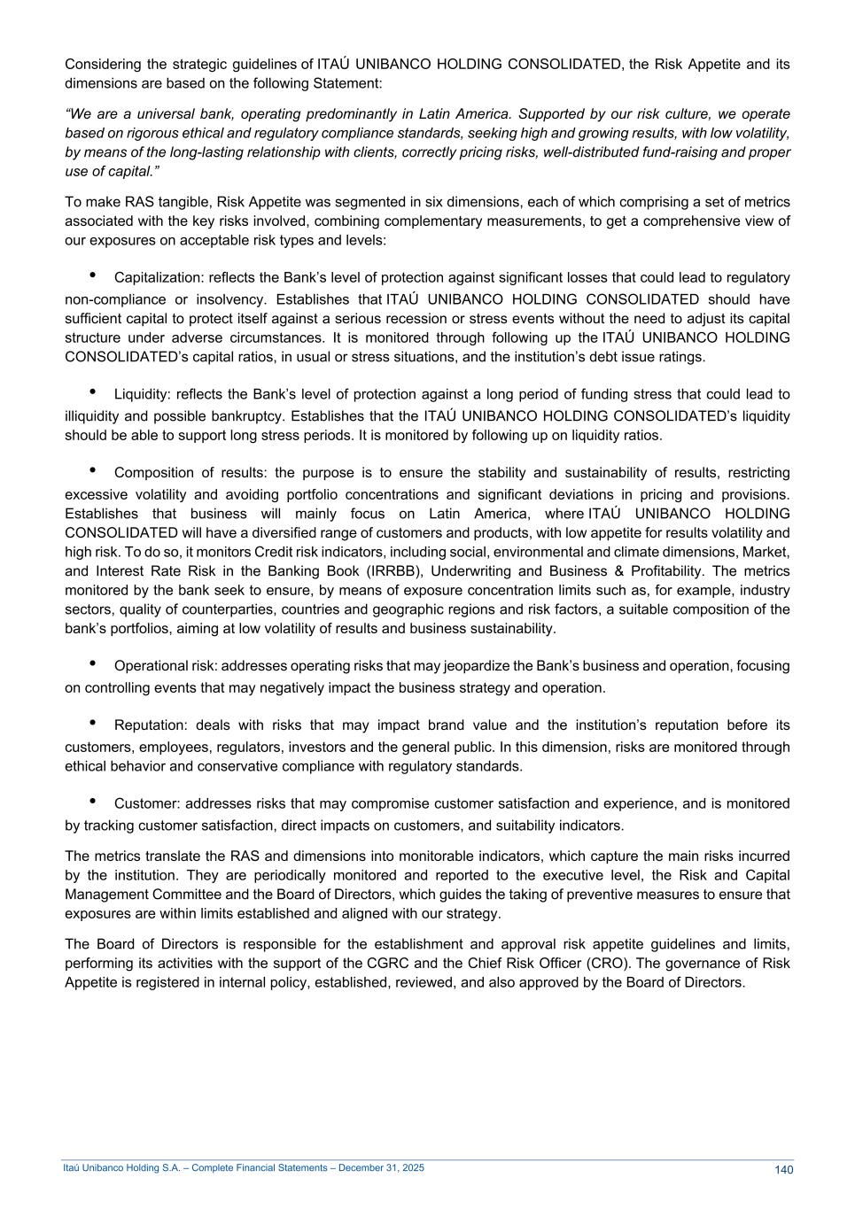 Itaú Unibanco Holding S.A. – Complete Financial Statements – December 31, 2025 Considering the strategic guidelines of ITAÚ UNIBANCO HOLDING CONSOLIDATED, the Risk Appetite and its dimensions are based on the following Statement: “We are a universal bank, operating predominantly in Latin America. Supported by our risk culture, we operate based on rigorous ethical and regulatory compliance standards, seeking high and growing results, with low volatility, by means of the long-lasting relationship with clients, correctly pricing risks, well-distributed fund-raising and proper use of capital.” To make RAS tangible, Risk Appetite was segmented in six dimensions, each of which comprising a set of metrics associated with the key risks involved, combining complementary measurements, to get a comprehensive view of our exposures on acceptable risk types and levels: • Capitalization: reflects the Bank’s level of protection against significant losses that could lead to regulatory non-compliance or insolvency. Establishes that ITAÚ UNIBANCO HOLDING CONSOLIDATED should have sufficient capital to protect itself against a serious recession or stress events without the need to adjust its capital structure under adverse circumstances. It is monitored through following up the ITAÚ UNIBANCO HOLDING CONSOLIDATED’s capital ratios, in usual or stress situations, and the institution’s debt issue ratings. • Liquidity: reflects the Bank’s level of protection against a long period of funding stress that could lead to illiquidity and possible bankruptcy. Establishes that the ITAÚ UNIBANCO HOLDING CONSOLIDATED’s liquidity should be able to support long stress periods. It is monitored by following up on liquidity ratios. • Composition of results: the purpose is to ensure the stability and sustainability of results, restricting excessive volatility and avoiding portfolio concentrations and significant deviations in pricing and provisions. Establishes that business will mainly focus on Latin America, where ITAÚ UNIBANCO HOLDING CONSOLIDATED will have a diversified range of customers and products, with low appetite for results volatility and high risk. To do so, it monitors Credit risk indicators, including social, environmental and climate dimensions, Market, and Interest Rate Risk in the Banking Book (IRRBB), Underwriting and Business & Profitability. The metrics monitored by the bank seek to ensure, by means of exposure concentration limits such as, for example, industry sectors, quality of counterparties, countries and geographic regions and risk factors, a suitable composition of the bank’s portfolios, aiming at low volatility of results and business sustainability. • Operational risk: addresses operating risks that may jeopardize the Bank’s business and operation, focusing on controlling events that may negatively impact the business strategy and operation. • Reputation: deals with risks that may impact brand value and the institution’s reputation before its customers, employees, regulators, investors and the general public. In this dimension, risks are monitored through ethical behavior and conservative compliance with regulatory standards. • Customer: addresses risks that may compromise customer satisfaction and experience, and is monitored by tracking customer satisfaction, direct impacts on customers, and suitability indicators. The metrics translate the RAS and dimensions into monitorable indicators, which capture the main risks incurred by the institution. They are periodically monitored and reported to the executive level, the Risk and Capital Management Committee and the Board of Directors, which guides the taking of preventive measures to ensure that exposures are within limits established and aligned with our strategy. The Board of Directors is responsible for the establishment and approval risk appetite guidelines and limits, performing its activities with the support of the CGRC and the Chief Risk Officer (CRO). The governance of Risk Appetite is registered in internal policy, established, reviewed, and also approved by the Board of Directors. 140