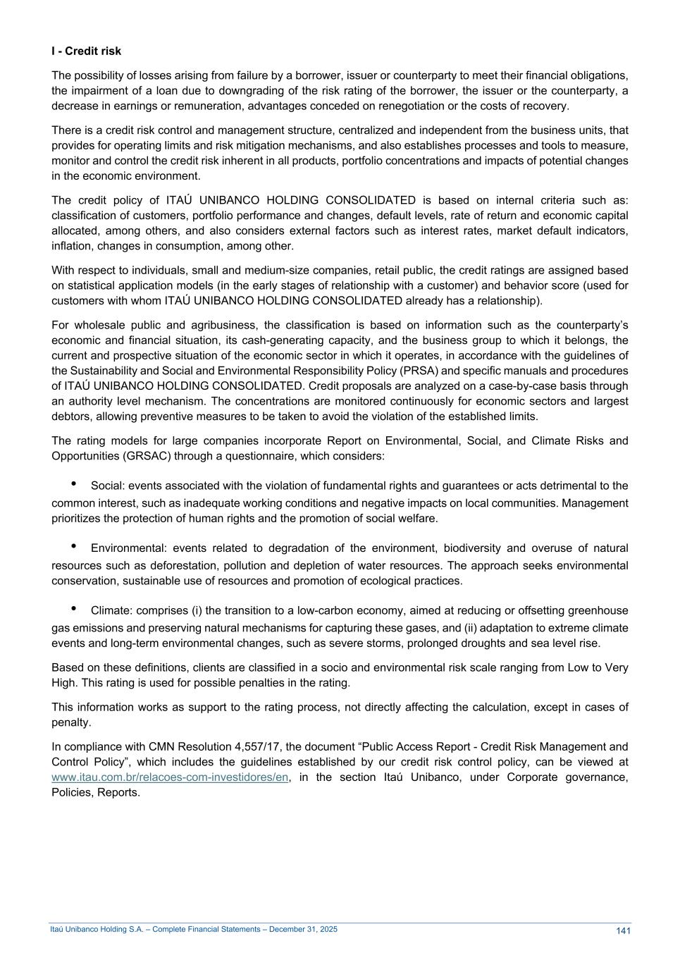 Itaú Unibanco Holding S.A. – Complete Financial Statements – December 31, 2025 I - Credit risk The possibility of losses arising from failure by a borrower, issuer or counterparty to meet their financial obligations, the impairment of a loan due to downgrading of the risk rating of the borrower, the issuer or the counterparty, a decrease in earnings or remuneration, advantages conceded on renegotiation or the costs of recovery. There is a credit risk control and management structure, centralized and independent from the business units, that provides for operating limits and risk mitigation mechanisms, and also establishes processes and tools to measure, monitor and control the credit risk inherent in all products, portfolio concentrations and impacts of potential changes in the economic environment. The credit policy of ITAÚ UNIBANCO HOLDING CONSOLIDATED is based on internal criteria such as: classification of customers, portfolio performance and changes, default levels, rate of return and economic capital allocated, among others, and also considers external factors such as interest rates, market default indicators, inflation, changes in consumption, among other. With respect to individuals, small and medium-size companies, retail public, the credit ratings are assigned based on statistical application models (in the early stages of relationship with a customer) and behavior score (used for customers with whom ITAÚ UNIBANCO HOLDING CONSOLIDATED already has a relationship). For wholesale public and agribusiness, the classification is based on information such as the counterparty’s economic and financial situation, its cash-generating capacity, and the business group to which it belongs, the current and prospective situation of the economic sector in which it operates, in accordance with the guidelines of the Sustainability and Social and Environmental Responsibility Policy (PRSA) and specific manuals and procedures of ITAÚ UNIBANCO HOLDING CONSOLIDATED. Credit proposals are analyzed on a case-by-case basis through an authority level mechanism. The concentrations are monitored continuously for economic sectors and largest debtors, allowing preventive measures to be taken to avoid the violation of the established limits. The rating models for large companies incorporate Report on Environmental, Social, and Climate Risks and Opportunities (GRSAC) through a questionnaire, which considers: • Social: events associated with the violation of fundamental rights and guarantees or acts detrimental to the common interest, such as inadequate working conditions and negative impacts on local communities. Management prioritizes the protection of human rights and the promotion of social welfare. • Environmental: events related to degradation of the environment, biodiversity and overuse of natural resources such as deforestation, pollution and depletion of water resources. The approach seeks environmental conservation, sustainable use of resources and promotion of ecological practices. • Climate: comprises (i) the transition to a low-carbon economy, aimed at reducing or offsetting greenhouse gas emissions and preserving natural mechanisms for capturing these gases, and (ii) adaptation to extreme climate events and long-term environmental changes, such as severe storms, prolonged droughts and sea level rise. Based on these definitions, clients are classified in a socio and environmental risk scale ranging from Low to Very High. This rating is used for possible penalties in the rating. This information works as support to the rating process, not directly affecting the calculation, except in cases of penalty. In compliance with CMN Resolution 4,557/17, the document “Public Access Report - Credit Risk Management and Control Policy”, which includes the guidelines established by our credit risk control policy, can be viewed at www.itau.com.br/relacoes-com-investidores/en, in the section Itaú Unibanco, under Corporate governance, Policies, Reports. 141