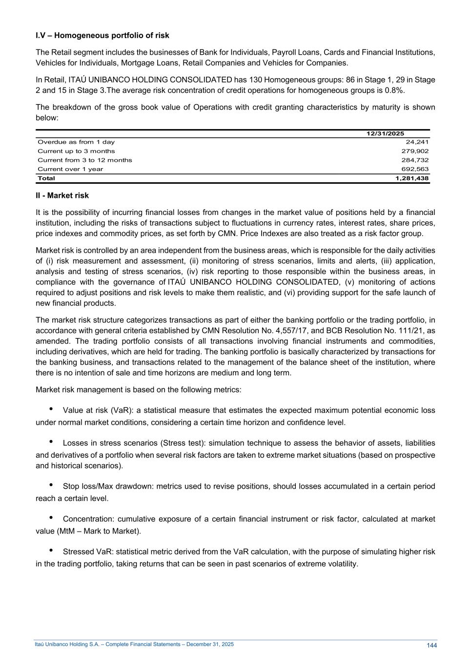 Itaú Unibanco Holding S.A. – Complete Financial Statements – December 31, 2025 I.V – Homogeneous portfolio of risk The Retail segment includes the businesses of Bank for Individuals, Payroll Loans, Cards and Financial Institutions, Vehicles for Individuals, Mortgage Loans, Retail Companies and Vehicles for Companies. In Retail, ITAÚ UNIBANCO HOLDING CONSOLIDATED has 130 Homogeneous groups: 86 in Stage 1, 29 in Stage 2 and 15 in Stage 3.The average risk concentration of credit operations for homogeneous groups is 0.8%. The breakdown of the gross book value of Operations with credit granting characteristics by maturity is shown below: 12/31/2025 Overdue as from 1 day 24,241 Current up to 3 months 279,902 Current from 3 to 12 months 284,732 Current over 1 year 692,563 Total 1,281,438 II - Market risk It is the possibility of incurring financial losses from changes in the market value of positions held by a financial institution, including the risks of transactions subject to fluctuations in currency rates, interest rates, share prices, price indexes and commodity prices, as set forth by CMN. Price Indexes are also treated as a risk factor group. Market risk is controlled by an area independent from the business areas, which is responsible for the daily activities of (i) risk measurement and assessment, (ii) monitoring of stress scenarios, limits and alerts, (iii) application, analysis and testing of stress scenarios, (iv) risk reporting to those responsible within the business areas, in compliance with the governance of ITAÚ UNIBANCO HOLDING CONSOLIDATED, (v) monitoring of actions required to adjust positions and risk levels to make them realistic, and (vi) providing support for the safe launch of new financial products. The market risk structure categorizes transactions as part of either the banking portfolio or the trading portfolio, in accordance with general criteria established by CMN Resolution No. 4,557/17, and BCB Resolution No. 111/21, as amended. The trading portfolio consists of all transactions involving financial instruments and commodities, including derivatives, which are held for trading. The banking portfolio is basically characterized by transactions for the banking business, and transactions related to the management of the balance sheet of the institution, where there is no intention of sale and time horizons are medium and long term. Market risk management is based on the following metrics: • Value at risk (VaR): a statistical measure that estimates the expected maximum potential economic loss under normal market conditions, considering a certain time horizon and confidence level. • Losses in stress scenarios (Stress test): simulation technique to assess the behavior of assets, liabilities and derivatives of a portfolio when several risk factors are taken to extreme market situations (based on prospective and historical scenarios). • Stop loss/Max drawdown: metrics used to revise positions, should losses accumulated in a certain period reach a certain level. • Concentration: cumulative exposure of a certain financial instrument or risk factor, calculated at market value (MtM – Mark to Market). • Stressed VaR: statistical metric derived from the VaR calculation, with the purpose of simulating higher risk in the trading portfolio, taking returns that can be seen in past scenarios of extreme volatility. 144