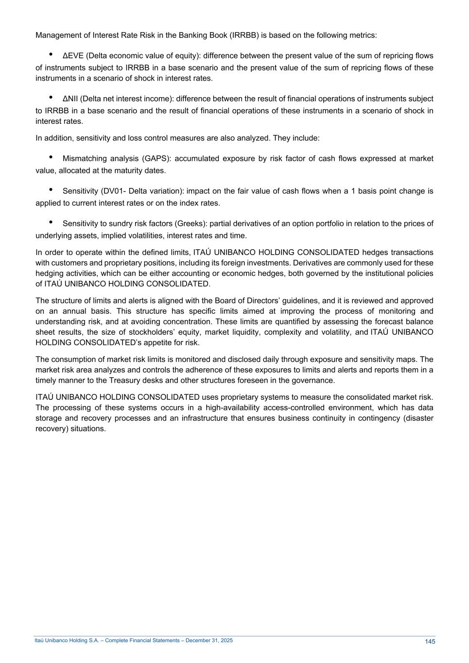 Itaú Unibanco Holding S.A. – Complete Financial Statements – December 31, 2025 Management of Interest Rate Risk in the Banking Book (IRRBB) is based on the following metrics: • ΔEVE (Delta economic value of equity): difference between the present value of the sum of repricing flows of instruments subject to IRRBB in a base scenario and the present value of the sum of repricing flows of these instruments in a scenario of shock in interest rates. • ΔNII (Delta net interest income): difference between the result of financial operations of instruments subject to IRRBB in a base scenario and the result of financial operations of these instruments in a scenario of shock in interest rates. In addition, sensitivity and loss control measures are also analyzed. They include: • Mismatching analysis (GAPS): accumulated exposure by risk factor of cash flows expressed at market value, allocated at the maturity dates. • Sensitivity (DV01- Delta variation): impact on the fair value of cash flows when a 1 basis point change is applied to current interest rates or on the index rates. • Sensitivity to sundry risk factors (Greeks): partial derivatives of an option portfolio in relation to the prices of underlying assets, implied volatilities, interest rates and time. In order to operate within the defined limits, ITAÚ UNIBANCO HOLDING CONSOLIDATED hedges transactions with customers and proprietary positions, including its foreign investments. Derivatives are commonly used for these hedging activities, which can be either accounting or economic hedges, both governed by the institutional policies of ITAÚ UNIBANCO HOLDING CONSOLIDATED. The structure of limits and alerts is aligned with the Board of Directors’ guidelines, and it is reviewed and approved on an annual basis. This structure has specific limits aimed at improving the process of monitoring and understanding risk, and at avoiding concentration. These limits are quantified by assessing the forecast balance sheet results, the size of stockholders’ equity, market liquidity, complexity and volatility, and ITAÚ UNIBANCO HOLDING CONSOLIDATED’s appetite for risk. The consumption of market risk limits is monitored and disclosed daily through exposure and sensitivity maps. The market risk area analyzes and controls the adherence of these exposures to limits and alerts and reports them in a timely manner to the Treasury desks and other structures foreseen in the governance. ITAÚ UNIBANCO HOLDING CONSOLIDATED uses proprietary systems to measure the consolidated market risk. The processing of these systems occurs in a high-availability access-controlled environment, which has data storage and recovery processes and an infrastructure that ensures business continuity in contingency (disaster recovery) situations. 145