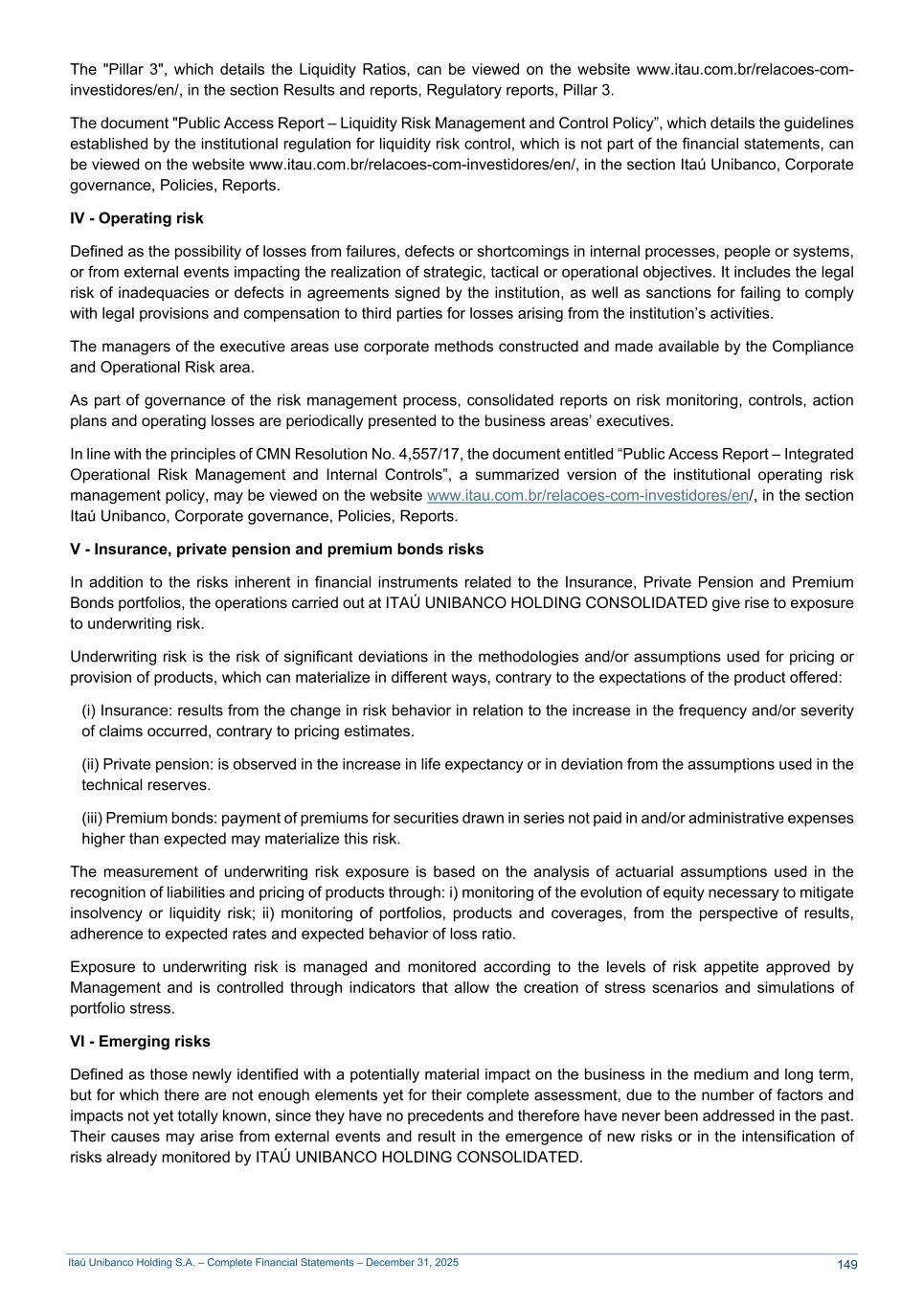 Itaú Unibanco Holding S.A. – Complete Financial Statements – December 31, 2025 The "Pillar 3", which details the Liquidity Ratios, can be viewed on the website www.itau.com.br/relacoes-com- investidores/en/, in the section Results and reports, Regulatory reports, Pillar 3. The document "Public Access Report – Liquidity Risk Management and Control Policy”, which details the guidelines established by the institutional regulation for liquidity risk control, which is not part of the financial statements, can be viewed on the website www.itau.com.br/relacoes-com-investidores/en/, in the section Itaú Unibanco, Corporate governance, Policies, Reports. IV - Operating risk Defined as the possibility of losses from failures, defects or shortcomings in internal processes, people or systems, or from external events impacting the realization of strategic, tactical or operational objectives. It includes the legal risk of inadequacies or defects in agreements signed by the institution, as well as sanctions for failing to comply with legal provisions and compensation to third parties for losses arising from the institution’s activities. The managers of the executive areas use corporate methods constructed and made available by the Compliance and Operational Risk area. As part of governance of the risk management process, consolidated reports on risk monitoring, controls, action plans and operating losses are periodically presented to the business areas’ executives. In line with the principles of CMN Resolution No. 4,557/17, the document entitled “Public Access Report – Integrated Operational Risk Management and Internal Controls”, a summarized version of the institutional operating risk management policy, may be viewed on the website www.itau.com.br/relacoes-com-investidores/en/, in the section Itaú Unibanco, Corporate governance, Policies, Reports. V - Insurance, private pension and premium bonds risks In addition to the risks inherent in financial instruments related to the Insurance, Private Pension and Premium Bonds portfolios, the operations carried out at ITAÚ UNIBANCO HOLDING CONSOLIDATED give rise to exposure to underwriting risk. Underwriting risk is the risk of significant deviations in the methodologies and/or assumptions used for pricing or provision of products, which can materialize in different ways, contrary to the expectations of the product offered: (i) Insurance: results from the change in risk behavior in relation to the increase in the frequency and/or severity of claims occurred, contrary to pricing estimates. (ii) Private pension: is observed in the increase in life expectancy or in deviation from the assumptions used in the technical reserves. (iii) Premium bonds: payment of premiums for securities drawn in series not paid in and/or administrative expenses higher than expected may materialize this risk. The measurement of underwriting risk exposure is based on the analysis of actuarial assumptions used in the recognition of liabilities and pricing of products through: i) monitoring of the evolution of equity necessary to mitigate insolvency or liquidity risk; ii) monitoring of portfolios, products and coverages, from the perspective of results, adherence to expected rates and expected behavior of loss ratio. Exposure to underwriting risk is managed and monitored according to the levels of risk appetite approved by Management and is controlled through indicators that allow the creation of stress scenarios and simulations of portfolio stress. VI - Emerging risks Defined as those newly identified with a potentially material impact on the business in the medium and long term, but for which there are not enough elements yet for their complete assessment, due to the number of factors and impacts not yet totally known, since they have no precedents and therefore have never been addressed in the past. Their causes may arise from external events and result in the emergence of new risks or in the intensification of risks already monitored by ITAÚ UNIBANCO HOLDING CONSOLIDATED. 149