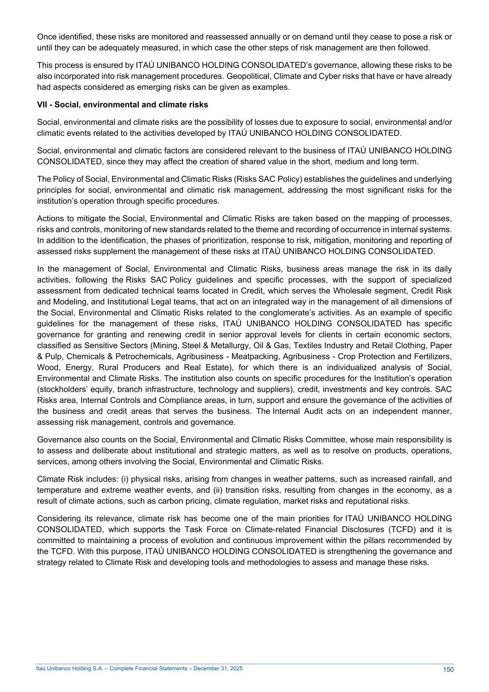 Itaú Unibanco Holding S.A. – Complete Financial Statements – December 31, 2025 Once identified, these risks are monitored and reassessed annually or on demand until they cease to pose a risk or until they can be adequately measured, in which case the other steps of risk management are then followed. This process is ensured by ITAÚ UNIBANCO HOLDING CONSOLIDATED’s governance, allowing these risks to be also incorporated into risk management procedures. Geopolitical, Climate and Cyber risks that have or have already had aspects considered as emerging risks can be given as examples. VII - Social, environmental and climate risks Social, environmental and climate risks are the possibility of losses due to exposure to social, environmental and/or climatic events related to the activities developed by ITAÚ UNIBANCO HOLDING CONSOLIDATED. Social, environmental and climatic factors are considered relevant to the business of ITAÚ UNIBANCO HOLDING CONSOLIDATED, since they may affect the creation of shared value in the short, medium and long term. The Policy of Social, Environmental and Climatic Risks (Risks SAC Policy) establishes the guidelines and underlying principles for social, environmental and climatic risk management, addressing the most significant risks for the institution’s operation through specific procedures. Actions to mitigate the Social, Environmental and Climatic Risks are taken based on the mapping of processes, risks and controls, monitoring of new standards related to the theme and recording of occurrence in internal systems. In addition to the identification, the phases of prioritization, response to risk, mitigation, monitoring and reporting of assessed risks supplement the management of these risks at ITAÚ UNIBANCO HOLDING CONSOLIDATED. In the management of Social, Environmental and Climatic Risks, business areas manage the risk in its daily activities, following the Risks SAC Policy guidelines and specific processes, with the support of specialized assessment from dedicated technical teams located in Credit, which serves the Wholesale segment, Credit Risk and Modeling, and Institutional Legal teams, that act on an integrated way in the management of all dimensions of the Social, Environmental and Climatic Risks related to the conglomerate’s activities. As an example of specific guidelines for the management of these risks, ITAÚ UNIBANCO HOLDING CONSOLIDATED has specific governance for granting and renewing credit in senior approval levels for clients in certain economic sectors, classified as Sensitive Sectors (Mining, Steel & Metallurgy, Oil & Gas, Textiles Industry and Retail Clothing, Paper & Pulp, Chemicals & Petrochemicals, Agribusiness - Meatpacking, Agribusiness - Crop Protection and Fertilizers, Wood, Energy, Rural Producers and Real Estate), for which there is an individualized analysis of Social, Environmental and Climate Risks. The institution also counts on specific procedures for the Institution’s operation (stockholders’ equity, branch infrastructure, technology and suppliers), credit, investments and key controls. SAC Risks area, Internal Controls and Compliance areas, in turn, support and ensure the governance of the activities of the business and credit areas that serves the business. The Internal Audit acts on an independent manner, assessing risk management, controls and governance. Governance also counts on the Social, Environmental and Climatic Risks Committee, whose main responsibility is to assess and deliberate about institutional and strategic matters, as well as to resolve on products, operations, services, among others involving the Social, Environmental and Climatic Risks. Climate Risk includes: (i) physical risks, arising from changes in weather patterns, such as increased rainfall, and temperature and extreme weather events, and (ii) transition risks, resulting from changes in the economy, as a result of climate actions, such as carbon pricing, climate regulation, market risks and reputational risks. Considering its relevance, climate risk has become one of the main priorities for ITAÚ UNIBANCO HOLDING CONSOLIDATED, which supports the Task Force on Climate-related Financial Disclosures (TCFD) and it is committed to maintaining a process of evolution and continuous improvement within the pillars recommended by the TCFD. With this purpose, ITAÚ UNIBANCO HOLDING CONSOLIDATED is strengthening the governance and strategy related to Climate Risk and developing tools and methodologies to assess and manage these risks. 150