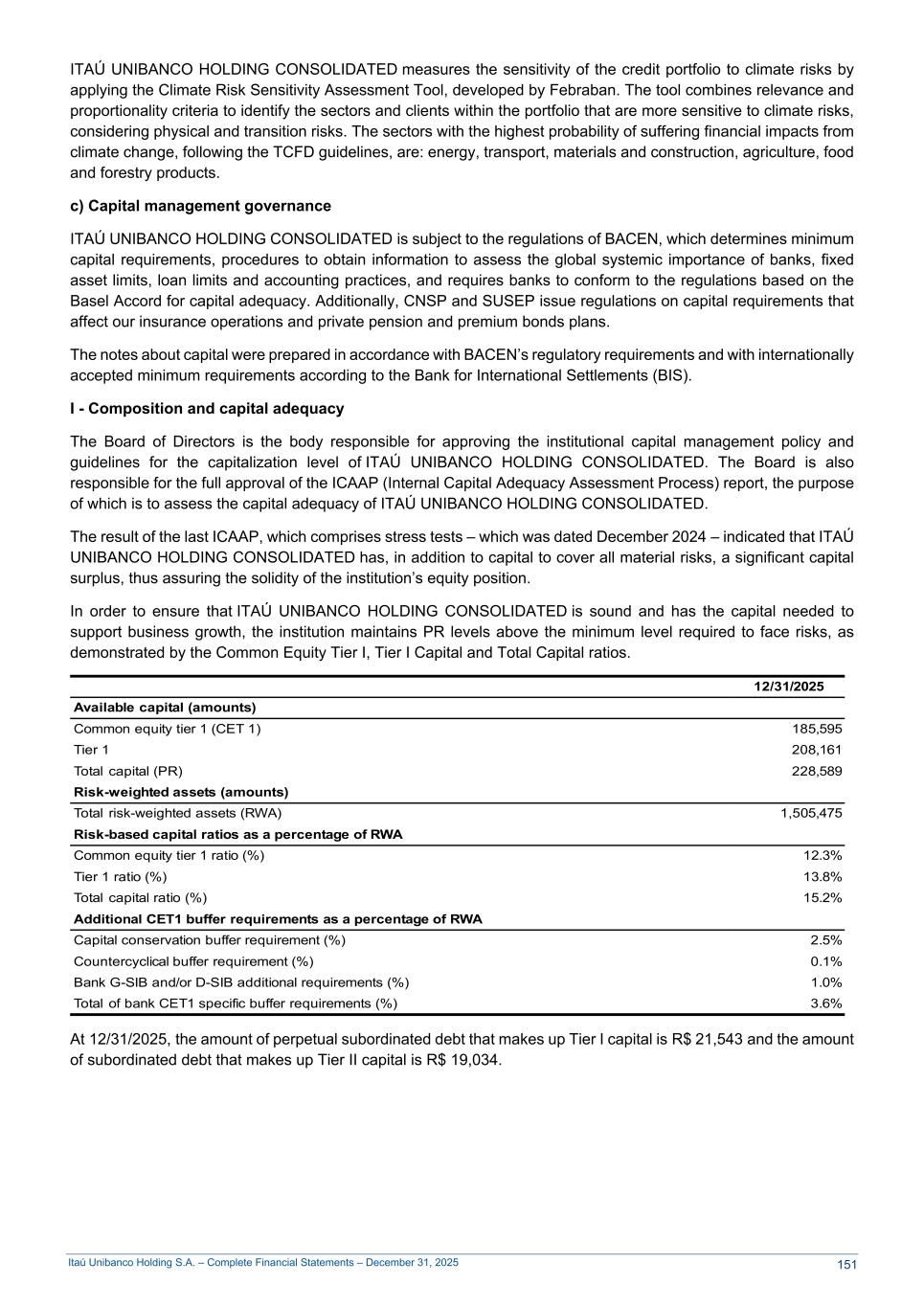 Itaú Unibanco Holding S.A. – Complete Financial Statements – December 31, 2025 ITAÚ UNIBANCO HOLDING CONSOLIDATED measures the sensitivity of the credit portfolio to climate risks by applying the Climate Risk Sensitivity Assessment Tool, developed by Febraban. The tool combines relevance and proportionality criteria to identify the sectors and clients within the portfolio that are more sensitive to climate risks, considering physical and transition risks. The sectors with the highest probability of suffering financial impacts from climate change, following the TCFD guidelines, are: energy, transport, materials and construction, agriculture, food and forestry products. c) Capital management governance ITAÚ UNIBANCO HOLDING CONSOLIDATED is subject to the regulations of BACEN, which determines minimum capital requirements, procedures to obtain information to assess the global systemic importance of banks, fixed asset limits, loan limits and accounting practices, and requires banks to conform to the regulations based on the Basel Accord for capital adequacy. Additionally, CNSP and SUSEP issue regulations on capital requirements that affect our insurance operations and private pension and premium bonds plans. The notes about capital were prepared in accordance with BACEN’s regulatory requirements and with internationally accepted minimum requirements according to the Bank for International Settlements (BIS). I - Composition and capital adequacy The Board of Directors is the body responsible for approving the institutional capital management policy and guidelines for the capitalization level of ITAÚ UNIBANCO HOLDING CONSOLIDATED. The Board is also responsible for the full approval of the ICAAP (Internal Capital Adequacy Assessment Process) report, the purpose of which is to assess the capital adequacy of ITAÚ UNIBANCO HOLDING CONSOLIDATED. The result of the last ICAAP, which comprises stress tests – which was dated December 2024 – indicated that ITAÚ UNIBANCO HOLDING CONSOLIDATED has, in addition to capital to cover all material risks, a significant capital surplus, thus assuring the solidity of the institution’s equity position. In order to ensure that ITAÚ UNIBANCO HOLDING CONSOLIDATED is sound and has the capital needed to support business growth, the institution maintains PR levels above the minimum level required to face risks, as demonstrated by the Common Equity Tier I, Tier I Capital and Total Capital ratios. 12/31/2025 Available capital (amounts) Common equity tier 1 (CET 1) 185,595 Tier 1 208,161 Total capital (PR) 228,589 Risk-weighted assets (amounts) Total risk-weighted assets (RWA) 1,505,475 Risk-based capital ratios as a percentage of RWA Common equity tier 1 ratio (%) 12.3% Tier 1 ratio (%) 13.8% Total capital ratio (%) 15.2% Additional CET1 buffer requirements as a percentage of RWA Capital conservation buffer requirement (%) 2.5% Countercyclical buffer requirement (%) 0.1% Bank G-SIB and/or D-SIB additional requirements (%) 1.0% Total of bank CET1 specific buffer requirements (%) 3.6% At 12/31/2025, the amount of perpetual subordinated debt that makes up Tier I capital is R$ 21,543 and the amount of subordinated debt that makes up Tier II capital is R$ 19,034. 151