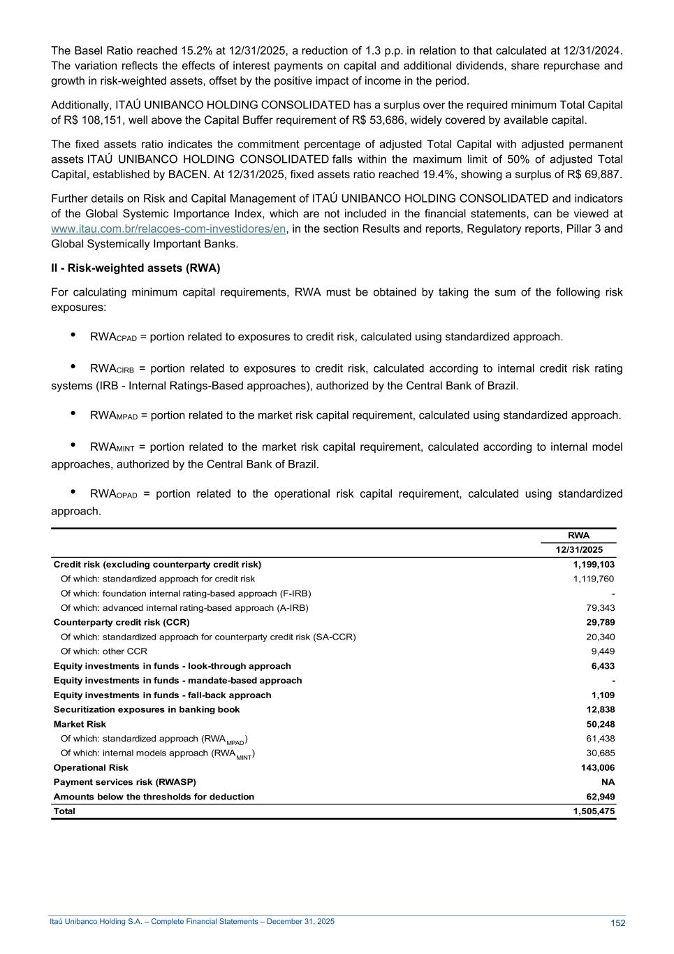 Itaú Unibanco Holding S.A. – Complete Financial Statements – December 31, 2025 The Basel Ratio reached 15.2% at 12/31/2025, a reduction of 1.3 p.p. in relation to that calculated at 12/31/2024. The variation reflects the effects of interest payments on capital and additional dividends, share repurchase and growth in risk-weighted assets, offset by the positive impact of income in the period. Additionally, ITAÚ UNIBANCO HOLDING CONSOLIDATED has a surplus over the required minimum Total Capital of R$ 108,151, well above the Capital Buffer requirement of R$ 53,686, widely covered by available capital. The fixed assets ratio indicates the commitment percentage of adjusted Total Capital with adjusted permanent assets ITAÚ UNIBANCO HOLDING CONSOLIDATED falls within the maximum limit of 50% of adjusted Total Capital, established by BACEN. At 12/31/2025, fixed assets ratio reached 19.4%, showing a surplus of R$ 69,887. Further details on Risk and Capital Management of ITAÚ UNIBANCO HOLDING CONSOLIDATED and indicators of the Global Systemic Importance Index, which are not included in the financial statements, can be viewed at www.itau.com.br/relacoes-com-investidores/en, in the section Results and reports, Regulatory reports, Pillar 3 and Global Systemically Important Banks. II - Risk-weighted assets (RWA) For calculating minimum capital requirements, RWA must be obtained by taking the sum of the following risk exposures: • RWACPAD = portion related to exposures to credit risk, calculated using standardized approach. • RWACIRB = portion related to exposures to credit risk, calculated according to internal credit risk rating systems (IRB - Internal Ratings-Based approaches), authorized by the Central Bank of Brazil. • RWAMPAD = portion related to the market risk capital requirement, calculated using standardized approach. • RWAMINT = portion related to the market risk capital requirement, calculated according to internal model approaches, authorized by the Central Bank of Brazil. • RWAOPAD = portion related to the operational risk capital requirement, calculated using standardized approach. RWA 12/31/2025 Credit risk (excluding counterparty credit risk) 1,199,103 Of which: standardized approach for credit risk 1,119,760 Of which: foundation internal rating-based approach (F-IRB) - Of which: advanced internal rating-based approach (A-IRB) 79,343 Counterparty credit risk (CCR) 29,789 Of which: standardized approach for counterparty credit risk (SA-CCR) 20,340 Of which: other CCR 9,449 Equity investments in funds - look-through approach 6,433 Equity investments in funds - mandate-based approach - Equity investments in funds - fall-back approach 1,109 Securitization exposures in banking book 12,838 Market Risk 50,248 Of which: standardized approach (RWAMPAD) 61,438 Of which: internal models approach (RWAMINT) 30,685 Operational Risk 143,006 Payment services risk (RWASP) NA Amounts below the thresholds for deduction 62,949 Total 1,505,475 152