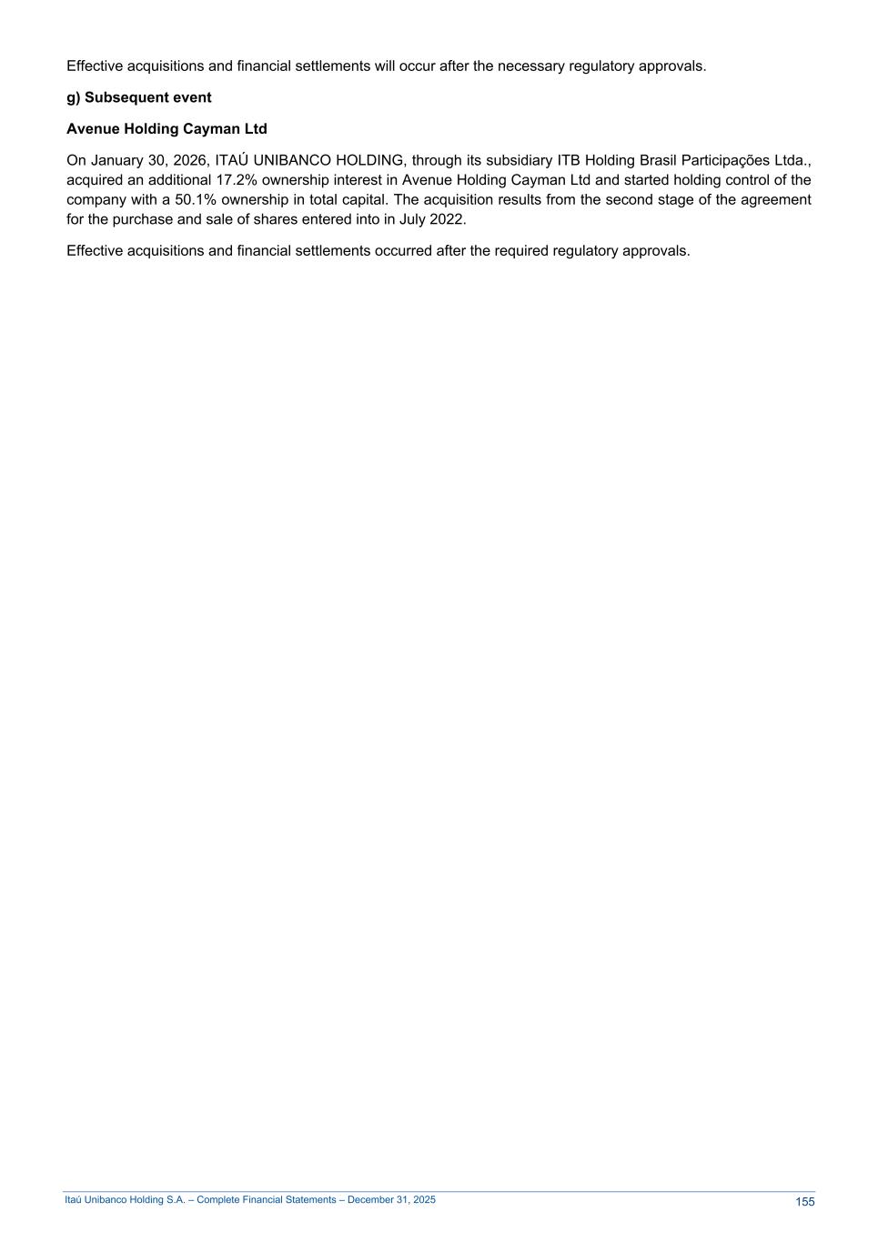 Itaú Unibanco Holding S.A. – Complete Financial Statements – December 31, 2025 Effective acquisitions and financial settlements will occur after the necessary regulatory approvals. g) Subsequent event Avenue Holding Cayman Ltd On January 30, 2026, ITAÚ UNIBANCO HOLDING, through its subsidiary ITB Holding Brasil Participações Ltda., acquired an additional 17.2% ownership interest in Avenue Holding Cayman Ltd and started holding control of the company with a 50.1% ownership in total capital. The acquisition results from the second stage of the agreement for the purchase and sale of shares entered into in July 2022. Effective acquisitions and financial settlements occurred after the required regulatory approvals. 155