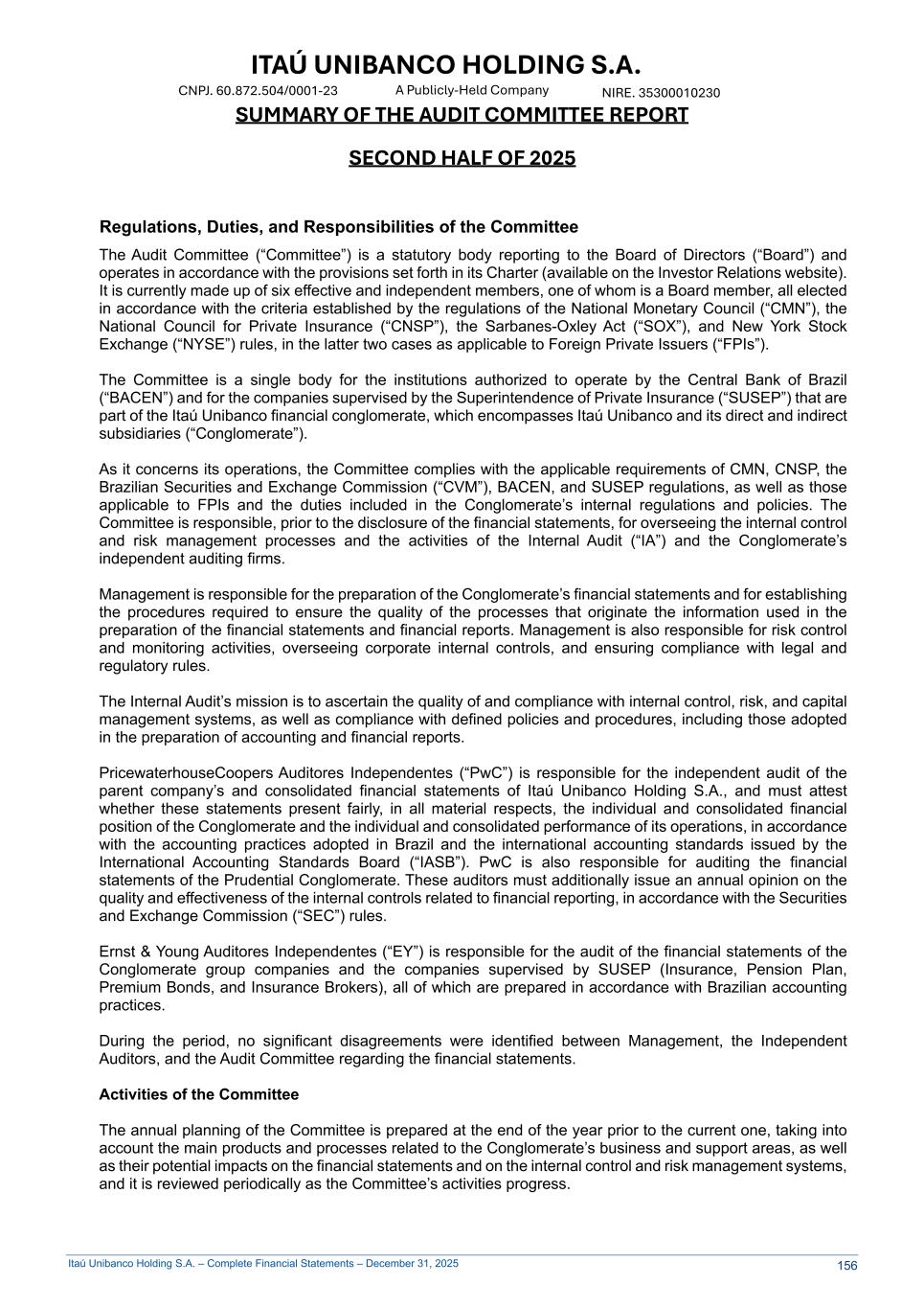 Itaú Unibanco Holding S.A. – Complete Financial Statements – December 31, 2025 ITAÚ UNIBANCO HOLDING S.A. NIRE. 35300010230 A Publicly-Held Company CNPJ. 60.872.504/0001-23 SUMMARY OF THE AUDIT COMMITTEE REPORT SECOND HALF OF 2025 Regulations, Duties, and Responsibilities of the Committee The Audit Committee (“Committee”) is a statutory body reporting to the Board of Directors (“Board”) and operates in accordance with the provisions set forth in its Charter (available on the Investor Relations website). It is currently made up of six effective and independent members, one of whom is a Board member, all elected in accordance with the criteria established by the regulations of the National Monetary Council (“CMN”), the National Council for Private Insurance (“CNSP”), the Sarbanes-Oxley Act (“SOX”), and New York Stock Exchange (“NYSE”) rules, in the latter two cases as applicable to Foreign Private Issuers (“FPIs”). The Committee is a single body for the institutions authorized to operate by the Central Bank of Brazil (“BACEN”) and for the companies supervised by the Superintendence of Private Insurance (“SUSEP”) that are part of the Itaú Unibanco financial conglomerate, which encompasses Itaú Unibanco and its direct and indirect subsidiaries (“Conglomerate”). As it concerns its operations, the Committee complies with the applicable requirements of CMN, CNSP, the Brazilian Securities and Exchange Commission (“CVM”), BACEN, and SUSEP regulations, as well as those applicable to FPIs and the duties included in the Conglomerate’s internal regulations and policies. The Committee is responsible, prior to the disclosure of the financial statements, for overseeing the internal control and risk management processes and the activities of the Internal Audit (“IA”) and the Conglomerate’s independent auditing firms. Management is responsible for the preparation of the Conglomerate’s financial statements and for establishing the procedures required to ensure the quality of the processes that originate the information used in the preparation of the financial statements and financial reports. Management is also responsible for risk control and monitoring activities, overseeing corporate internal controls, and ensuring compliance with legal and regulatory rules. The Internal Audit’s mission is to ascertain the quality of and compliance with internal control, risk, and capital management systems, as well as compliance with defined policies and procedures, including those adopted in the preparation of accounting and financial reports. PricewaterhouseCoopers Auditores Independentes (“PwC”) is responsible for the independent audit of the parent company’s and consolidated financial statements of Itaú Unibanco Holding S.A., and must attest whether these statements present fairly, in all material respects, the individual and consolidated financial position of the Conglomerate and the individual and consolidated performance of its operations, in accordance with the accounting practices adopted in Brazil and the international accounting standards issued by the International Accounting Standards Board (“IASB”). PwC is also responsible for auditing the financial statements of the Prudential Conglomerate. These auditors must additionally issue an annual opinion on the quality and effectiveness of the internal controls related to financial reporting, in accordance with the Securities and Exchange Commission (“SEC”) rules. Ernst & Young Auditores Independentes (“EY”) is responsible for the audit of the financial statements of the Conglomerate group companies and the companies supervised by SUSEP (Insurance, Pension Plan, Premium Bonds, and Insurance Brokers), all of which are prepared in accordance with Brazilian accounting practices. During the period, no significant disagreements were identified between Management, the Independent Auditors, and the Audit Committee regarding the financial statements. Activities of the Committee The annual planning of the Committee is prepared at the end of the year prior to the current one, taking into account the main products and processes related to the Conglomerate’s business and support areas, as well as their potential impacts on the financial statements and on the internal control and risk management systems, and it is reviewed periodically as the Committee’s activities progress. 156