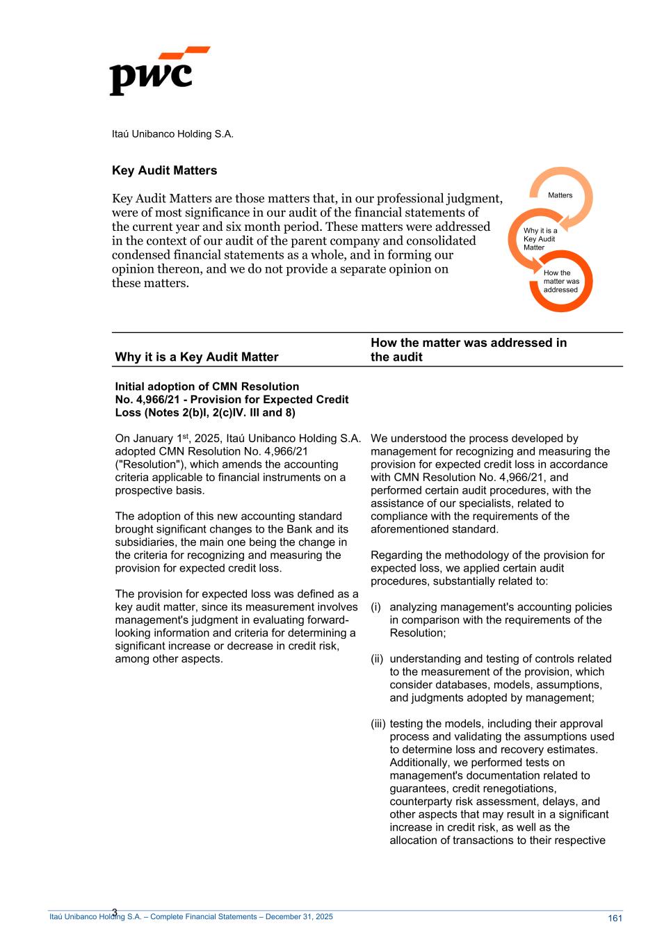 Itaú Unibanco Holding S.A. – Complete Financial Statements – December 31, 2025 Itaú Unibanco Holding S.A. 3 Key Audit Matters Key Audit Matters are those matters that, in our professional judgment, were of most significance in our audit of the financial statements of the current year and six month period. These matters were addressed in the context of our audit of the parent company and consolidated condensed financial statements as a whole, and in forming our opinion thereon, and we do not provide a separate opinion on these matters. Why it is a Key Audit Matter How the matter was addressed in the audit Initial adoption of CMN Resolution No. 4,966/21 - Provision for Expected Credit Loss (Notes 2(b)I, 2(c)IV. III and 8) On January 1st, 2025, Itaú Unibanco Holding S.A. adopted CMN Resolution No. 4,966/21 ("Resolution"), which amends the accounting criteria applicable to financial instruments on a prospective basis. The adoption of this new accounting standard brought significant changes to the Bank and its subsidiaries, the main one being the change in the criteria for recognizing and measuring the provision for expected credit loss. The provision for expected loss was defined as a key audit matter, since its measurement involves management's judgment in evaluating forward- looking information and criteria for determining a significant increase or decrease in credit risk, among other aspects. We understood the process developed by management for recognizing and measuring the provision for expected credit loss in accordance with CMN Resolution No. 4,966/21, and performed certain audit procedures, with the assistance of our specialists, related to compliance with the requirements of the aforementioned standard. Regarding the methodology of the provision for expected loss, we applied certain audit procedures, substantially related to: (i) analyzing management's accounting policies in comparison with the requirements of the Resolution; (ii) understanding and testing of controls related to the measurement of the provision, which consider databases, models, assumptions, and judgments adopted by management; (iii) testing the models, including their approval process and validating the assumptions used to determine loss and recovery estimates. Additionally, we performed tests on management's documentation related to guarantees, credit renegotiations, counterparty risk assessment, delays, and other aspects that may result in a significant increase in credit risk, as well as the allocation of transactions to their respective Matters Why it is a Key Audit Matter How the matter was addressed 161