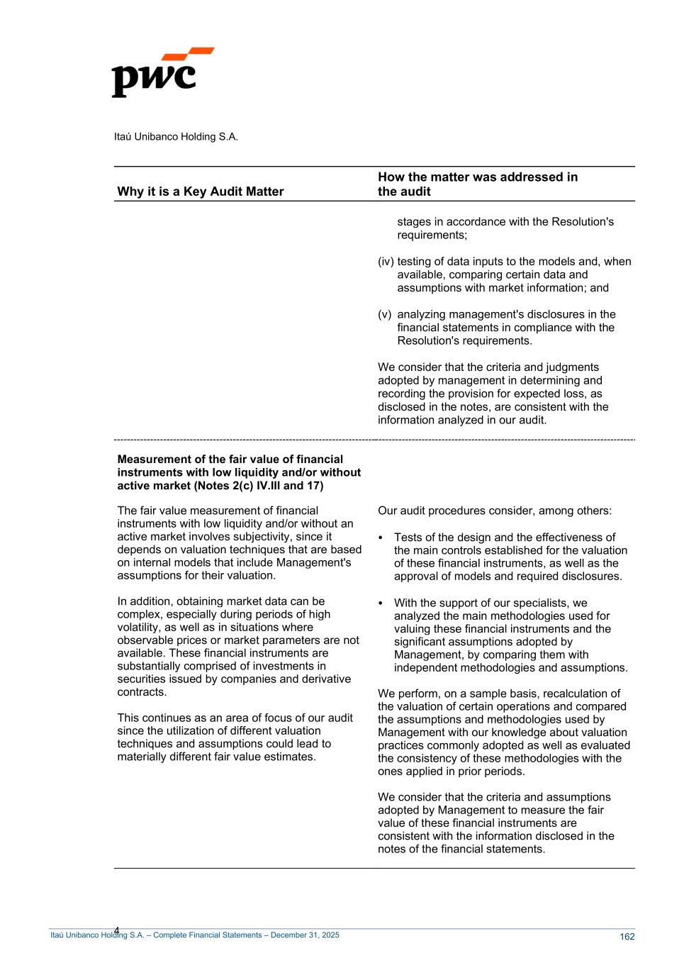 Itaú Unibanco Holding S.A. – Complete Financial Statements – December 31, 2025 Itaú Unibanco Holding S.A. 4 Why it is a Key Audit Matter How the matter was addressed in the audit stages in accordance with the Resolution's requirements; (iv) testing of data inputs to the models and, when available, comparing certain data and assumptions with market information; and (v) analyzing management's disclosures in the financial statements in compliance with the Resolution's requirements. We consider that the criteria and judgments adopted by management in determining and recording the provision for expected loss, as disclosed in the notes, are consistent with the information analyzed in our audit. Measurement of the fair value of financial instruments with low liquidity and/or without active market (Notes 2(c) IV.III and 17) The fair value measurement of financial instruments with low liquidity and/or without an active market involves subjectivity, since it depends on valuation techniques that are based on internal models that include Management's assumptions for their valuation. In addition, obtaining market data can be complex, especially during periods of high volatility, as well as in situations where observable prices or market parameters are not available. These financial instruments are substantially comprised of investments in securities issued by companies and derivative contracts. This continues as an area of focus of our audit since the utilization of different valuation techniques and assumptions could lead to materially different fair value estimates. Our audit procedures consider, among others: Tests of the design and the effectiveness of the main controls established for the valuation of these financial instruments, as well as the approval of models and required disclosures. With the support of our specialists, we analyzed the main methodologies used for valuing these financial instruments and the significant assumptions adopted by Management, by comparing them with independent methodologies and assumptions. We perform, on a sample basis, recalculation of the valuation of certain operations and compared the assumptions and methodologies used by Management with our knowledge about valuation practices commonly adopted as well as evaluated the consistency of these methodologies with the ones applied in prior periods. We consider that the criteria and assumptions adopted by Management to measure the fair value of these financial instruments are consistent with the information disclosed in the notes of the financial statements. 162