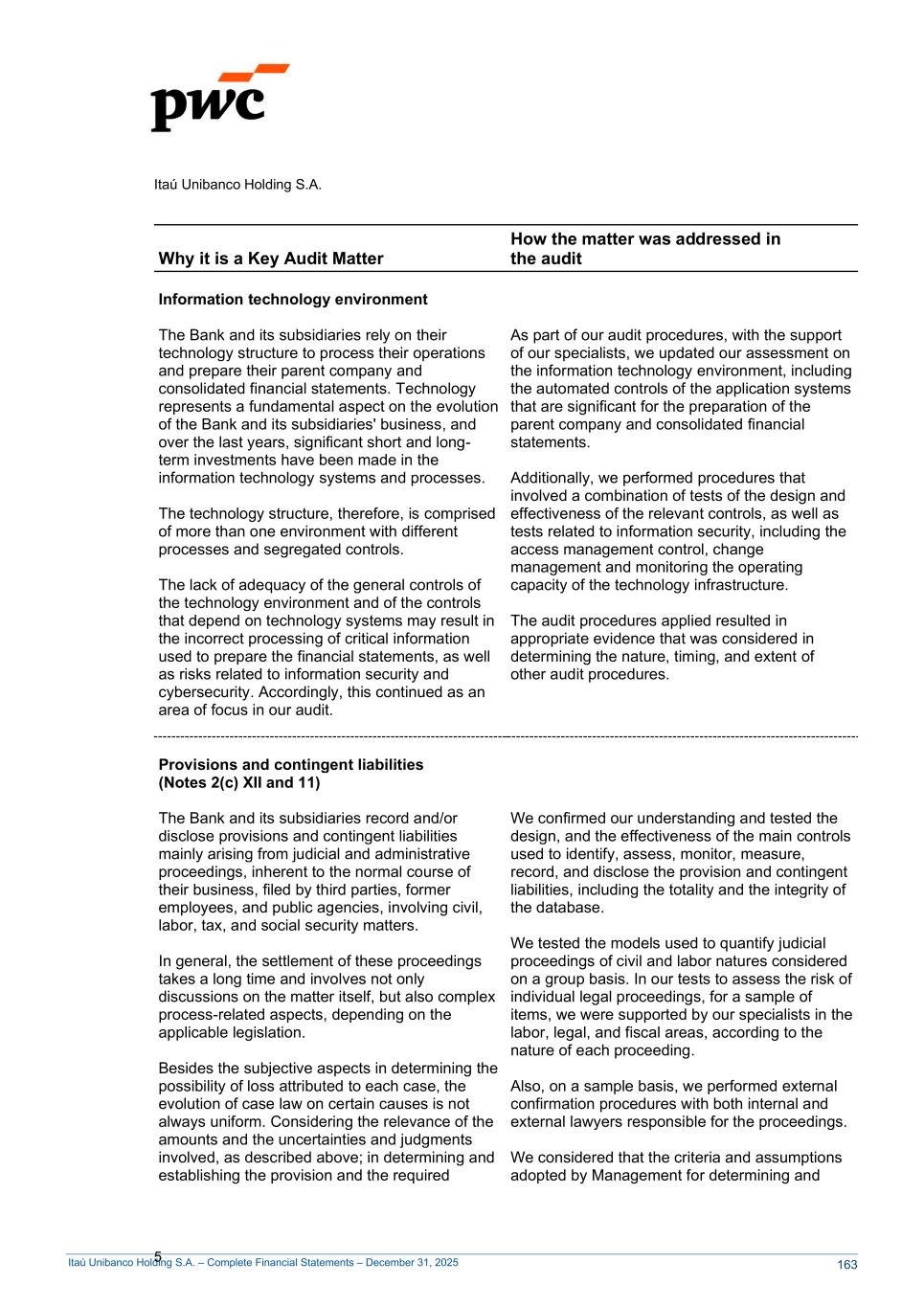 Itaú Unibanco Holding S.A. – Complete Financial Statements – December 31, 2025 Itaú Unibanco Holding S.A. 5 Why it is a Key Audit Matter How the matter was addressed in the audit Information technology environment The Bank and its subsidiaries rely on their technology structure to process their operations and prepare their parent company and consolidated financial statements. Technology represents a fundamental aspect on the evolution of the Bank and its subsidiaries' business, and over the last years, significant short and long- term investments have been made in the information technology systems and processes. The technology structure, therefore, is comprised of more than one environment with different processes and segregated controls. The lack of adequacy of the general controls of the technology environment and of the controls that depend on technology systems may result in the incorrect processing of critical information used to prepare the financial statements, as well as risks related to information security and cybersecurity. Accordingly, this continued as an area of focus in our audit. As part of our audit procedures, with the support of our specialists, we updated our assessment on the information technology environment, including the automated controls of the application systems that are significant for the preparation of the parent company and consolidated financial statements. Additionally, we performed procedures that involved a combination of tests of the design and effectiveness of the relevant controls, as well as tests related to information security, including the access management control, change management and monitoring the operating capacity of the technology infrastructure. The audit procedures applied resulted in appropriate evidence that was considered in determining the nature, timing, and extent of other audit procedures. Provisions and contingent liabilities (Notes 2(c) XII and 11) The Bank and its subsidiaries record and/or disclose provisions and contingent liabilities mainly arising from judicial and administrative proceedings, inherent to the normal course of their business, filed by third parties, former employees, and public agencies, involving civil, labor, tax, and social security matters. In general, the settlement of these proceedings takes a long time and involves not only discussions on the matter itself, but also complex process-related aspects, depending on the applicable legislation. Besides the subjective aspects in determining the possibility of loss attributed to each case, the evolution of case law on certain causes is not always uniform. Considering the relevance of the amounts and the uncertainties and judgments involved, as described above; in determining and establishing the provision and the required We confirmed our understanding and tested the design, and the effectiveness of the main controls used to identify, assess, monitor, measure, record, and disclose the provision and contingent liabilities, including the totality and the integrity of the database. We tested the models used to quantify judicial proceedings of civil and labor natures considered on a group basis. In our tests to assess the risk of individual legal proceedings, for a sample of items, we were supported by our specialists in the labor, legal, and fiscal areas, according to the nature of each proceeding. Also, on a sample basis, we performed external confirmation procedures with both internal and external lawyers responsible for the proceedings. We considered that the criteria and assumptions adopted by Management for determining and 163