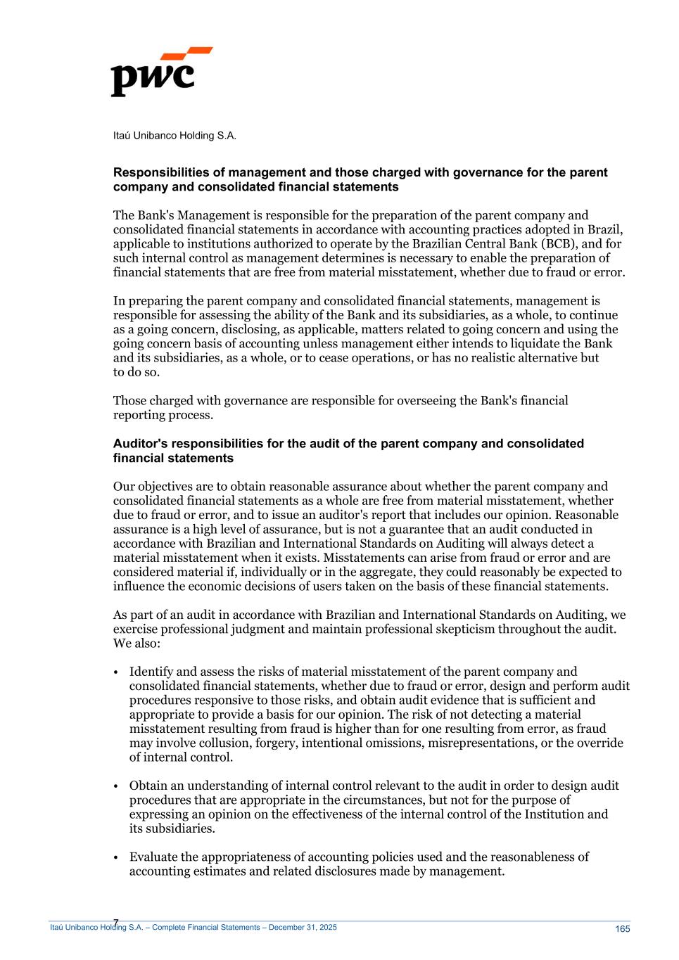 Itaú Unibanco Holding S.A. – Complete Financial Statements – December 31, 2025 Itaú Unibanco Holding S.A. 7 Responsibilities of management and those charged with governance for the parent company and consolidated financial statements The Bank's Management is responsible for the preparation of the parent company and consolidated financial statements in accordance with accounting practices adopted in Brazil, applicable to institutions authorized to operate by the Brazilian Central Bank (BCB), and for such internal control as management determines is necessary to enable the preparation of financial statements that are free from material misstatement, whether due to fraud or error. In preparing the parent company and consolidated financial statements, management is responsible for assessing the ability of the Bank and its subsidiaries, as a whole, to continue as a going concern, disclosing, as applicable, matters related to going concern and using the going concern basis of accounting unless management either intends to liquidate the Bank and its subsidiaries, as a whole, or to cease operations, or has no realistic alternative but to do so. Those charged with governance are responsible for overseeing the Bank's financial reporting process. Auditor's responsibilities for the audit of the parent company and consolidated financial statements Our objectives are to obtain reasonable assurance about whether the parent company and consolidated financial statements as a whole are free from material misstatement, whether due to fraud or error, and to issue an auditor's report that includes our opinion. Reasonable assurance is a high level of assurance, but is not a guarantee that an audit conducted in accordance with Brazilian and International Standards on Auditing will always detect a material misstatement when it exists. Misstatements can arise from fraud or error and are considered material if, individually or in the aggregate, they could reasonably be expected to influence the economic decisions of users taken on the basis of these financial statements. As part of an audit in accordance with Brazilian and International Standards on Auditing, we exercise professional judgment and maintain professional skepticism throughout the audit. We also: Identify and assess the risks of material misstatement of the parent company and consolidated financial statements, whether due to fraud or error, design and perform audit procedures responsive to those risks, and obtain audit evidence that is sufficient and appropriate to provide a basis for our opinion. The risk of not detecting a material misstatement resulting from fraud is higher than for one resulting from error, as fraud may involve collusion, forgery, intentional omissions, misrepresentations, or the override of internal control. Obtain an understanding of internal control relevant to the audit in order to design audit procedures that are appropriate in the circumstances, but not for the purpose of expressing an opinion on the effectiveness of the internal control of the Institution and its subsidiaries. Evaluate the appropriateness of accounting policies used and the reasonableness of accounting estimates and related disclosures made by management. 165