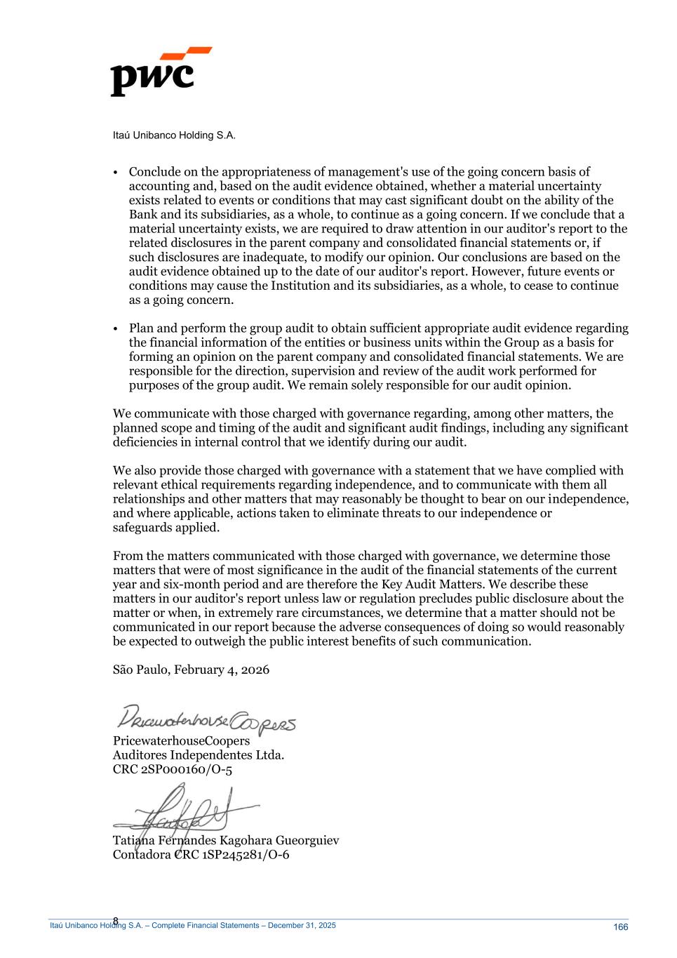Itaú Unibanco Holding S.A. – Complete Financial Statements – December 31, 2025 Itaú Unibanco Holding S.A. 8 Conclude on the appropriateness of management's use of the going concern basis of accounting and, based on the audit evidence obtained, whether a material uncertainty exists related to events or conditions that may cast significant doubt on the ability of the Bank and its subsidiaries, as a whole, to continue as a going concern. If we conclude that a material uncertainty exists, we are required to draw attention in our auditor's report to the related disclosures in the parent company and consolidated financial statements or, if such disclosures are inadequate, to modify our opinion. Our conclusions are based on the audit evidence obtained up to the date of our auditor's report. However, future events or conditions may cause the Institution and its subsidiaries, as a whole, to cease to continue as a going concern. Plan and perform the group audit to obtain sufficient appropriate audit evidence regarding the financial information of the entities or business units within the Group as a basis for forming an opinion on the parent company and consolidated financial statements. We are responsible for the direction, supervision and review of the audit work performed for purposes of the group audit. We remain solely responsible for our audit opinion. We communicate with those charged with governance regarding, among other matters, the planned scope and timing of the audit and significant audit findings, including any significant deficiencies in internal control that we identify during our audit. We also provide those charged with governance with a statement that we have complied with relevant ethical requirements regarding independence, and to communicate with them all relationships and other matters that may reasonably be thought to bear on our independence, and where applicable, actions taken to eliminate threats to our independence or safeguards applied. From the matters communicated with those charged with governance, we determine those matters that were of most significance in the audit of the financial statements of the current year and six-month period and are therefore the Key Audit Matters. We describe these matters in our auditor's report unless law or regulation precludes public disclosure about the matter or when, in extremely rare circumstances, we determine that a matter should not be communicated in our report because the adverse consequences of doing so would reasonably be expected to outweigh the public interest benefits of such communication. São Paulo, February 4, 2026 PricewaterhouseCoopers Auditores Independentes Ltda. CRC 2SP000160/O-5 Tatiana Fernandes Kagohara Gueorguiev Contadora CRC 1SP245281/O-6 166