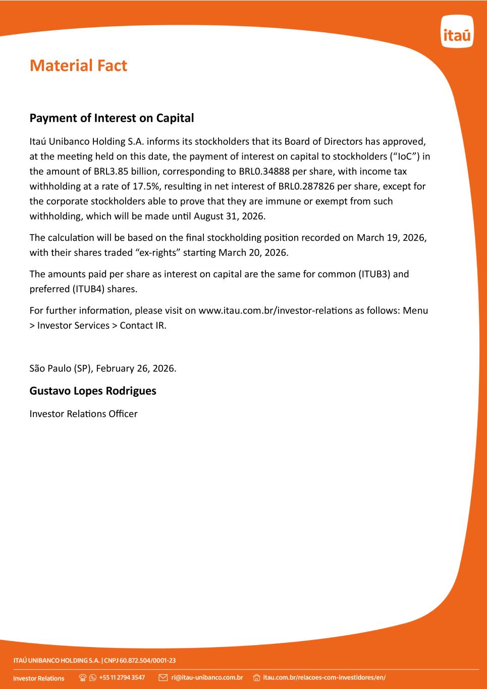 Material Fact Payment of Interest on Capital Itaú Unibanco Holding S.A. informs its stockholders that its Board of Directors has approved, at the meeting held on this date, the payment of interest on capital to stockholders (“IoC”) in the amount of BRL3.85 billion, corresponding to BRL0.34888 per share, with income tax withholding at a rate of 17.5%, resulting in net interest of BRL0.287826 per share, except for the corporate stockholders able to prove that they are immune or exempt from such withholding, which will be made until August 31, 2026. The calculation will be based on the final stockholding position recorded on March 19, 2026, with their shares traded “ex-rights” starting March 20, 2026. The amounts paid per share as interest on capital are the same for common (ITUB3) and preferred (ITUB4) shares. For further information, please visit on www.itau.com.br/investor-relations as follows: Menu > Investor Services > Contact IR. São Paulo (SP), February 26, 2026. Gustavo Lopes Rodrigues Investor Relations Officer