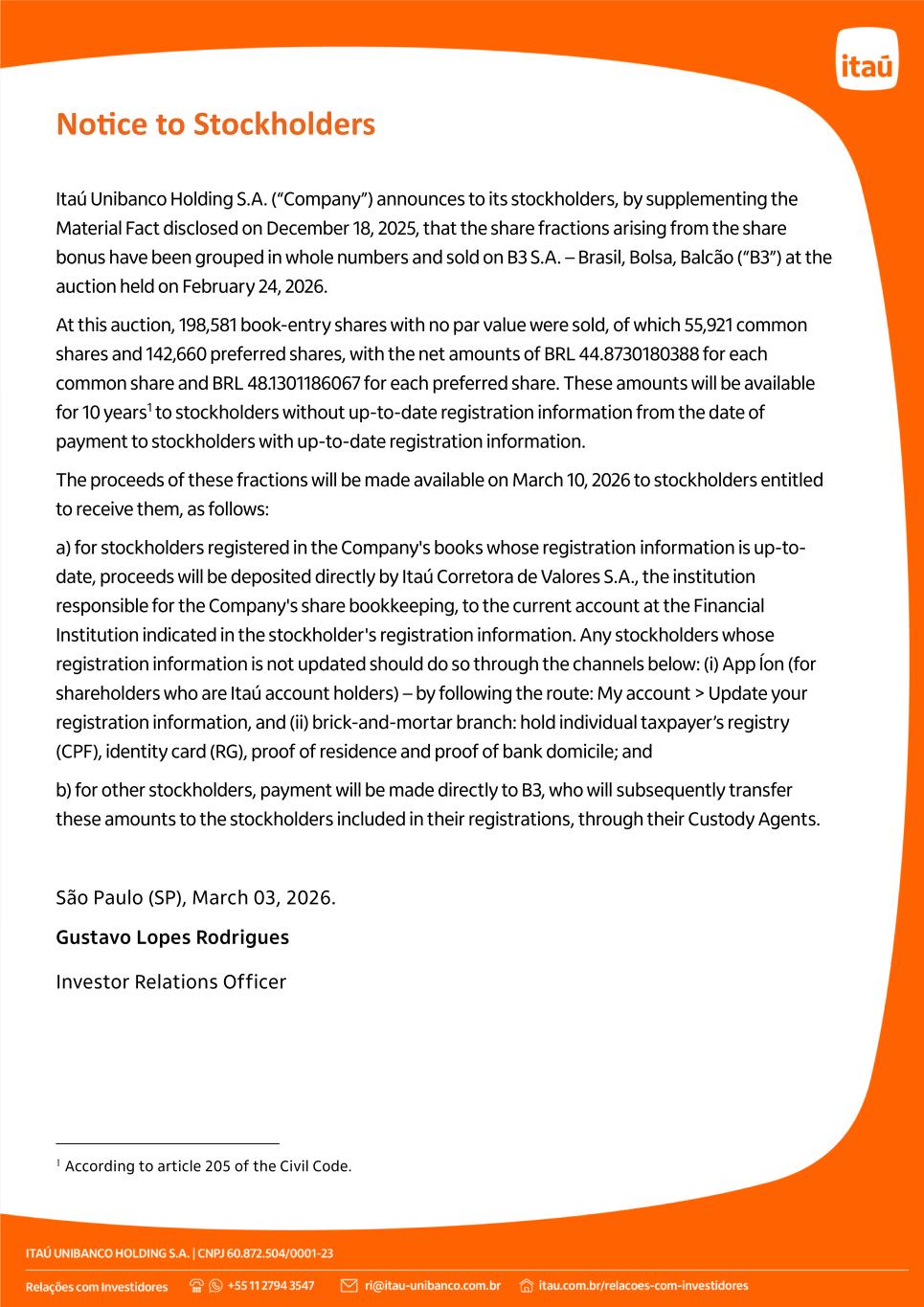 Notice to Stockholders Itaú Unibanco Holding S.A. (“Company”) announces to its stockholders, by supplementing the Material Fact disclosed on December 18, 2025, that the share fractions arising from the share bonus have been grouped in whole numbers and sold on B3 S.A. – Brasil, Bolsa, Balcão (“B3”) at the auction held on February 24, 2026. At this auction, 198,581 book-entry shares with no par value were sold, of which 55,921 common shares and 142,660 preferred shares, with the net amounts of BRL 44.8730180388 for each common share and BRL 48.1301186067 for each preferred share. These amounts will be available for 10 years1 to stockholders without up-to-date registration information from the date of payment to stockholders with up-to-date registration information. The proceeds of these fractions will be made available on March 10, 2026 to stockholders entitled to receive them, as follows: a) for stockholders registered in the Company's books whose registration information is up-to- date, proceeds will be deposited directly by Itaú Corretora de Valores S.A., the institution responsible for the Company's share bookkeeping, to the current account at the Financial Institution indicated in the stockholder's registration information. Any stockholders whose registration information is not updated should do so through the channels below: (i) App Íon (for shareholders who are Itaú account holders) – by following the route: My account > Update your registration information, and (ii) brick-and-mortar branch: hold individual taxpayer’s registry (CPF), identity card (RG), proof of residence and proof of bank domicile; and b) for other stockholders, payment will be made directly to B3, who will subsequently transfer these amounts to the stockholders included in their registrations, through their Custody Agents. São Paulo (SP), March 03, 2026. Gustavo Lopes Rodrigues Investor Relations Officer 1 According to article 205 of the Civil Code.