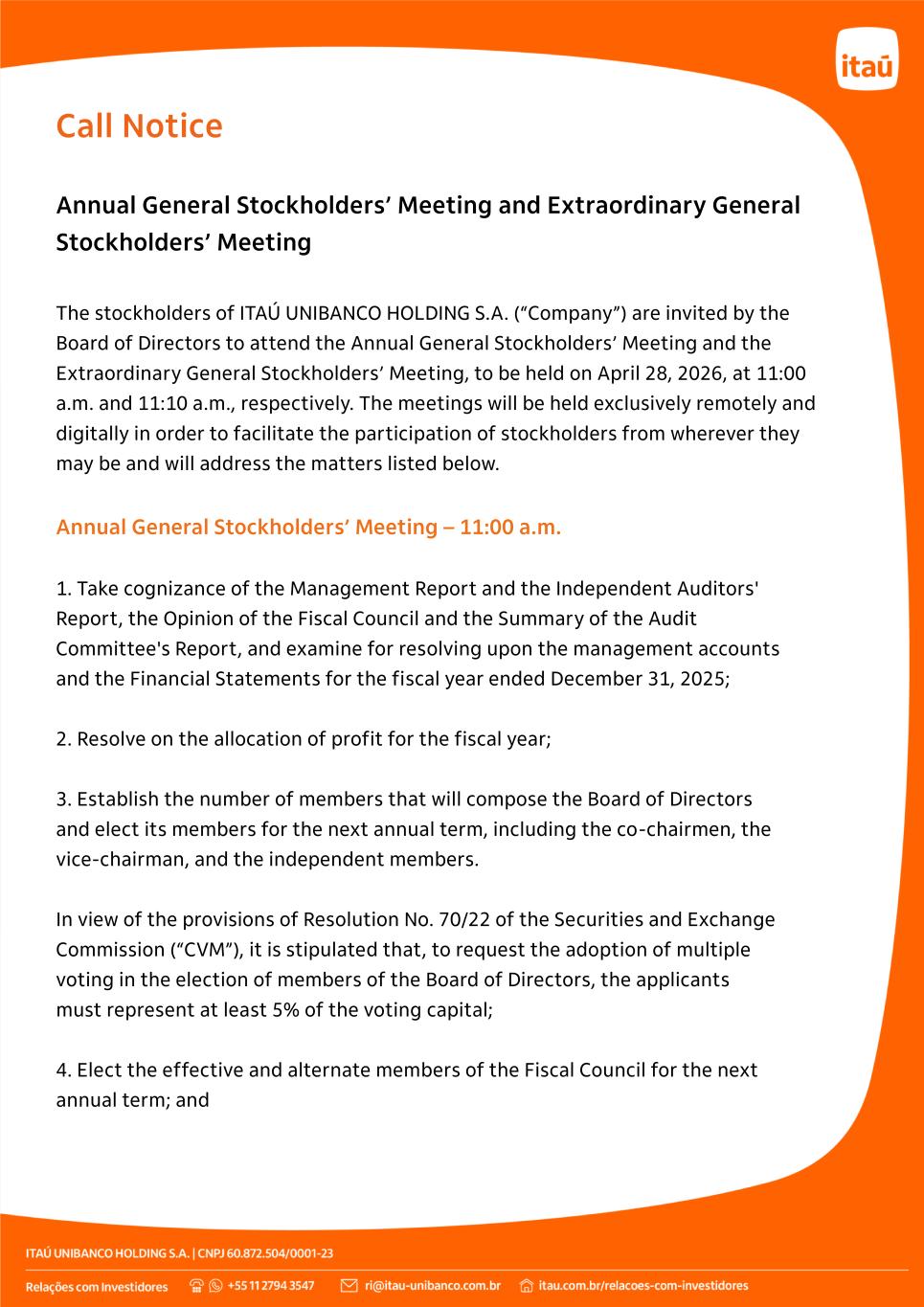 Call Notice Annual General Stockholders’ Meeting and Extraordinary General Stockholders’ Meeting The stockholders of ITAÚ UNIBANCO HOLDING S.A. (“Company”) are invited by the Board of Directors to attend the Annual General Stockholders’ Meeting and the Extraordinary General Stockholders’ Meeting, to be held on April 28, 2026, at 11:00 a.m. and 11:10 a.m., respectively. The meetings will be held exclusively remotely and digitally in order to facilitate the participation of stockholders from wherever they may be and will address the matters listed below. Annual General Stockholders’ Meeting – 11:00 a.m. 1. Take cognizance of the Management Report and the Independent Auditors' Report, the Opinion of the Fiscal Council and the Summary of the Audit Committee's Report, and examine for resolving upon the management accounts and the Financial Statements for the fiscal year ended December 31, 2025; 2. Resolve on the allocation of profit for the fiscal year; 3. Establish the number of members that will compose the Board of Directors and elect its members for the next annual term, including the co-chairmen, the vice-chairman, and the independent members. In view of the provisions of Resolution No. 70/22 of the Securities and Exchange Commission (“CVM”), it is stipulated that, to request the adoption of multiple voting in the election of members of the Board of Directors, the applicants must represent at least 5% of the voting capital; 4. Elect the effective and alternate members of the Fiscal Council for the next annual term; and