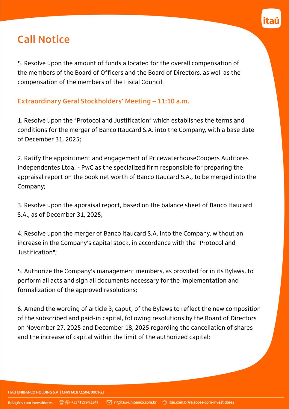 Call Notice 5. Resolve upon the amount of funds allocated for the overall compensation of the members of the Board of Officers and the Board of Directors, as well as the compensation of the members of the Fiscal Council. Extraordinary Geral Stockholders’ Meeting – 11:10 a.m. 1. Resolve upon the “Protocol and Justification” which establishes the terms and conditions for the merger of Banco Itaucard S.A. into the Company, with a base date of December 31, 2025; 2. Ratify the appointment and engagement of PricewaterhouseCoopers Auditores Independentes Ltda. - PwC as the specialized firm responsible for preparing the appraisal report on the book net worth of Banco Itaucard S.A., to be merged into the Company; 3. Resolve upon the appraisal report, based on the balance sheet of Banco Itaucard S.A., as of December 31, 2025; 4. Resolve upon the merger of Banco Itaucard S.A. into the Company, without an increase in the Company's capital stock, in accordance with the "Protocol and Justification"; 5. Authorize the Company's management members, as provided for in its Bylaws, to perform all acts and sign all documents necessary for the implementation and formalization of the approved resolutions; 6. Amend the wording of article 3, caput, of the Bylaws to reflect the new composition of the subscribed and paid-in capital, following resolutions by the Board of Directors on November 27, 2025 and December 18, 2025 regarding the cancellation of shares and the increase of capital within the limit of the authorized capital;