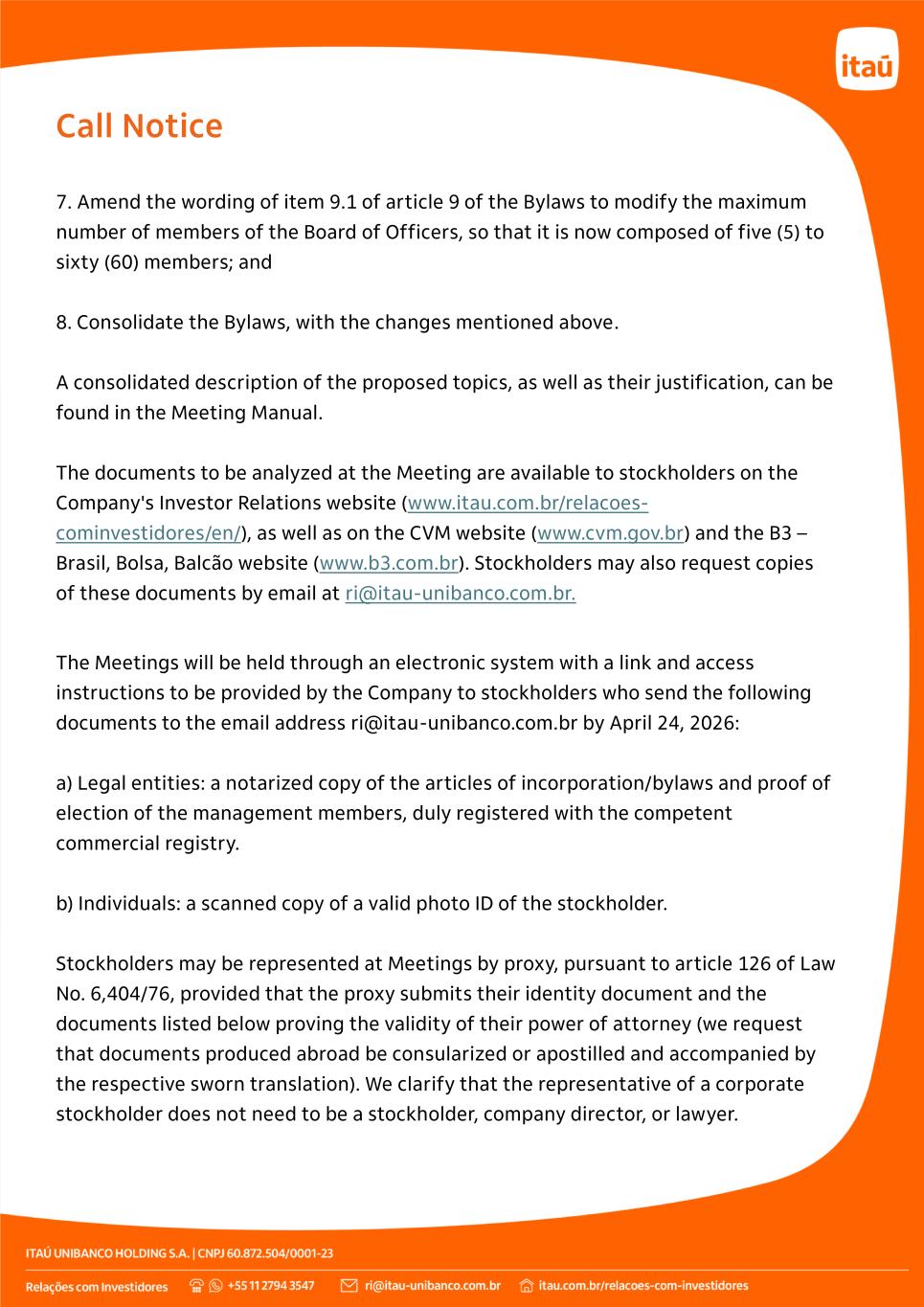 Call Notice 7. Amend the wording of item 9.1 of article 9 of the Bylaws to modify the maximum number of members of the Board of Officers, so that it is now composed of five (5) to sixty (60) members; and 8. Consolidate the Bylaws, with the changes mentioned above. A consolidated description of the proposed topics, as well as their justification, can be found in the Meeting Manual. The documents to be analyzed at the Meeting are available to stockholders on the Company's Investor Relations website (www.itau.com.br/relacoes- cominvestidores/en/), as well as on the CVM website (www.cvm.gov.br) and the B3 – Brasil, Bolsa, Balcão website (www.b3.com.br). Stockholders may also request copies of these documents by email at ri@itau-unibanco.com.br. The Meetings will be held through an electronic system with a link and access instructions to be provided by the Company to stockholders who send the following documents to the email address ri@itau-unibanco.com.br by April 24, 2026: a) Legal entities: a notarized copy of the articles of incorporation/bylaws and proof of election of the management members, duly registered with the competent commercial registry. b) Individuals: a scanned copy of a valid photo ID of the stockholder. Stockholders may be represented at Meetings by proxy, pursuant to article 126 of Law No. 6,404/76, provided that the proxy submits their identity document and the documents listed below proving the validity of their power of attorney (we request that documents produced abroad be consularized or apostilled and accompanied by the respective sworn translation). We clarify that the representative of a corporate stockholder does not need to be a stockholder, company director, or lawyer.