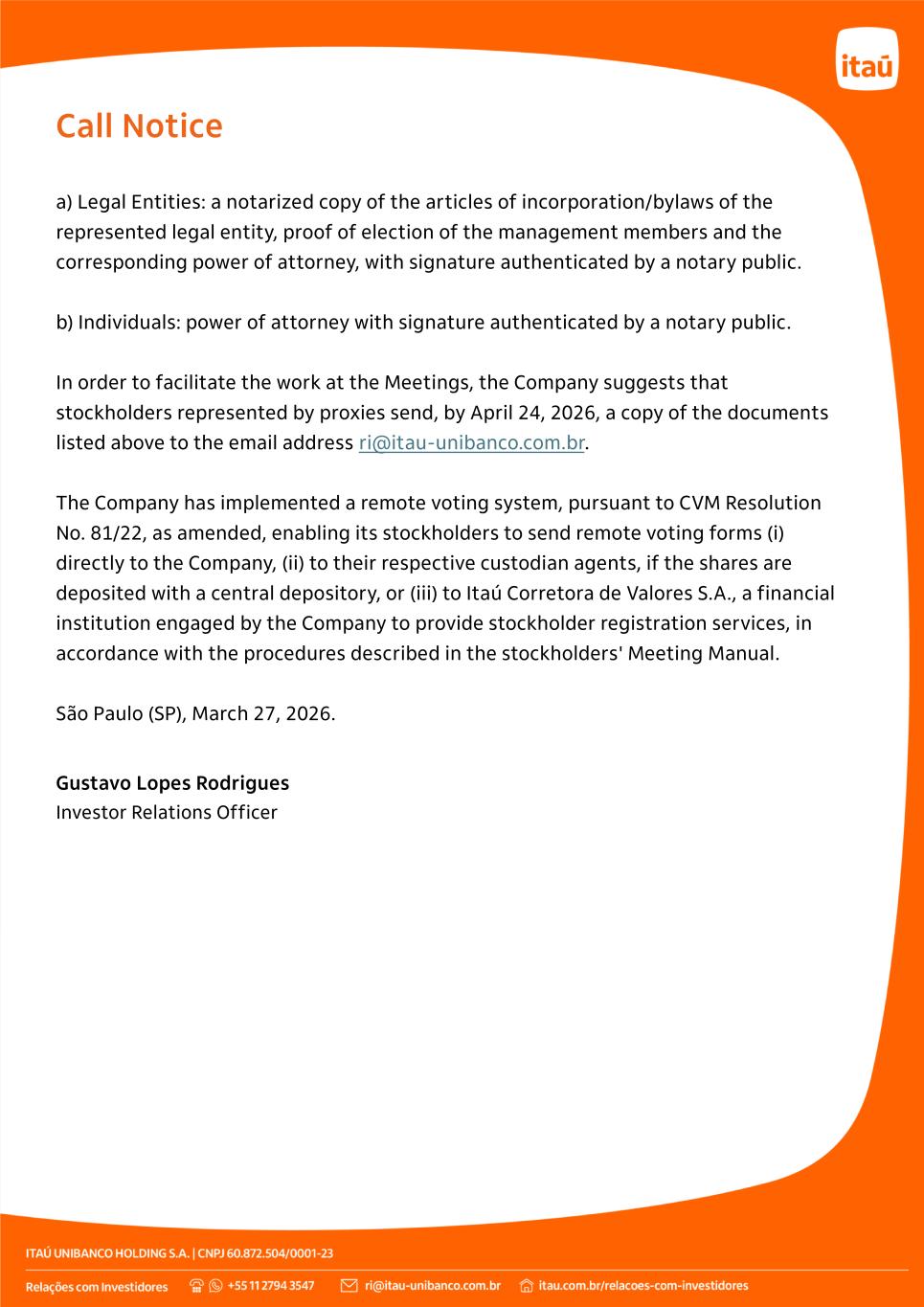 Call Notice a) Legal Entities: a notarized copy of the articles of incorporation/bylaws of the represented legal entity, proof of election of the management members and the corresponding power of attorney, with signature authenticated by a notary public. b) Individuals: power of attorney with signature authenticated by a notary public. In order to facilitate the work at the Meetings, the Company suggests that stockholders represented by proxies send, by April 24, 2026, a copy of the documents listed above to the email address ri@itau-unibanco.com.br. The Company has implemented a remote voting system, pursuant to CVM Resolution No. 81/22, as amended, enabling its stockholders to send remote voting forms (i) directly to the Company, (ii) to their respective custodian agents, if the shares are deposited with a central depository, or (iii) to Itaú Corretora de Valores S.A., a financial institution engaged by the Company to provide stockholder registration services, in accordance with the procedures described in the stockholders' Meeting Manual. São Paulo (SP), March 27, 2026. Gustavo Lopes Rodrigues Investor Relations Officer