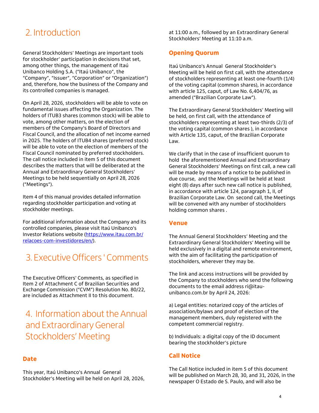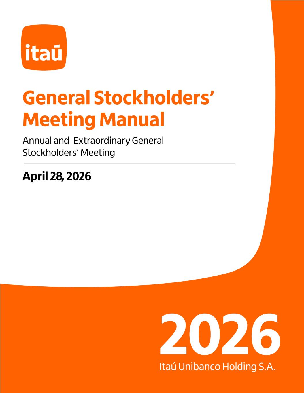 General Stockholders’ Meetings are important tools for stockholder’ participation in decisions that set, among other things, the management of Itaú Unibanco Holding S.A. (“Itaú Unibanco”, the “Company”, “Issuer”, “Corporation” or “Organization”) and, therefore, how the business of the Company and its controlled companies is managed. On April 28, 2026, stockholders will be able to vote on fundamental issues affecting the Organization. The holders of ITUB3 shares (common stock) will be able to vote, among other matters, on the election of members of the Company's Board of Directors and Fiscal Council, and the allocation of net income earned in 2025. The holders of ITUB4 shares (preferred stock) will be able to vote on the election of members of the Fiscal Council nominated by preferred stockholders. The call notice included in item 5 of this document describes the matters that will be deliberated at the Annual and Extraordinary General Stockholders’ Meetings to be held sequentially on April 28, 2026 (“Meetings”). Item 4 of this manual provides detailed information regarding stockholder participation and voting at stockholder meetings. For additional information about the Company and its controlled companies, please visit Itaú Unibanco’s Investor Relations website (https://www.itau.com.br/ relacoes-com-investidores/en/). The Executive Officers' Comments, as specified in Item 2 of Attachment C of Brazilian Securities and Exchange Commission (“CVM”) Resolution No. 80/22, are included as Attachment II to this document. Date This year, Itaú Unibanco's Annual General Stockholder’s Meeting will be held on April 28, 2026, at 11:00 a.m., followed by an Extraordinary General Stockholders’ Meeting at 11:10 a.m. Opening Quorum Itaú Unibanco's Annual General Stockholder’s Meeting will be held on first call, with the attendance of stockholders representing at least one-fourth (1/4) of the voting capital (common shares), in accordance with article 125, caput, of Law No. 6,404/76, as amended (“Brazilian Corporate Law”). The Extraordinary General Stockholders’ Meeting will be held, on first call, with the attendance of stockholders representing at least two-thirds (2/3) of the voting capital (common shares ), in accordance with Article 135, caput, of the Brazilian Corporate Law. We clarify that in the case of insufficient quorum to hold the aforementioned Annual and Extraordinary General Stockholders’ Meetings on first call, a new call will be made by means of a notice to be published in due course, and the Meetings will be held at least eight (8) days after such new call notice is published, in accordance with article 124, paragraph 1, II, of Brazilian Corporate Law. On second call, the Meetings will be convened with any number of stockholders holding common shares . Venue The Annual General Stockholders’ Meeting and the Extraordinary General Stockholders’ Meeting will be held exclusively in a digital and remote environment, with the aim of facilitating the participation of stockholders, wherever they may be. The link and access instructions will be provided by the Company to stockholders who send the following documents to the email address ri@itau- unibanco.com.br by April 24, 2026: a) Legal entities: notarized copy of the articles of association/bylaws and proof of election of the management members, duly registered with the competent commercial registry. b) Individuals: a digital copy of the ID document bearing the stockholder’s picture Call Notice The Call Notice included in item 5 of this document will be published on March 28, 30, and 31, 2026, in the newspaper O Estado de S. Paulo, and will also be 2. Introduction 3. Executive Officers ' Comments 4. Information about the Annual and Extraordinary General Stockholders’ Meeting 4