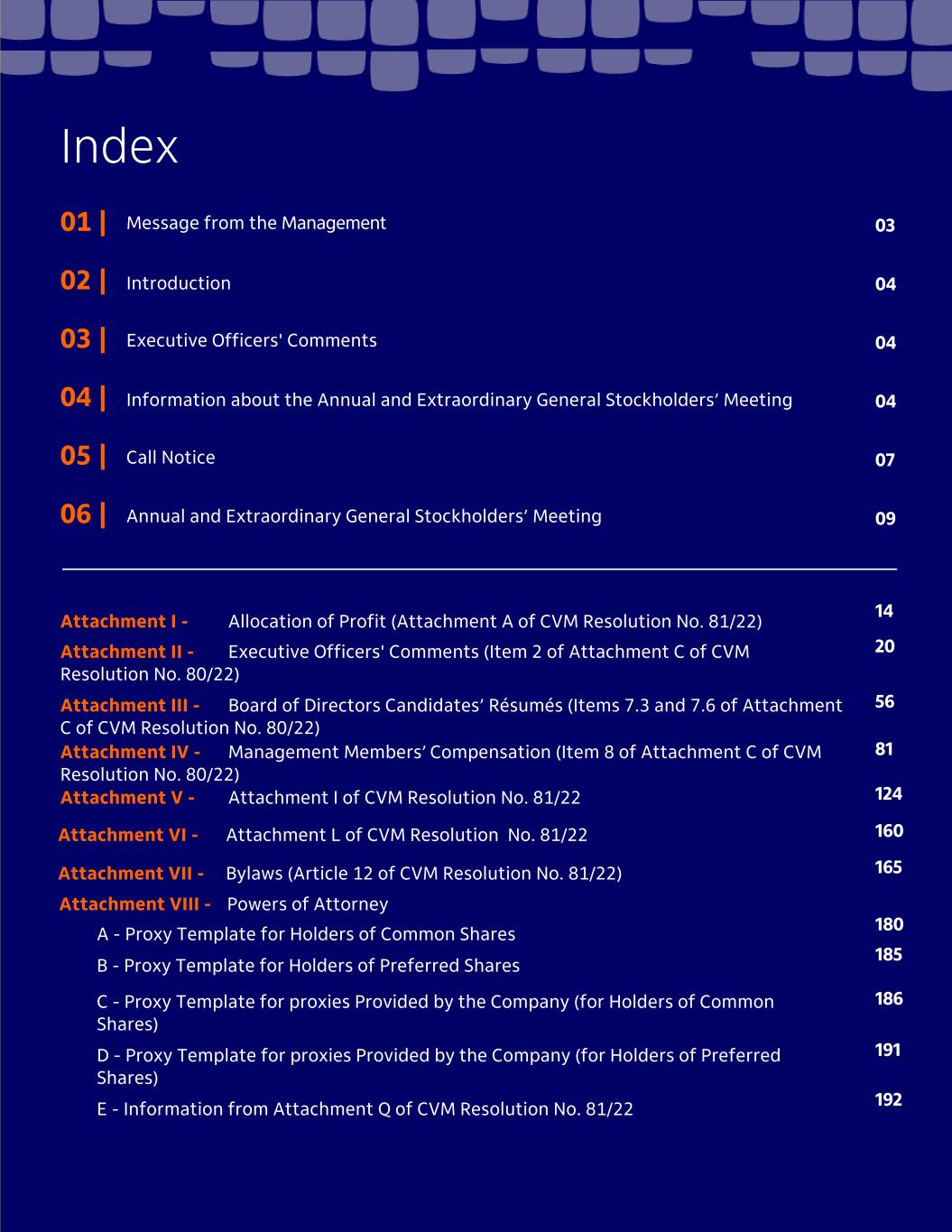 Index 01 | Message from the Management 02 | Introduction 03 | Executive Officers' Comments 04 | Information about the Annual and Extraordinary General Stockholders’ Meeting 05 | Call Notice 06 | Annual and Extraordinary General Stockholders’ Meeting Attachment I - Allocation of Profit (Attachment A of CVM Resolution No. 81/22) Attachment II - Executive Officers' Comments (Item 2 of Attachment C of CVM Resolution No. 80/22) Attachment III - Board of Directors Candidates’ Résumés (Items 7.3 and 7.6 of Attachment C of CVM Resolution No. 80/22) Attachment IV - Management Members’ Compensation (Item 8 of Attachment C of CVM Resolution No. 80/22) Attachment V - Attachment I of CVM Resolution No. 81/22 Attachment VIII - Powers of Attorney A - Proxy Template for Holders of Common Shares B - Proxy Template for Holders of Preferred Shares C - Proxy Template for proxies Provided by the Company (for Holders of Common Shares) D - Proxy Template for proxies Provided by the Company (for Holders of Preferred Shares) E - Information from Attachment Q of CVM Resolution No. 81/22 03 04 04 04 07 09 14 20 56 81 124 160 165 180 185 186 191 Attachment VI - Attachment L of CVM Resolution No. 81/22 Attachment VII - Bylaws (Article 12 of CVM Resolution No. 81/22) 192