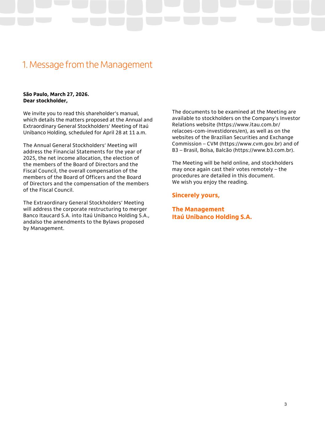 São Paulo, March 27, 2026. Dear stockholder, We invite you to read this shareholder’s manual, which details the matters proposed at the Annual and Extraordinary General Stockholders’ Meeting of Itaú Unibanco Holding, scheduled for April 28 at 11 a.m. The Annual General Stockholders’ Meeting will address the Financial Statements for the year of 2025, the net income allocation, the election of the members of the Board of Directors and the Fiscal Council, the overall compensation of the members of the Board of Officers and the Board of Directors and the compensation of the members of the Fiscal Council. The Extraordinary General Stockholders’ Meeting will address the corporate restructuring to merger Banco Itaucard S.A. into Itaú Unibanco Holding S.A., andalso the amendments to the Bylaws proposed by Management. The documents to be examined at the Meeting are available to stockholders on the Company’s Investor Relations website (https://www.itau.com.br/ relacoes-com-investidores/en), as well as on the websites of the Brazilian Securities and Exchange Commission – CVM (https://www.cvm.gov.br) and of B3 – Brasil, Bolsa, Balcão (https://www.b3.com.br). The Meeting will be held online, and stockholders may once again cast their votes remotely – the procedures are detailed in this document. We wish you enjoy the reading. Sincerely yours, The Management Itaú Unibanco Holding S.A. 1. Message from the Management 3