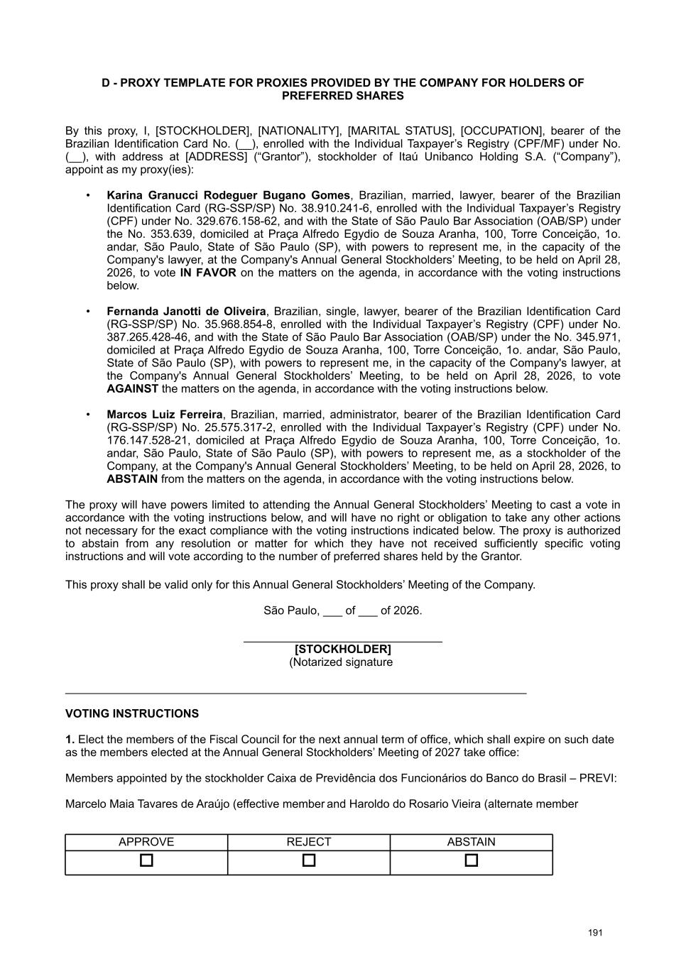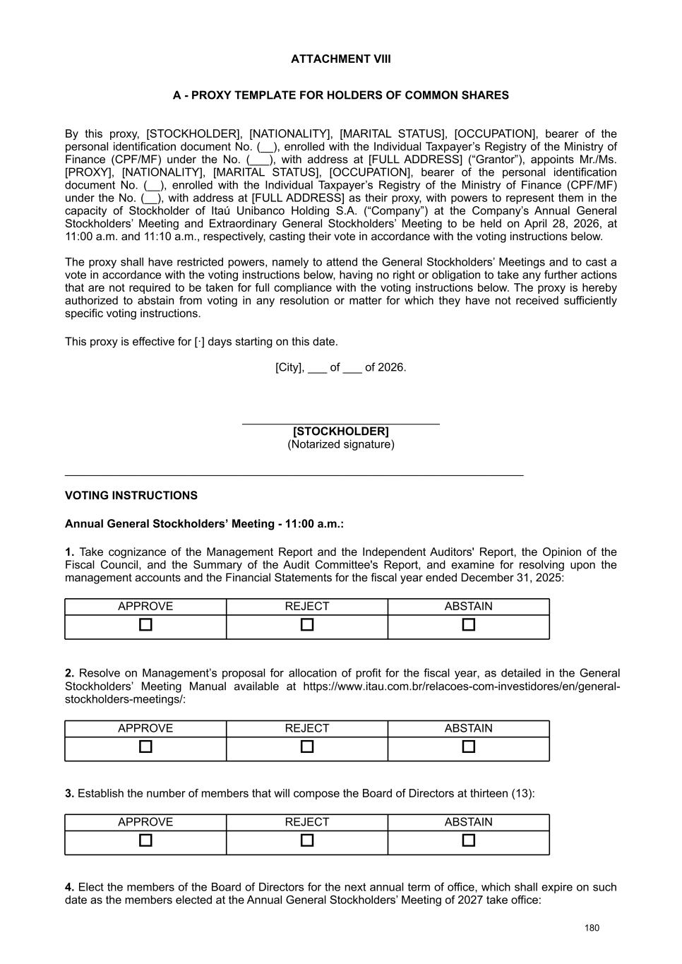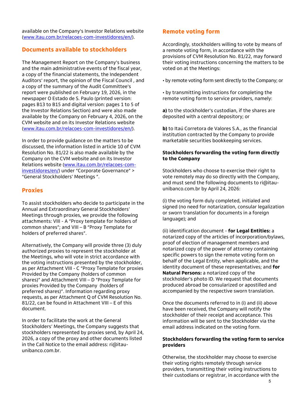 available on the Company's Investor Relations website (www.itau.com.br/relacoes-com-investidores/en/). Documents available to stockholders The Management Report on the Company's business and the main administrative events of the fiscal year, a copy of the financial statements, the Independent Auditors' report, the opinion of the Fiscal Council , and a copy of the summary of the Audit Committee's report were published on February 19, 2026, in the newspaper O Estado de S. Paulo (printed version: pages B13 to B15 and digital version: pages 1 to 5 of the Investor Relations Section) and were also made available by the Company on February 4, 2026, on the CVM website and on its Investor Relations website (www.itau.com.br/relacoes-com-investidores/en/). In order to provide guidance on the matters to be discussed, the information listed in article 10 of CVM Resolution No. 81/22 is also made available by the Company on the CVM website and on its Investor Relations website (www.itau.com.br/relacoes-com- investidores/en/) under “Corporate Governance” > “General Stockholders’ Meetings ”. Proxies To assist stockholders who decide to participate in the Annual and Extraordinary General Stockholders’ Meetings through proxies, we provide the following attachments: VIII - A “Proxy template for holders of common shares”; and VIII – B “Proxy Template for holders of preferred shares”. Alternatively, the Company will provide three (3) duly authorized proxies to represent the stockholder at the Meetings, who will vote in strict accordance with the voting instructions presented by the stockholder, as per Attachment VIII - C “Proxy Template for proxies Provided by the Company (holders of common shares)” and Attachment VIII – D “Proxy Template for proxies Provided by the Company (holders of preferred shares)”. Information regarding proxy requests, as per Attachment Q of CVM Resolution No. 81/22, can be found in Attachment VIII – E of this document. In order to facilitate the work at the General Stockholders’ Meetings, the Company suggests that stockholders represented by proxies send, by April 24, 2026, a copy of the proxy and other documents listed in the Call Notice to the email address: ri@itau- unibanco.com.br. Remote voting form Accordingly, stockholders willing to vote by means of a remote voting form, in accordance with the provisions of CVM Resolution No. 81/22, may forward their voting instructions concerning the matters to be voted on at the Meetings: • by remote voting form sent directly to the Company; or • by transmitting instructions for completing the remote voting form to service providers, namely: a) to the stockholder's custodian, if the shares are deposited with a central depository; or b) to Itaú Corretora de Valores S.A., as the financial institution contracted by the Company to provide marketable securities bookkeeping services. Stockholders forwarding the voting form directly to the Company Stockholders who choose to exercise their right to vote remotely may do so directly with the Company, and must send the following documents to ri@itau- unibanco.com.br by April 24, 2026: (i) the voting form duly completed, initialed and signed (no need for notarization, consular legalization or sworn translation for documents in a foreign language); and (ii) identification document - for Legal Entities: a notarized copy of the articles of incorporation/bylaws, proof of election of management members and notarized copy of the power of attorney containing specific powers to sign the remote voting form on behalf of the Legal Entity, when applicable, and the identity document of these representatives; and for Natural Persons: a notarized copy of the stockholder's photo ID. We request that documents produced abroad be consularized or apostilled and accompanied by the respective sworn translation. Once the documents referred to in (i) and (ii) above have been received, the Company will notify the stockholder of their receipt and acceptance. This information will be sent to the Stockholder via the email address indicated on the voting form. Stockholders forwarding the voting form to service providers Otherwise, the stockholder may choose to exercise their voting rights remotely through service providers, transmitting their voting instructions to their custodians or registrar, in accordance with the 5