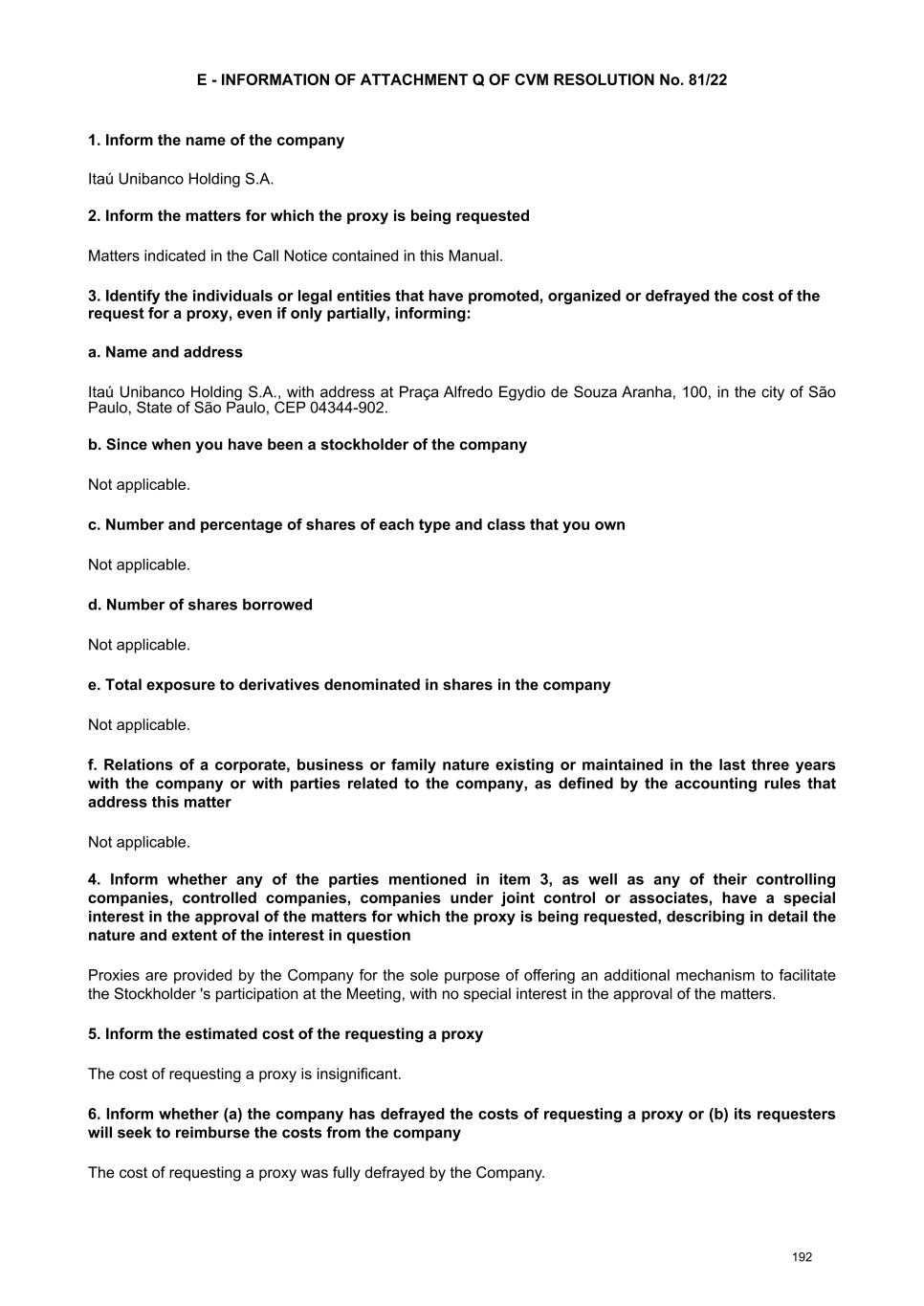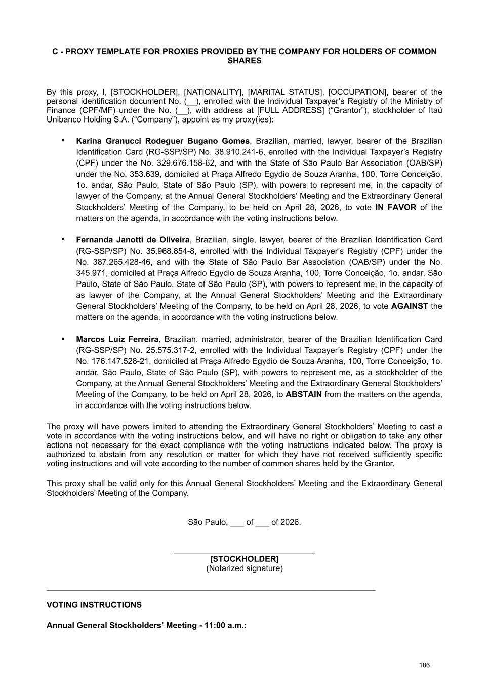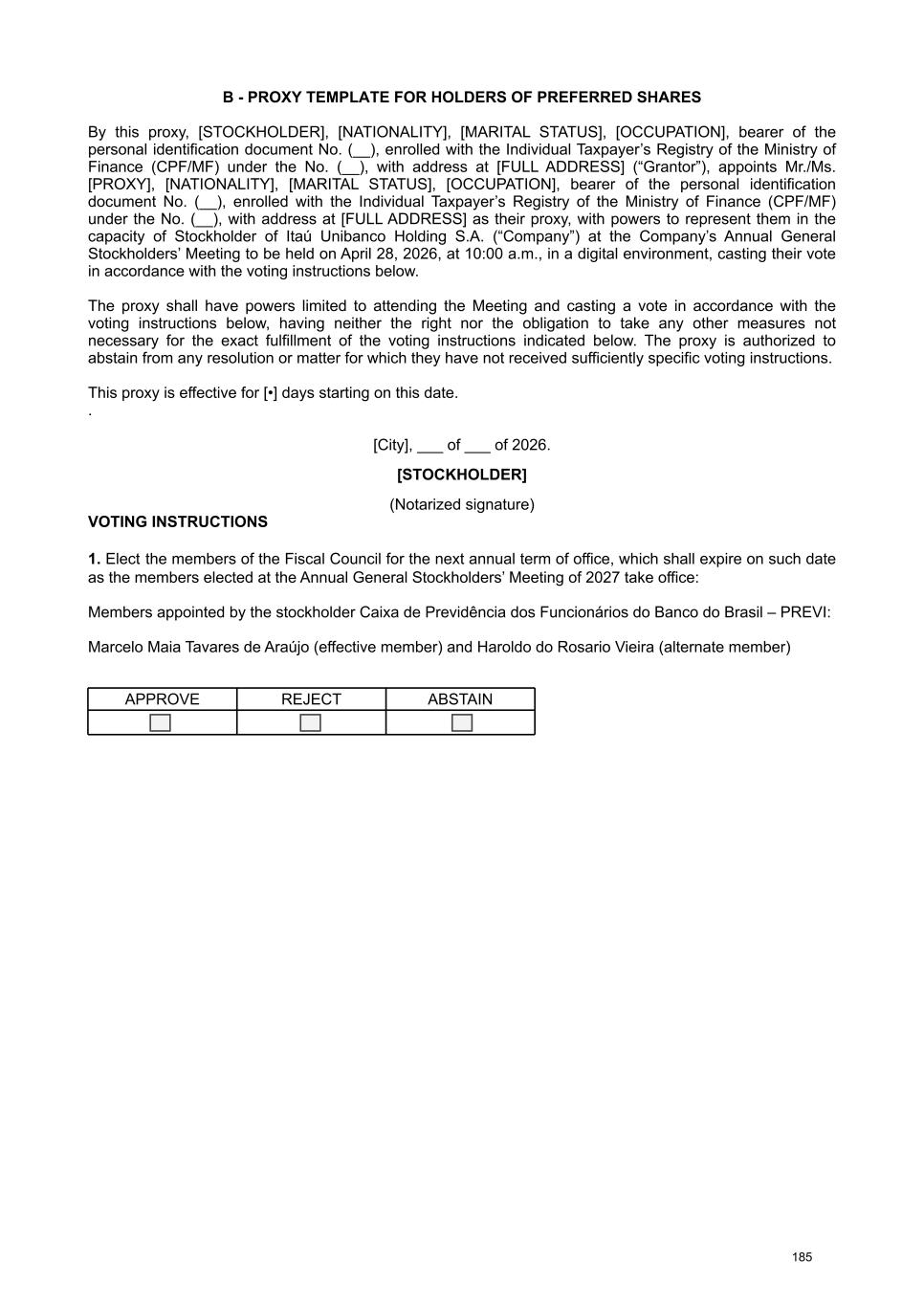 available on the Company's Investor Relations website (www.itau.com.br/relacoes-com-investidores/en/). Documents available to stockholders The Management Report on the Company's business and the main administrative events of the fiscal year, a copy of the financial statements, the Independent Auditors' report, the opinion of the Fiscal Council , and a copy of the summary of the Audit Committee's report were published on February 19, 2026, in the newspaper O Estado de S. Paulo (printed version: pages B13 to B15 and digital version: pages 1 to 5 of the Investor Relations Section) and were also made available by the Company on February 4, 2026, on the CVM website and on its Investor Relations website (www.itau.com.br/relacoes-com-investidores/en/). In order to provide guidance on the matters to be discussed, the information listed in article 10 of CVM Resolution No. 81/22 is also made available by the Company on the CVM website and on its Investor Relations website (www.itau.com.br/relacoes-com- investidores/en/) under “Corporate Governance” > “General Stockholders’ Meetings ”. Proxies To assist stockholders who decide to participate in the Annual and Extraordinary General Stockholders’ Meetings through proxies, we provide the following attachments: VIII - A “Proxy template for holders of common shares”; and VIII – B “Proxy Template for holders of preferred shares”. Alternatively, the Company will provide three (3) duly authorized proxies to represent the stockholder at the Meetings, who will vote in strict accordance with the voting instructions presented by the stockholder, as per Attachment VIII - C “Proxy Template for proxies Provided by the Company (holders of common shares)” and Attachment VIII – D “Proxy Template for proxies Provided by the Company (holders of preferred shares)”. Information regarding proxy requests, as per Attachment Q of CVM Resolution No. 81/22, can be found in Attachment VIII – E of this document. In order to facilitate the work at the General Stockholders’ Meetings, the Company suggests that stockholders represented by proxies send, by April 24, 2026, a copy of the proxy and other documents listed in the Call Notice to the email address: ri@itau- unibanco.com.br. Remote voting form Accordingly, stockholders willing to vote by means of a remote voting form, in accordance with the provisions of CVM Resolution No. 81/22, may forward their voting instructions concerning the matters to be voted on at the Meetings: • by remote voting form sent directly to the Company; or • by transmitting instructions for completing the remote voting form to service providers, namely: a) to the stockholder's custodian, if the shares are deposited with a central depository; or b) to Itaú Corretora de Valores S.A., as the financial institution contracted by the Company to provide marketable securities bookkeeping services. Stockholders forwarding the voting form directly to the Company Stockholders who choose to exercise their right to vote remotely may do so directly with the Company, and must send the following documents to ri@itau- unibanco.com.br by April 24, 2026: (i) the voting form duly completed, initialed and signed (no need for notarization, consular legalization or sworn translation for documents in a foreign language); and (ii) identification document - for Legal Entities: a notarized copy of the articles of incorporation/bylaws, proof of election of management members and notarized copy of the power of attorney containing specific powers to sign the remote voting form on behalf of the Legal Entity, when applicable, and the identity document of these representatives; and for Natural Persons: a notarized copy of the stockholder's photo ID. We request that documents produced abroad be consularized or apostilled and accompanied by the respective sworn translation. Once the documents referred to in (i) and (ii) above have been received, the Company will notify the stockholder of their receipt and acceptance. This information will be sent to the Stockholder via the email address indicated on the voting form. Stockholders forwarding the voting form to service providers Otherwise, the stockholder may choose to exercise their voting rights remotely through service providers, transmitting their voting instructions to their custodians or registrar, in accordance with the 5