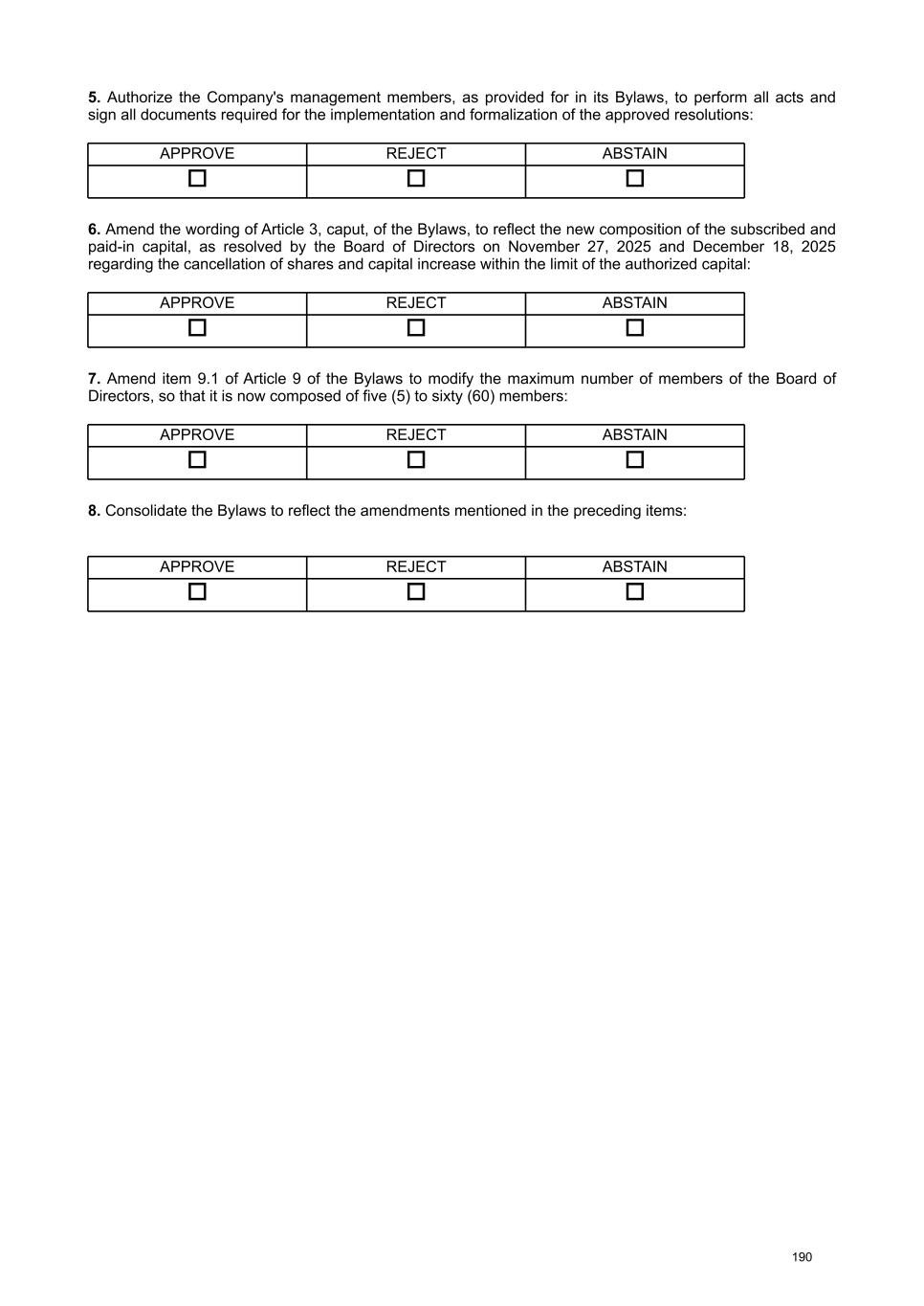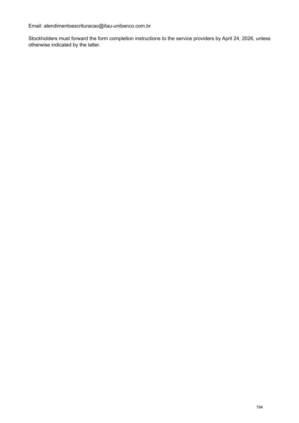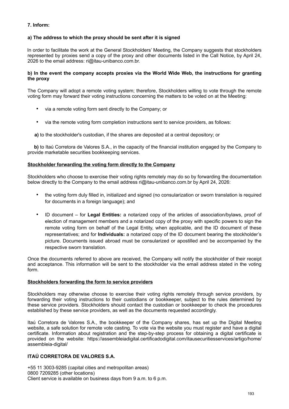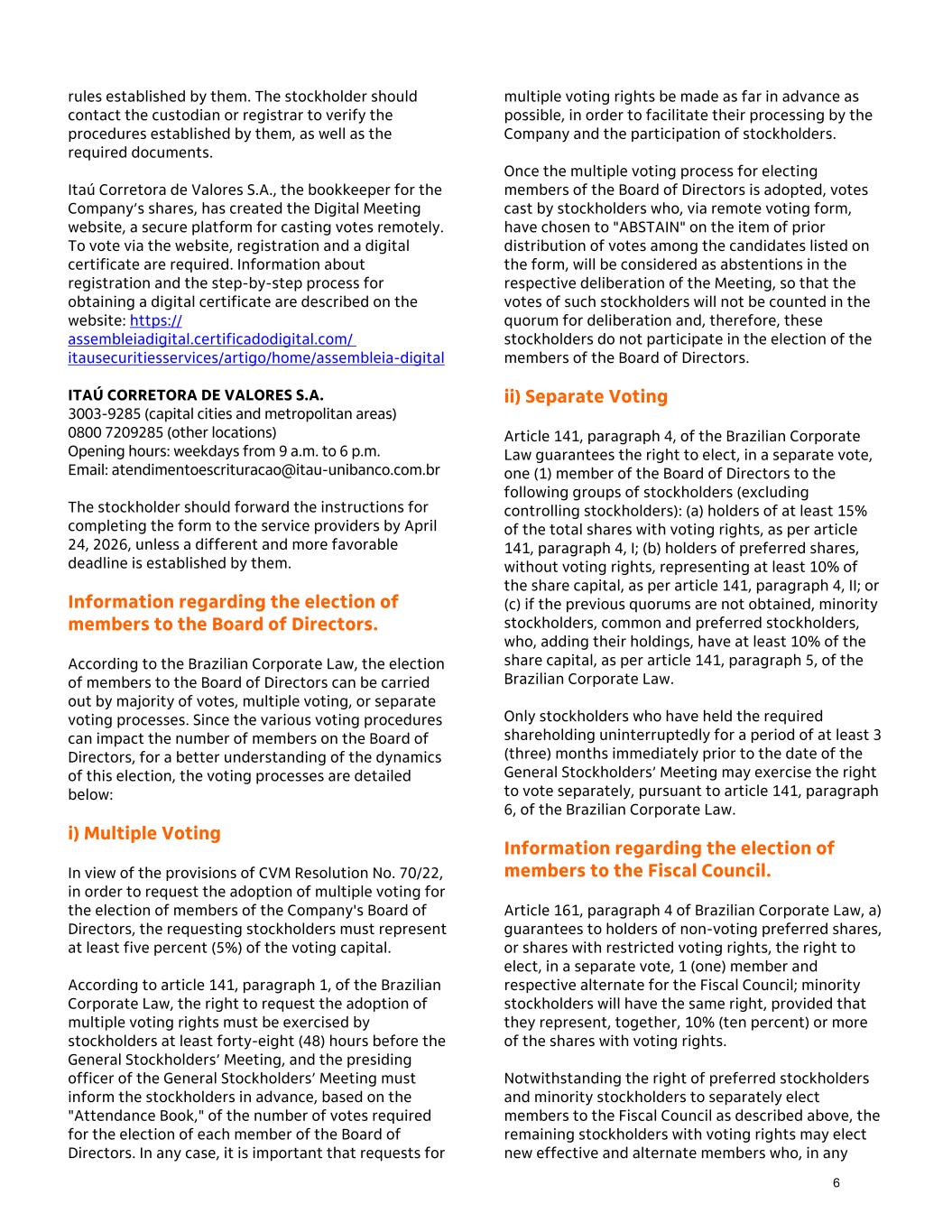 rules established by them. The stockholder should contact the custodian or registrar to verify the procedures established by them, as well as the required documents. Itaú Corretora de Valores S.A., the bookkeeper for the Company’s shares, has created the Digital Meeting website, a secure platform for casting votes remotely. To vote via the website, registration and a digital certificate are required. Information about registration and the step-by-step process for obtaining a digital certificate are described on the website: https:// assembleiadigital.certificadodigital.com/ itausecuritiesservices/artigo/home/assembleia-digital ITAÚ CORRETORA DE VALORES S.A. 3003-9285 (capital cities and metropolitan areas) 0800 7209285 (other locations) Opening hours: weekdays from 9 a.m. to 6 p.m. Email: atendimentoescrituracao@itau-unibanco.com.br The stockholder should forward the instructions for completing the form to the service providers by April 24, 2026, unless a different and more favorable deadline is established by them. Information regarding the election of members to the Board of Directors. According to the Brazilian Corporate Law, the election of members to the Board of Directors can be carried out by majority of votes, multiple voting, or separate voting processes. Since the various voting procedures can impact the number of members on the Board of Directors, for a better understanding of the dynamics of this election, the voting processes are detailed below: i) Multiple Voting In view of the provisions of CVM Resolution No. 70/22, in order to request the adoption of multiple voting for the election of members of the Company's Board of Directors, the requesting stockholders must represent at least five percent (5%) of the voting capital. According to article 141, paragraph 1, of the Brazilian Corporate Law, the right to request the adoption of multiple voting rights must be exercised by stockholders at least forty-eight (48) hours before the General Stockholders’ Meeting, and the presiding officer of the General Stockholders’ Meeting must inform the stockholders in advance, based on the "Attendance Book," of the number of votes required for the election of each member of the Board of Directors. In any case, it is important that requests for multiple voting rights be made as far in advance as possible, in order to facilitate their processing by the Company and the participation of stockholders. Once the multiple voting process for electing members of the Board of Directors is adopted, votes cast by stockholders who, via remote voting form, have chosen to "ABSTAIN" on the item of prior distribution of votes among the candidates listed on the form, will be considered as abstentions in the respective deliberation of the Meeting, so that the votes of such stockholders will not be counted in the quorum for deliberation and, therefore, these stockholders do not participate in the election of the members of the Board of Directors. ii) Separate Voting Article 141, paragraph 4, of the Brazilian Corporate Law guarantees the right to elect, in a separate vote, one (1) member of the Board of Directors to the following groups of stockholders (excluding controlling stockholders): (a) holders of at least 15% of the total shares with voting rights, as per article 141, paragraph 4, I; (b) holders of preferred shares, without voting rights, representing at least 10% of the share capital, as per article 141, paragraph 4, II; or (c) if the previous quorums are not obtained, minority stockholders, common and preferred stockholders, who, adding their holdings, have at least 10% of the share capital, as per article 141, paragraph 5, of the Brazilian Corporate Law. Only stockholders who have held the required shareholding uninterruptedly for a period of at least 3 (three) months immediately prior to the date of the General Stockholders’ Meeting may exercise the right to vote separately, pursuant to article 141, paragraph 6, of the Brazilian Corporate Law. Information regarding the election of members to the Fiscal Council. Article 161, paragraph 4 of Brazilian Corporate Law, a) guarantees to holders of non-voting preferred shares, or shares with restricted voting rights, the right to elect, in a separate vote, 1 (one) member and respective alternate for the Fiscal Council; minority stockholders will have the same right, provided that they represent, together, 10% (ten percent) or more of the shares with voting rights. Notwithstanding the right of preferred stockholders and minority stockholders to separately elect members to the Fiscal Council as described above, the remaining stockholders with voting rights may elect new effective and alternate members who, in any 6